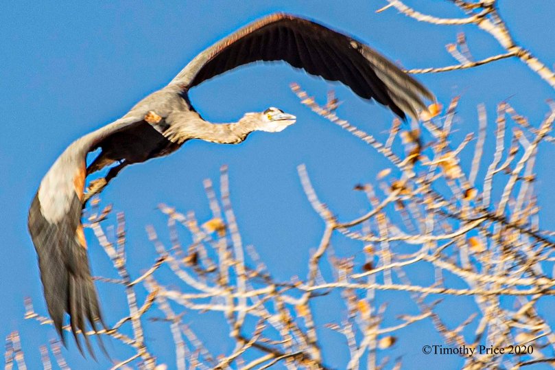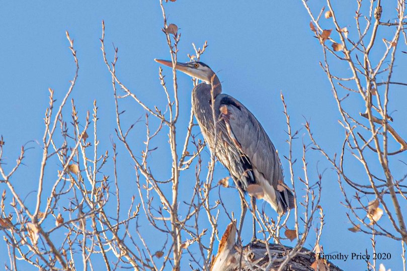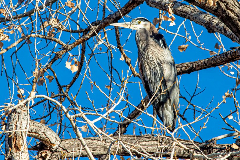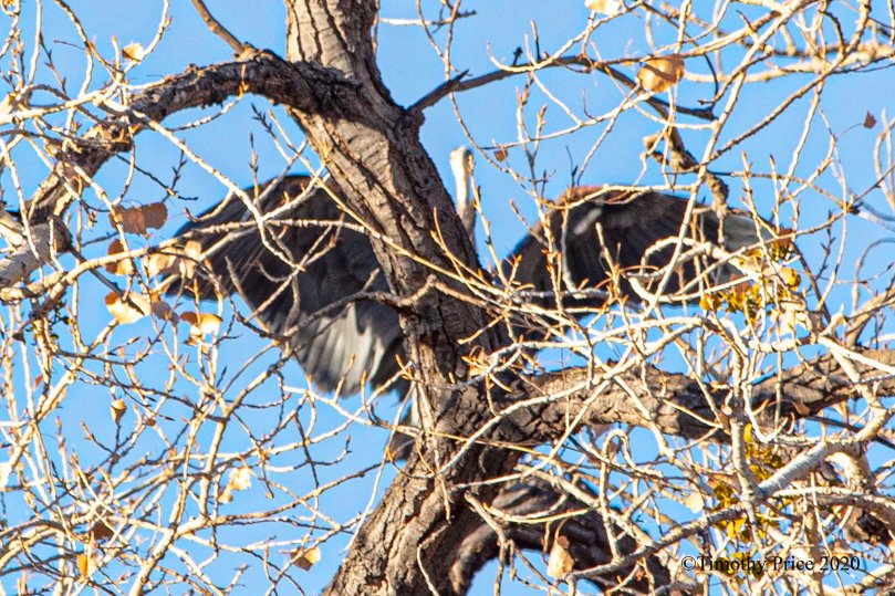 The Pterodactyl was sunbathing in a cottonwood and took a flight when he got tired of the paparazzo photographing him. He landed on another cottonwood across the ditch. No sooner than he settled in, another Pterodactyl flew in a took his place.
