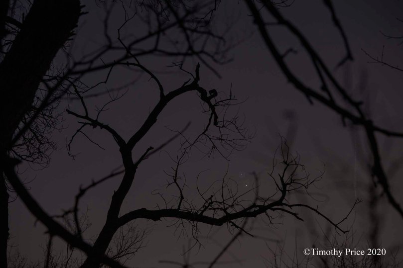 Saturn & Jupiter in the Tangle Heart Tree. I had to get way back into the wilds of the dark bosque with coyotes and chupacabras nipping at my heels to get the shot.