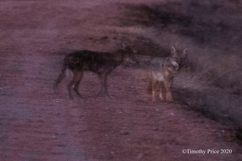 There were two of them and they paid little attention to me even though we were close to each other. After I lightened up the photo, I could see the coyote on the left had a bad case of mange.
