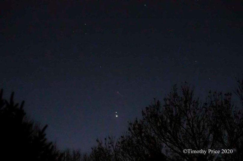1. Tonight just with the naked eye they appeared really close together, but a tiny amount of separation could be seen. It seemed like there were “star beams” and now I am wondering if that may have been light from the moons. I guess I will plan to go out tomorrow and Monday with a camera. But even tonight it looked spectacular to a naked eye.