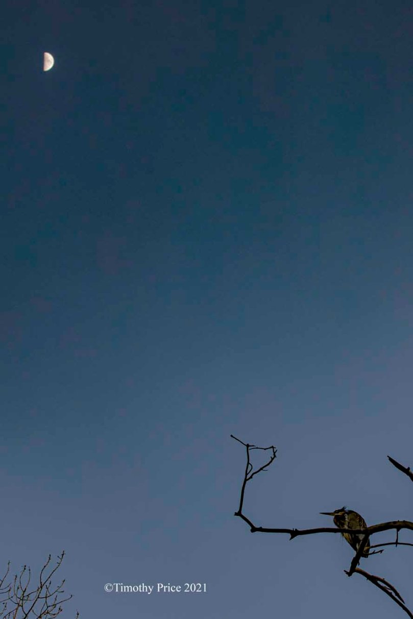 • Hi Lavinia. No telescope. It’s a 400mm ƒ/4 lens that is equivalent to a 640mm lens on my Canon 7D MkII body. All the closeup shots of the GBH, the owls, canes, and the moon are taken with that lens. All handheld after sunset.