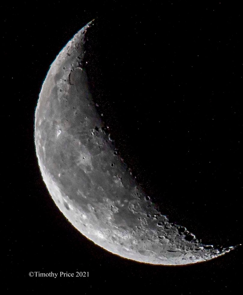 A quarter moon with Swiss crater-style cheese, please. 25.4% waning crescent February 6, 2021.