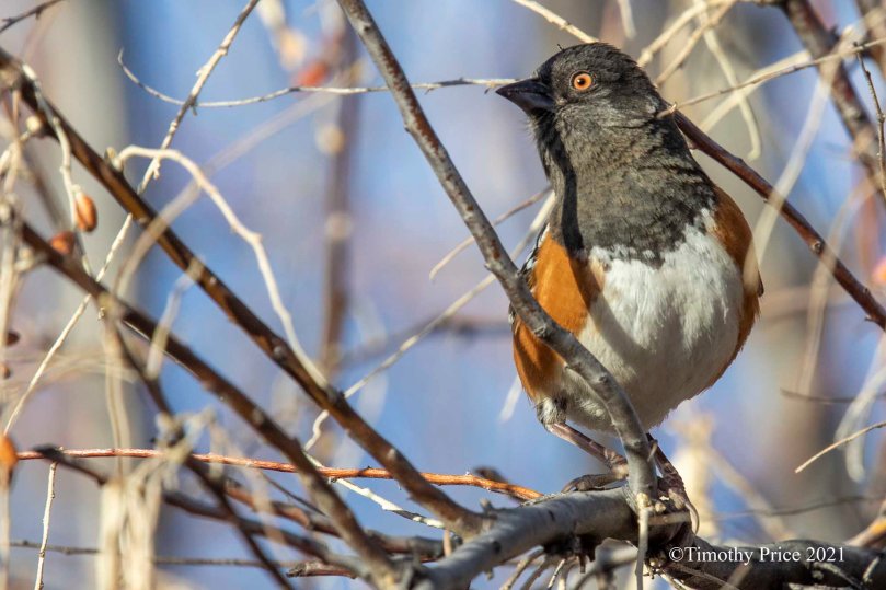 Tommee Towhee was hopping from branch to branch having Russian olives for breakfast.