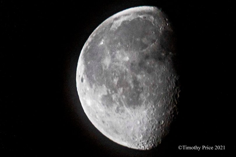 A quarter moon with Swiss crater-style cheese, please. 25.4% waning crescent February 6, 2021.