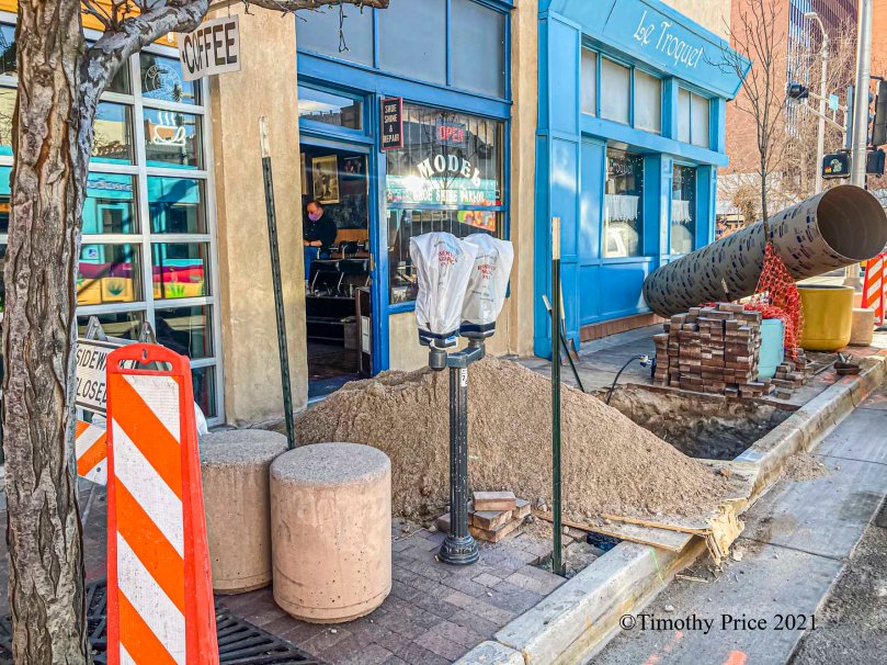 A Verizon cell tower is on the horizon where a streetlight used to stand in front of Model Shoe Shine Parlor two doors west of our office in downtown Albuquerque. Contractors removed the streetlight, pulled up the bricks in the sidewalk, dug a deep hole, put a 36 inch by about 12 feet long sono tube (concrete form) into the hole with rebar and conduit for wiring, and filled the sono tube with concrete. I did not have time to go out and get photos of the sono tube filled with concrete. One worker told me it took three yards of concrete to fill the sono tube. It takes a deep foundation to support a cell tower.