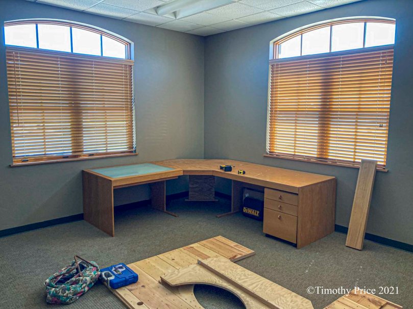 Intermission: My desk we moved from the office downtown to the new office. I build the desk in 1990. That is a light table on the left-hand side I used for sorting slides and transparencies before digital cameras. The desk on the floor is Dede’s desk that she designed and I built for her in 2007, I believe. it will go in the corner to the right of my desk. I will build Bruce’s desk in the corner to the left of my desk.