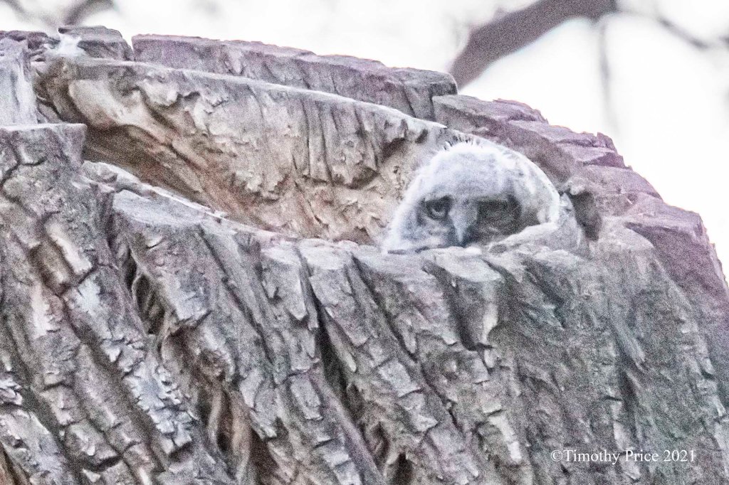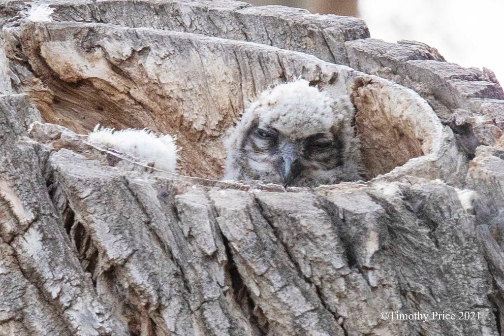 That little fuzzy head in the darkness is Mama Owl’s and Daddy Owl’s new owlet sticking its head up for the first time to say “Hello world!” I was talking to Jim between calling the owlet and taking photos, and Jim asked “Why don’t they stick their heads up when it’s light?” I told him that owls like darkness.