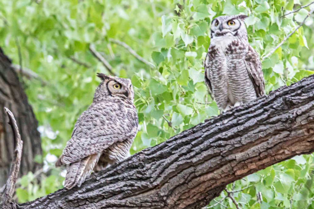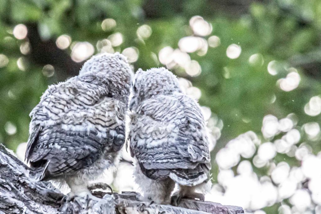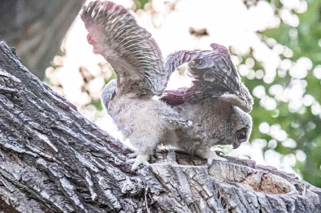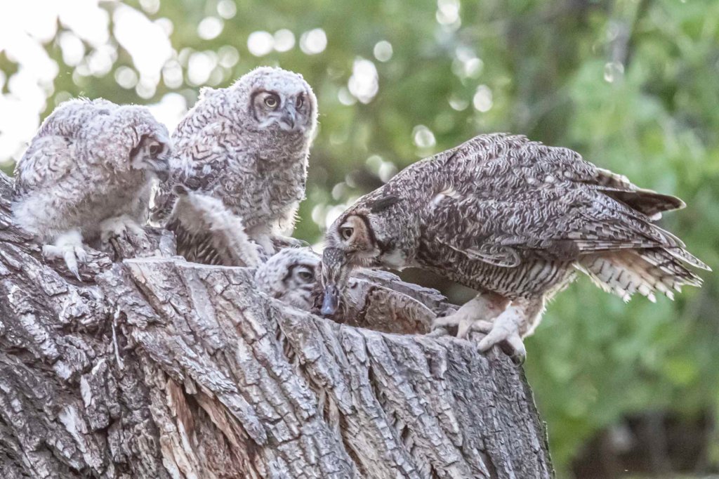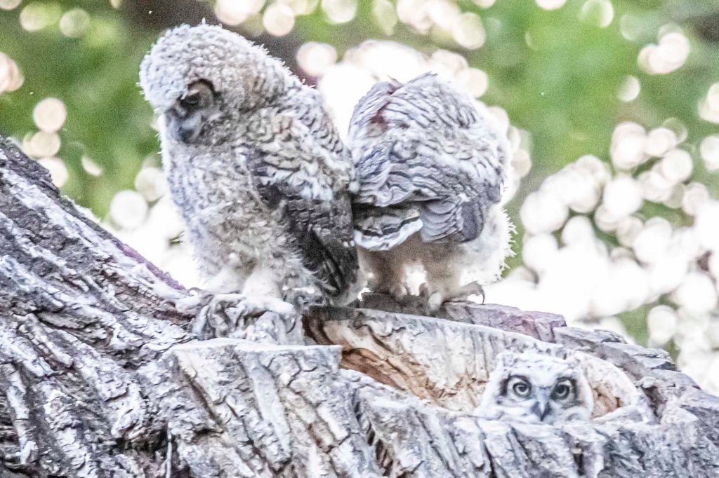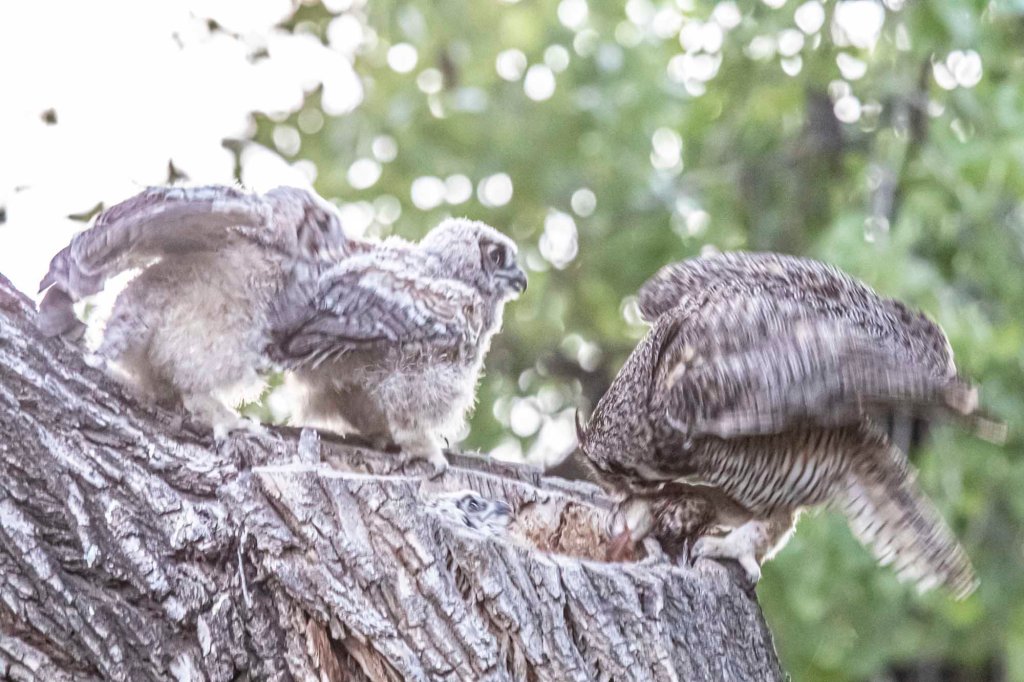 All three owlets got out of the nest tonight. Sleepy finally got out but then fell back into the nest. Daddy Owl caught and something and brought it to Mama Owl. They tore it apart and then Mama Owl flew it over to the owlets and fed them. Dinner turned out to be a duck. It got too dark to get decent photos of the whole feeding, but Mama Owl tore pieces of the portion of the duck she had, gave the smaller pieces to Major Tom Peepers and Mona Lisa, and the largest portion to Sleepy. Sleepy is the runt, and Mama Owl is taking extra care of him. Since it’s late, I put the photos in a gallery that you can click on and have a slide show of the owlets getting out of the nest and the feeding.