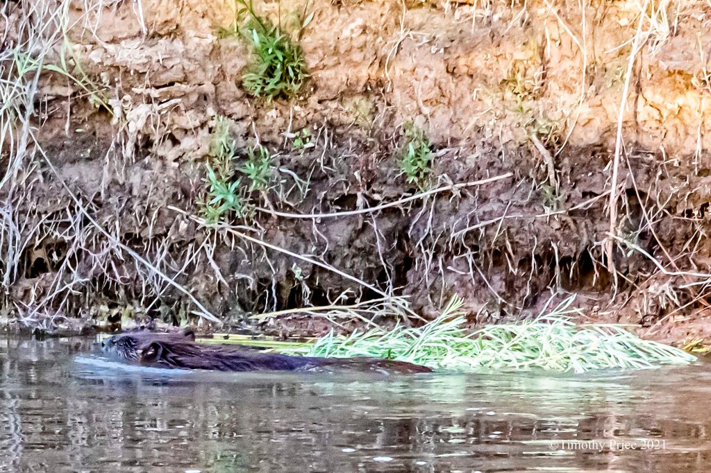 • Hi Brian. One of our ditch bank neighbors was telling us she never sees the beavers. We told her to walk down to Beaver Point with us. We got the the edge of the river and while we were watching a couple of beavers across the river like in these photos, one snuck up right in front of her and splashed. Scared the living daylights out of her. We saw five different beavers that night and she got the full beaver experience. Last night a young couple we see on the ditch often walked out to Beaver Point with us, and that was the first time they had seen beavers. I was yelling at the beavers trying to get them to slap for the couple, but they ignored my pleas until canoeists came paddling down the river and we got 3 good slaps one right after another.