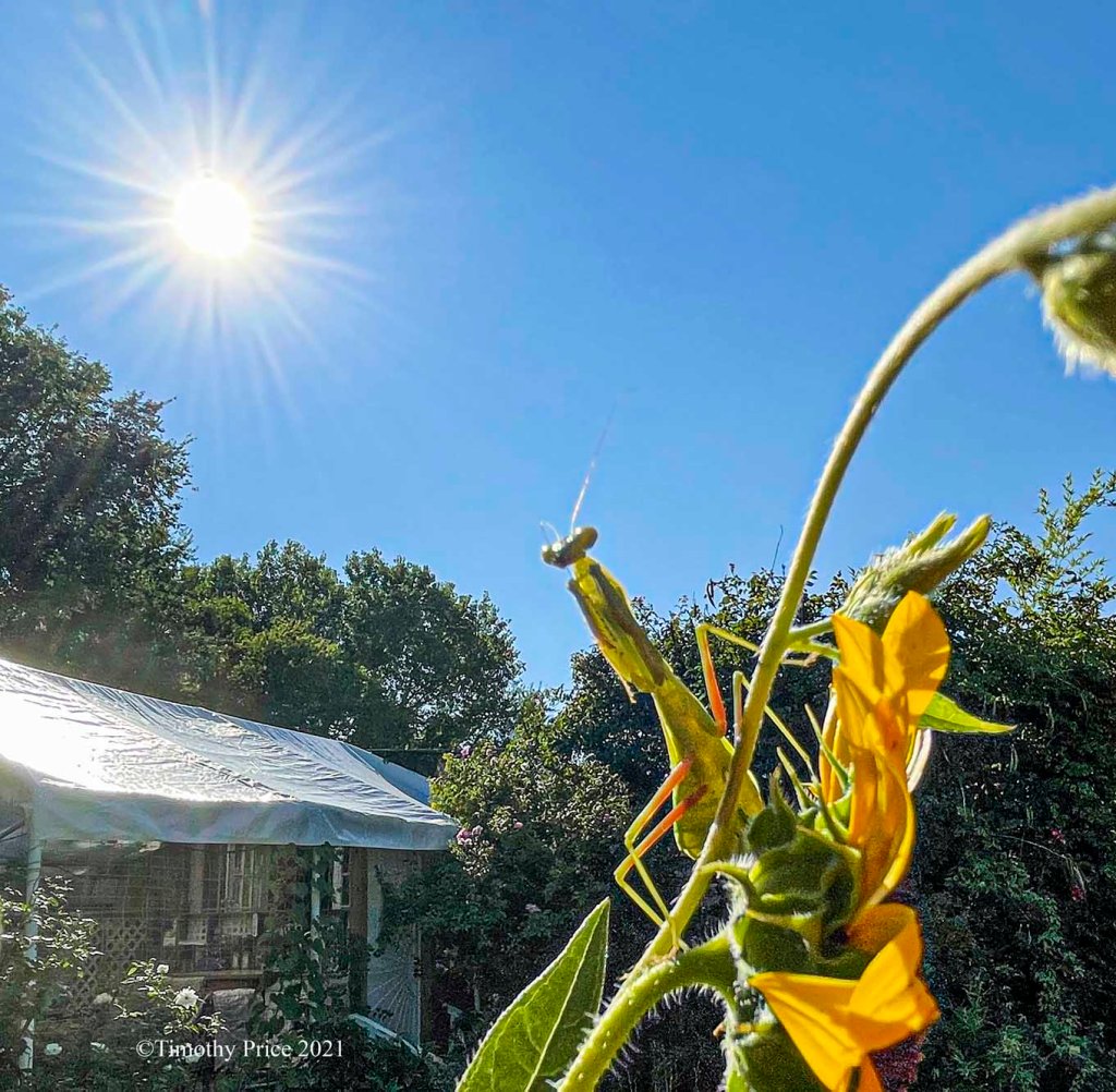 Miss Mantis hitched I ride on me as I made my way from the car to the house through our sunflower forest. I felt something walking around on the back of my arm giving me little love pinches. After I put down a load of books, my briefcase and some framed pictures I was taking inside, I looked at my arm, and there was Miss Mantis enjoying the ride. I put her on a plant on the deck until I got everything put away. I walked back out to the plant, and she was there waiting. I put out my hand, she hopped onto it and I took her out to a sunflower where she was a very good model. I didn’t want to leave her in the plants on the deck because the cats would get her. I had to rescue a praying mantis from the kittens few nights ago.