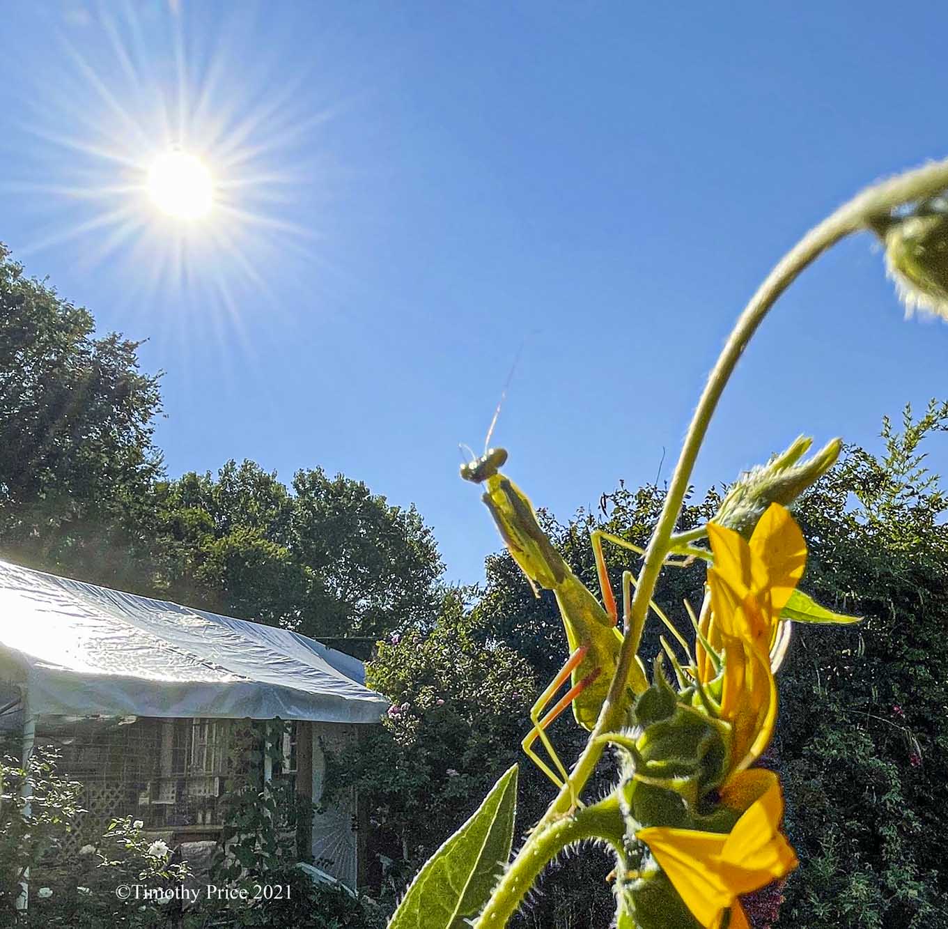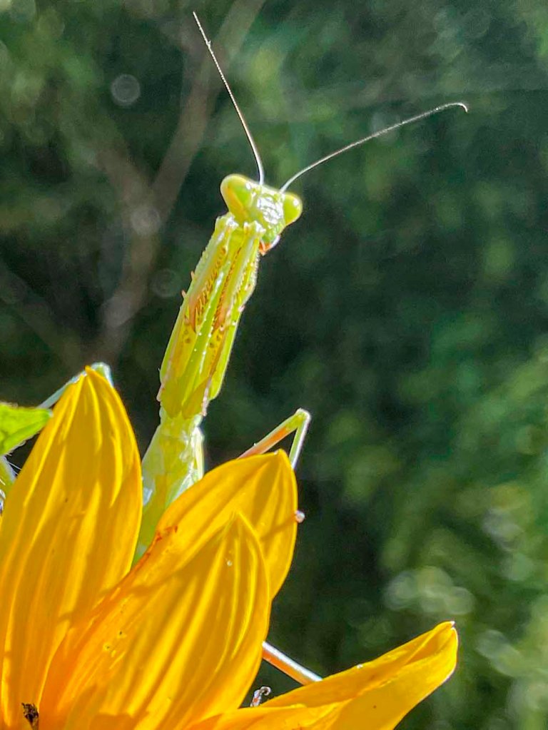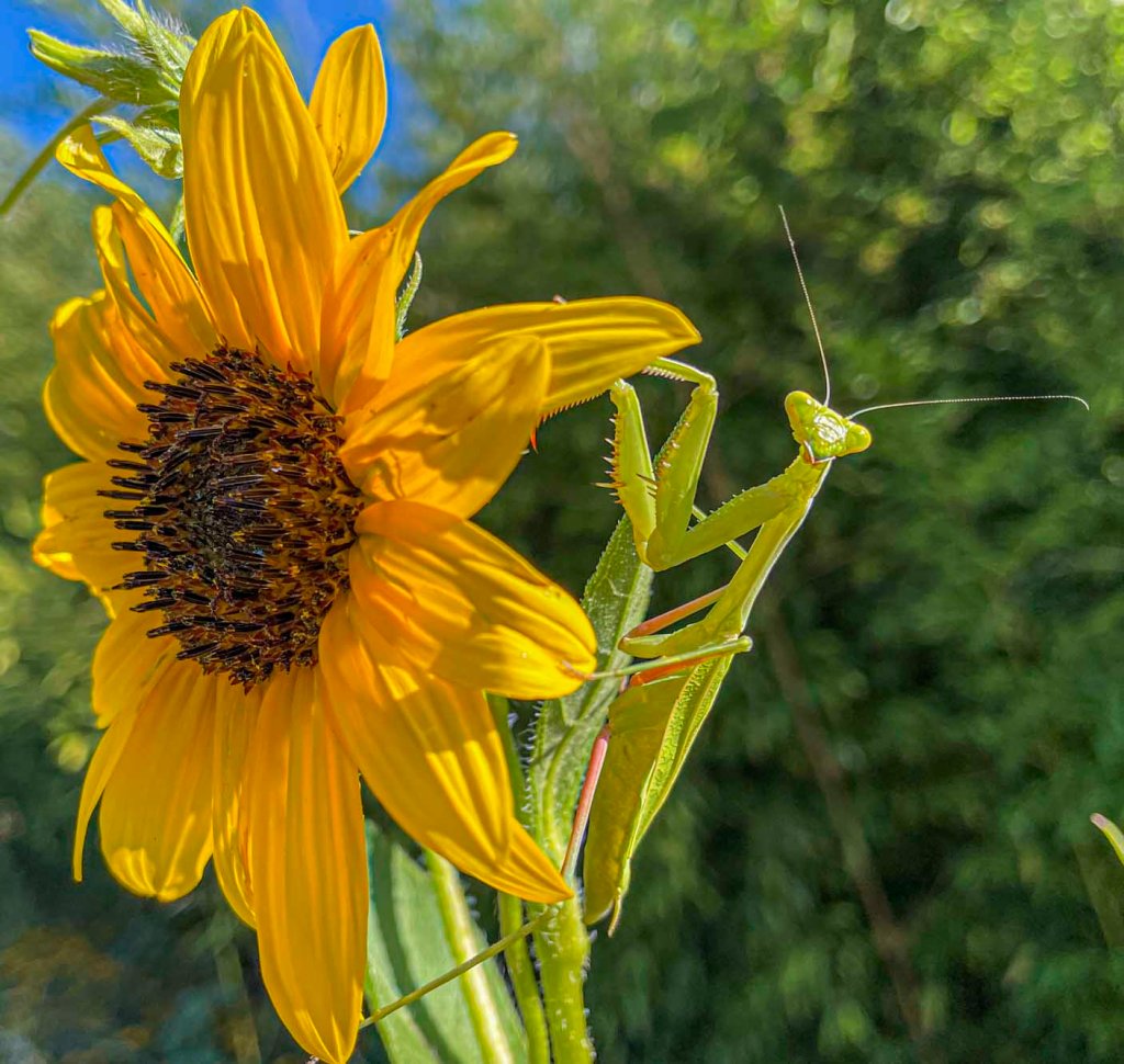 Miss Mantis hitched I ride on me as I made my way from the car to the house through our sunflower forest. I felt something walking around on the back of my arm giving me little love pinches. After I put down a load of books, my briefcase and some framed pictures I was taking inside, I looked at my arm, and there was Miss Mantis enjoying the ride. I put her on a plant on the deck until I got everything put away. I walked back out to the plant, and she was there waiting. I put out my hand, she hopped onto it and I took her out to a sunflower where she was a very good model. I didn’t want to leave her in the plants on the deck because the cats would get her. I had to rescue a praying mantis from the kittens few nights ago.