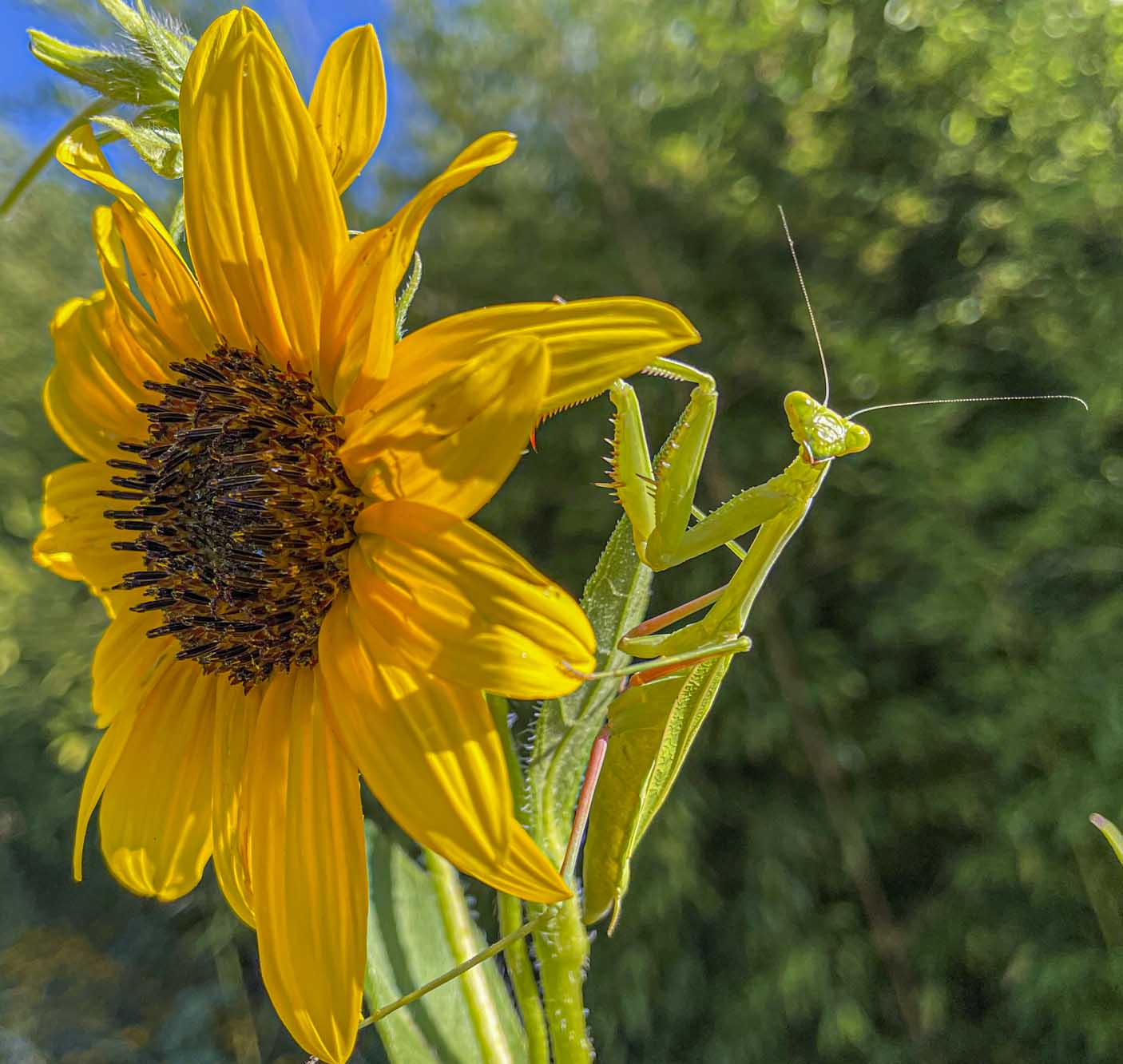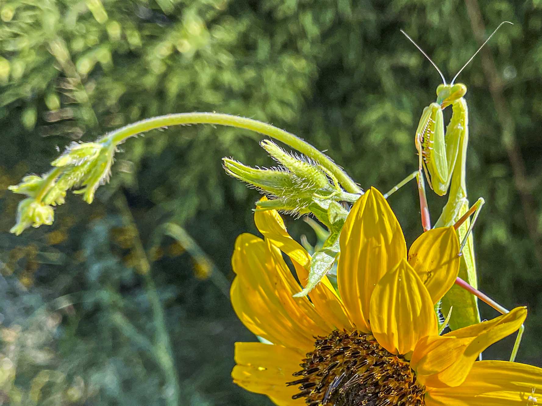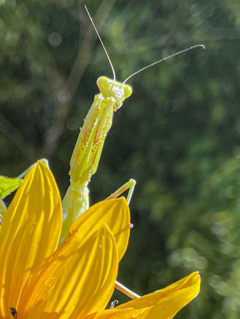 Miss Mantis hitched I ride on me as I made my way from the car to the house through our sunflower forest. I felt something walking around on the back of my arm giving me little love pinches. After I put down a load of books, my briefcase and some framed pictures I was taking inside, I looked at my arm, and there was Miss Mantis enjoying the ride. I put her on a plant on the deck until I got everything put away. I walked back out to the plant, and she was there waiting. I put out my hand, she hopped onto it and I took her out to a sunflower where she was a very good model. I didn’t want to leave her in the plants on the deck because the cats would get her. I had to rescue a praying mantis from the kittens few nights ago.