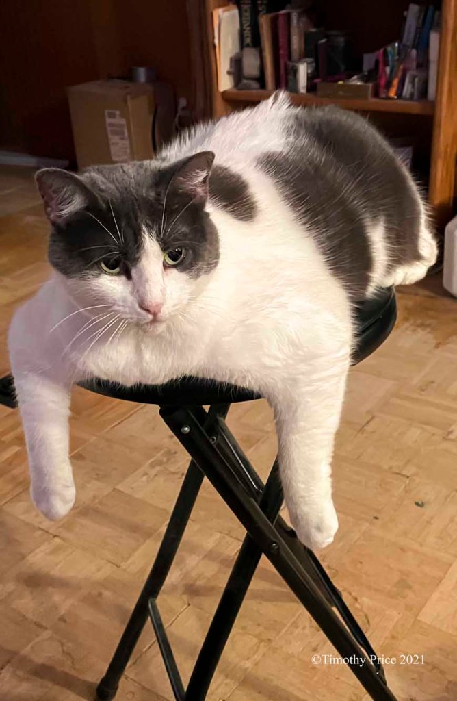 I brought my guitar stool out into the dance room for Laurie to try it out to see what height stool we needed to order for her to use at school. Sasha was really digging on it so I left it out for her to hangout on. But then Spunk couldn’t resist, and started eating the stool. So now there are several torn places on the seat. Spunk has to be one of the most destructive cats I have ever known.