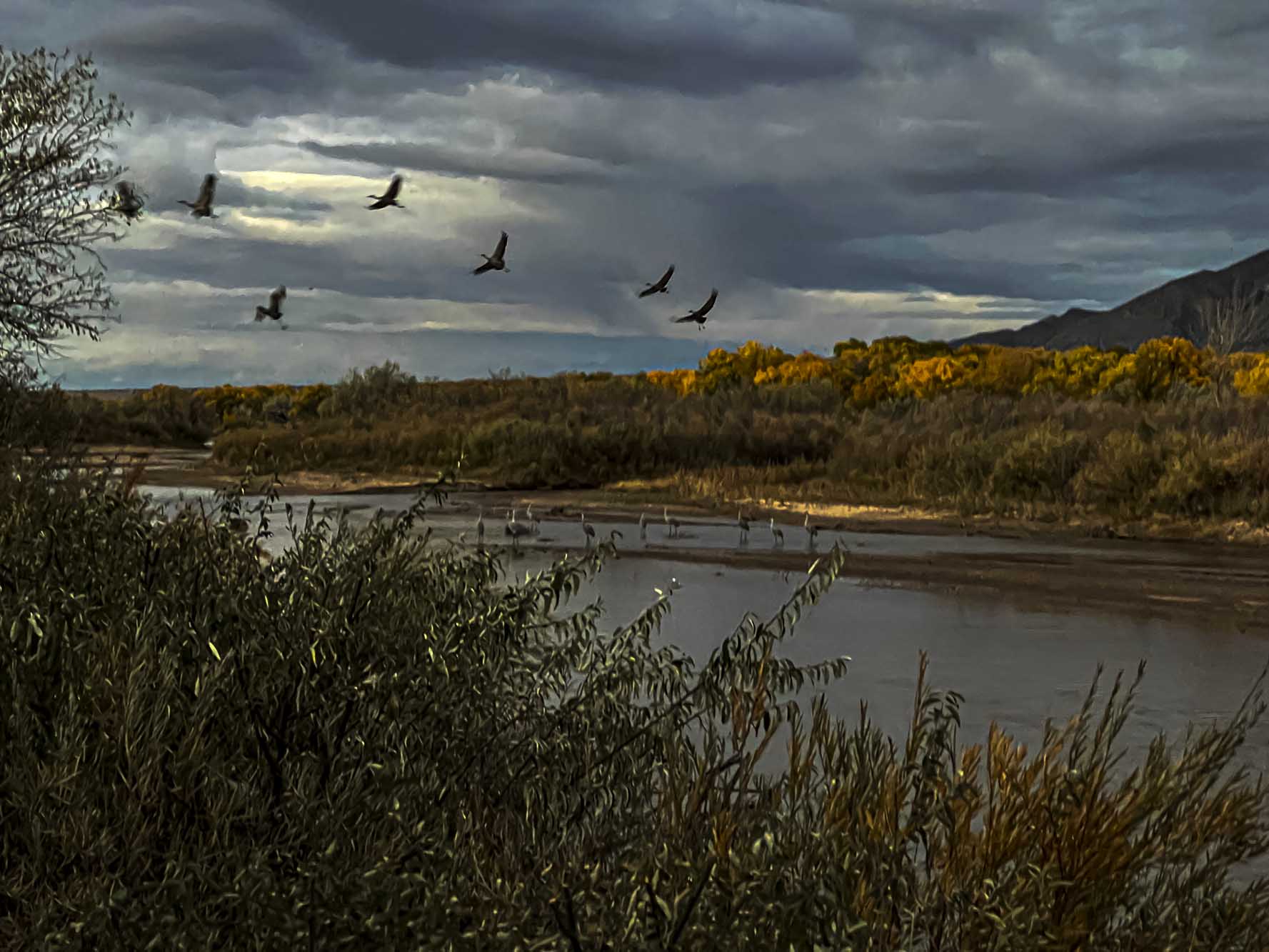 I ended up doing a lot of errands on the way home from work, and a lot of different chores after I got home this afternoon. The weather was clouds moving through, being pushed by high winds and the temperature had dropped significantly from yesterday. Well after sundown, facing wind and cold, I walked out to the river and got photos of the cranes in the darkness, the wild clouds, and the colors lingering in the dusk.