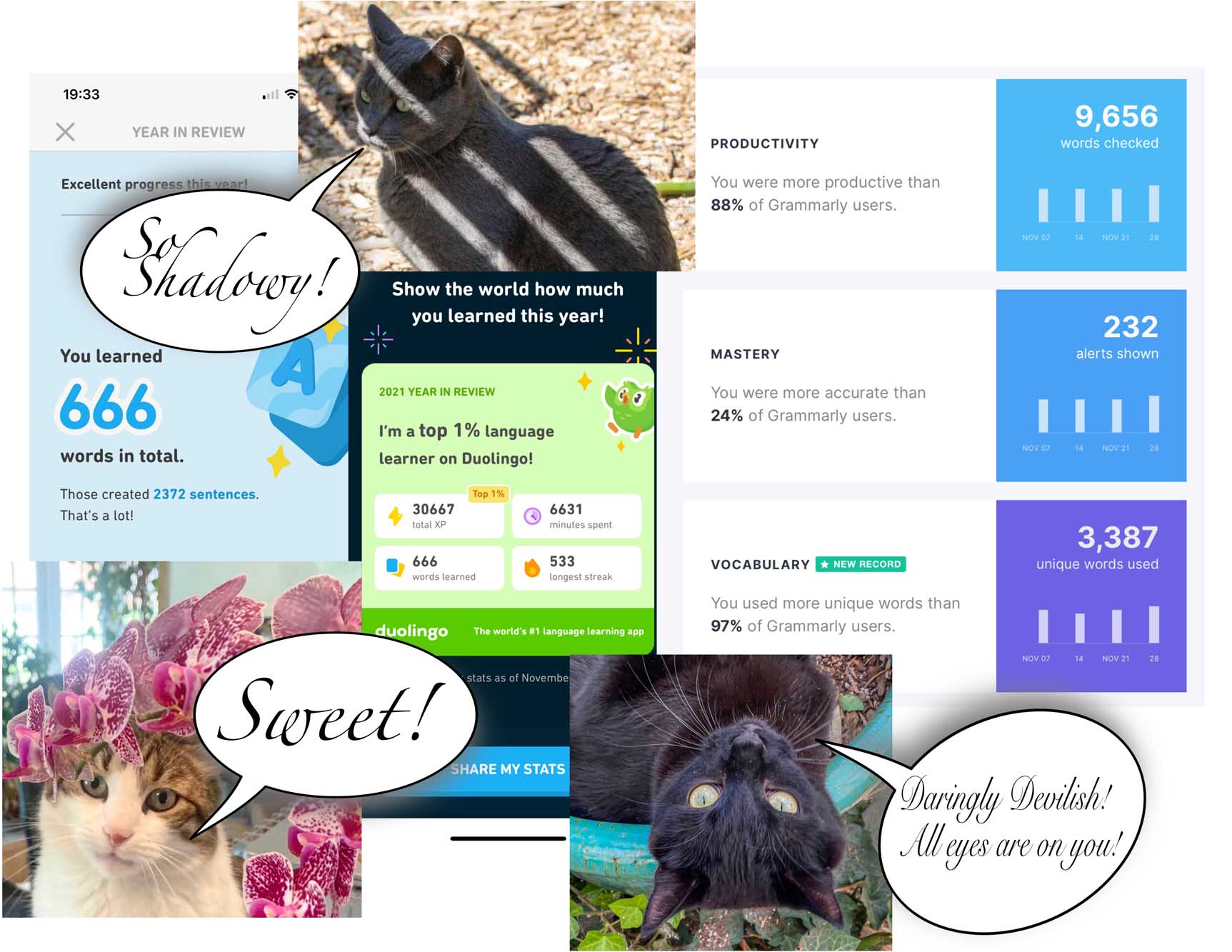 A collage of my Duolingo and Grammarly stats with comments by Silver, Spunk and Gwendolyn.