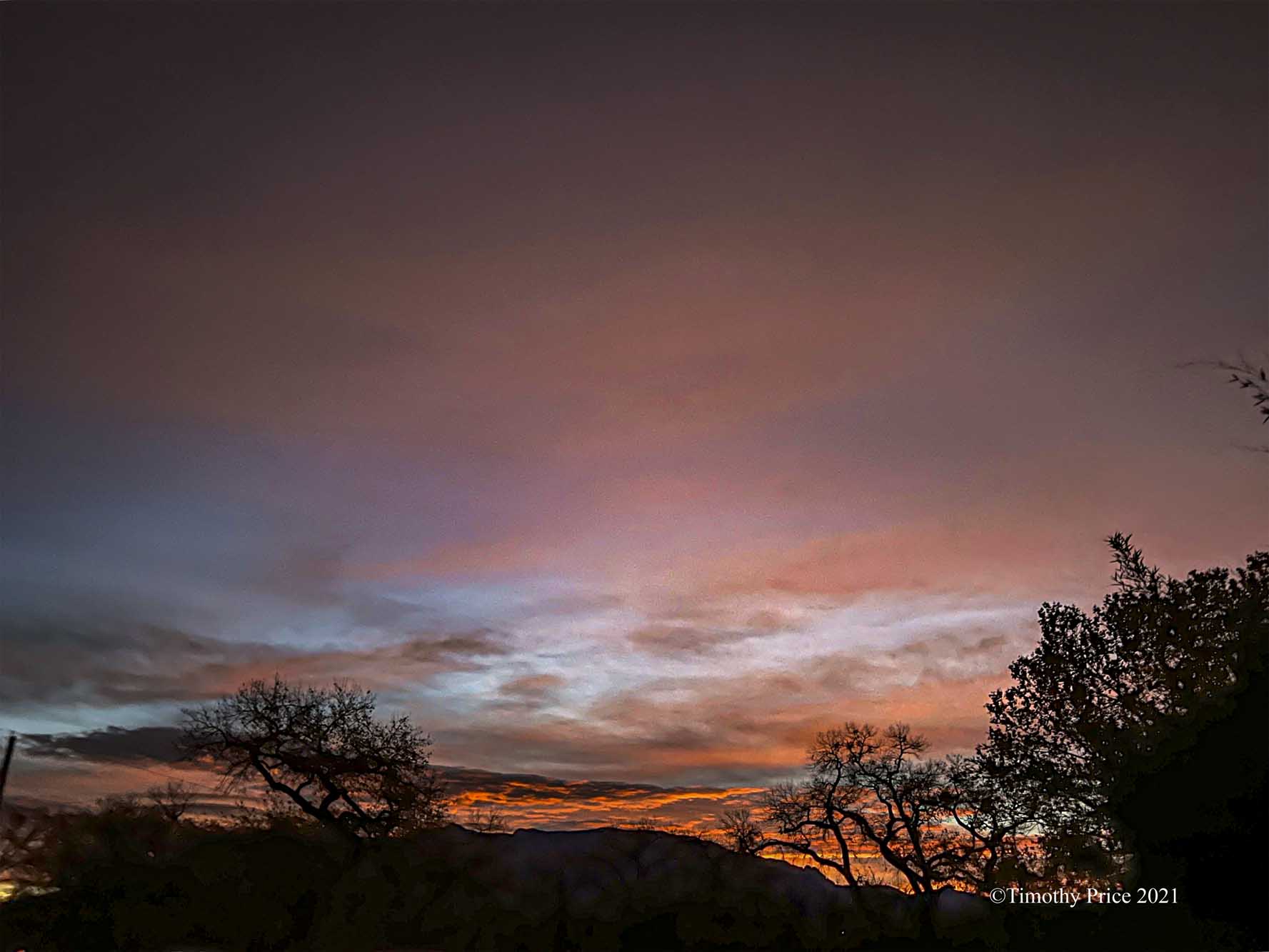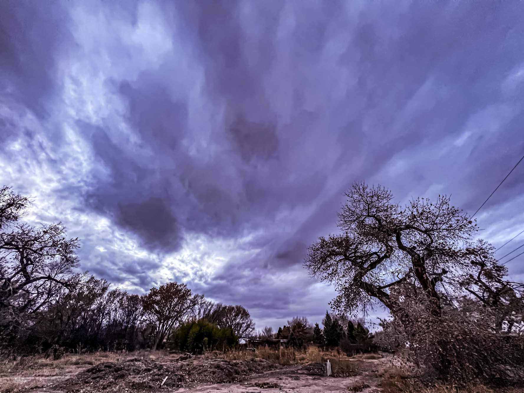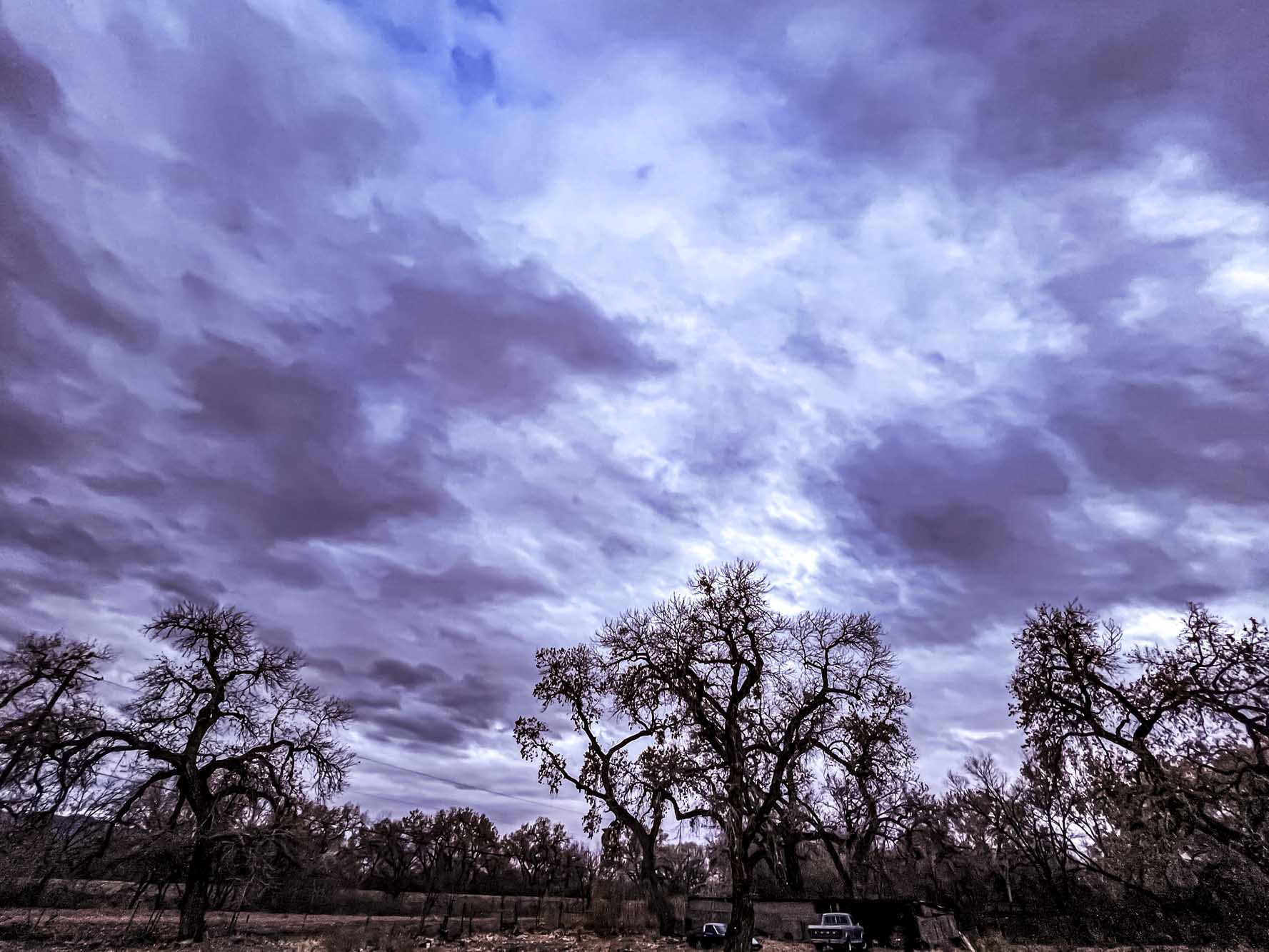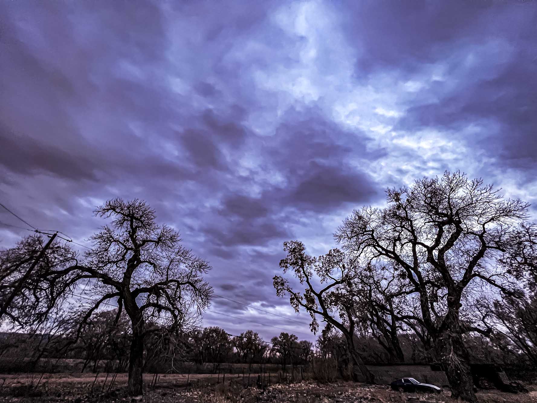 The painter was in a lavender mood tonight as gnarly clouds rolled in at sunset and were well hung hanging over gnarly trees.