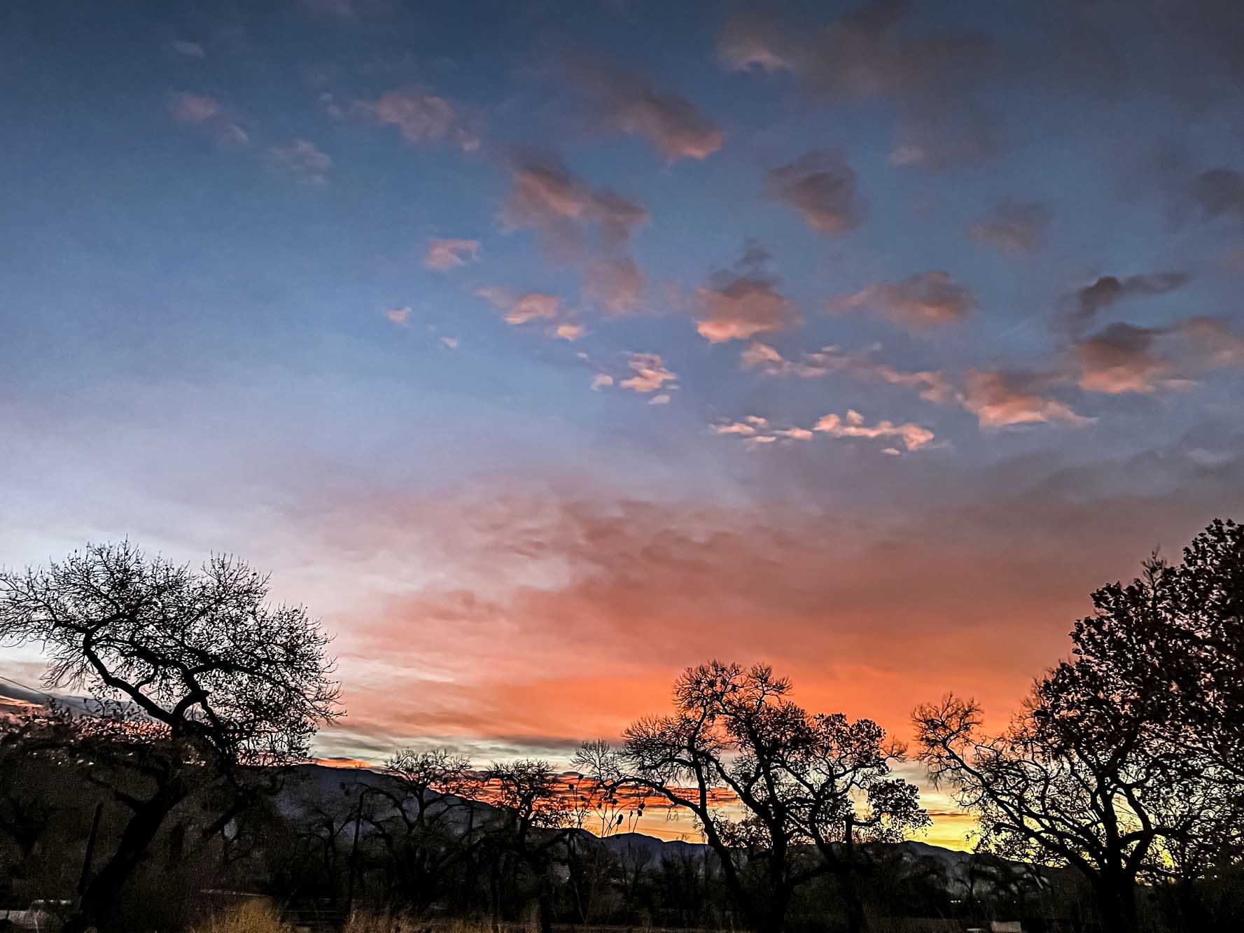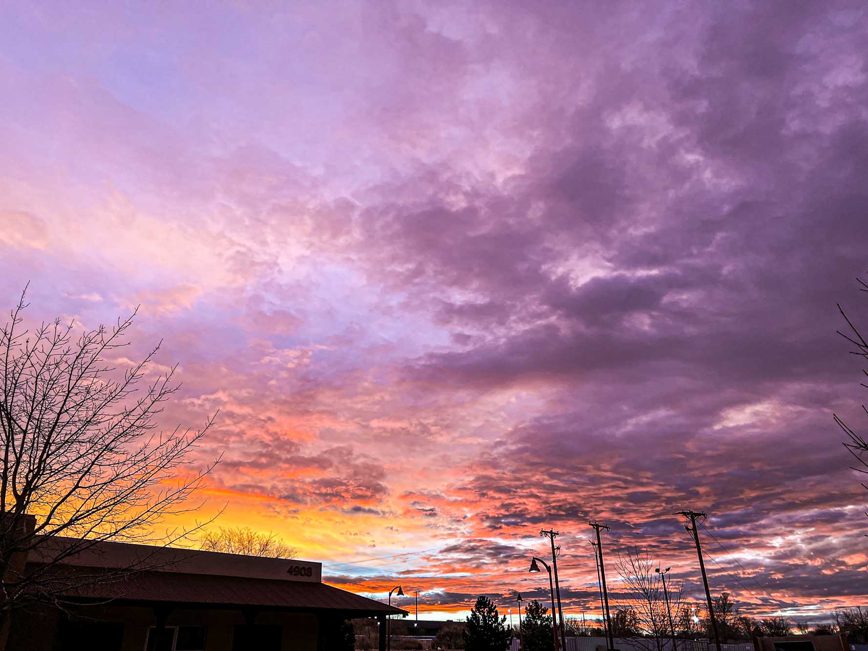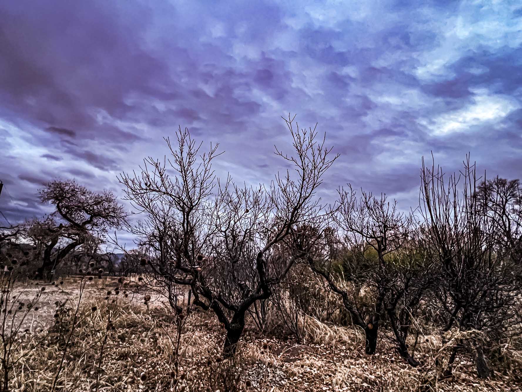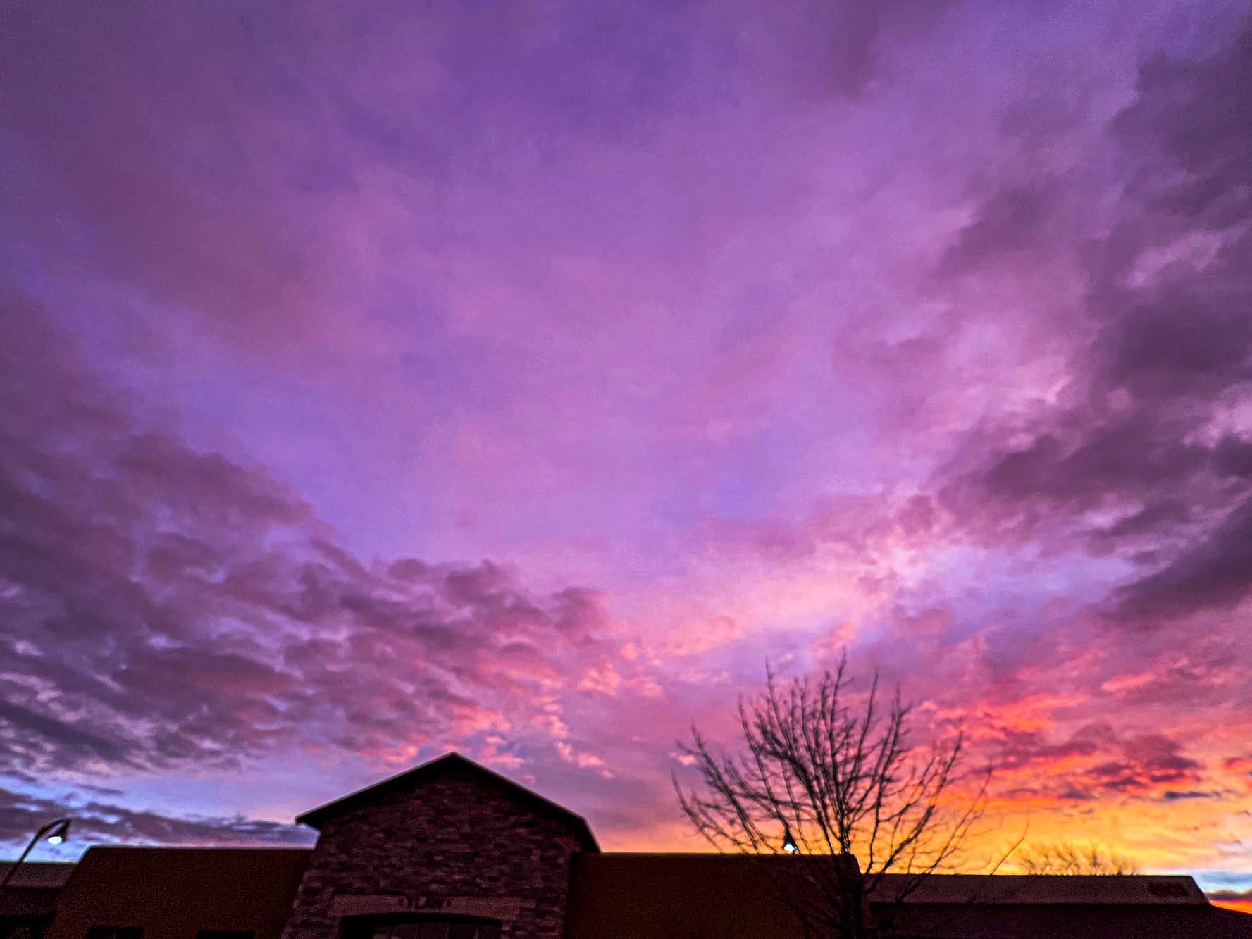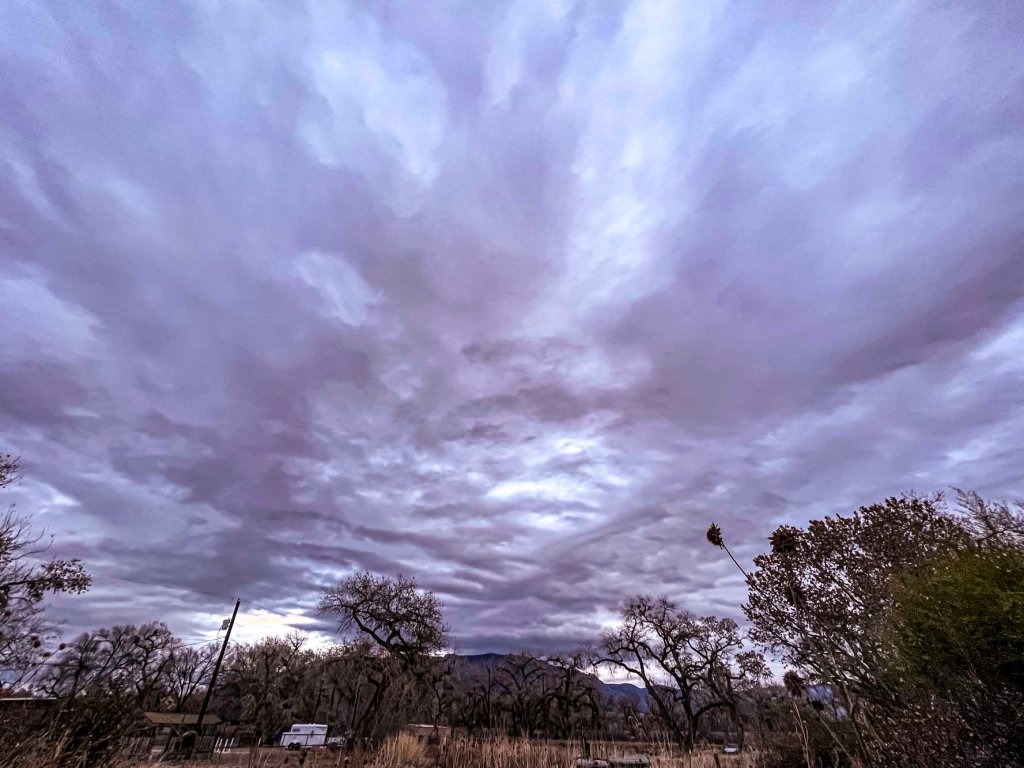 The painter was in a lavender mood tonight as gnarly clouds rolled in at sunset and were well hung hanging over gnarly trees.