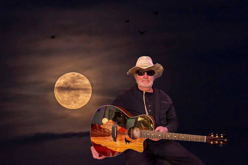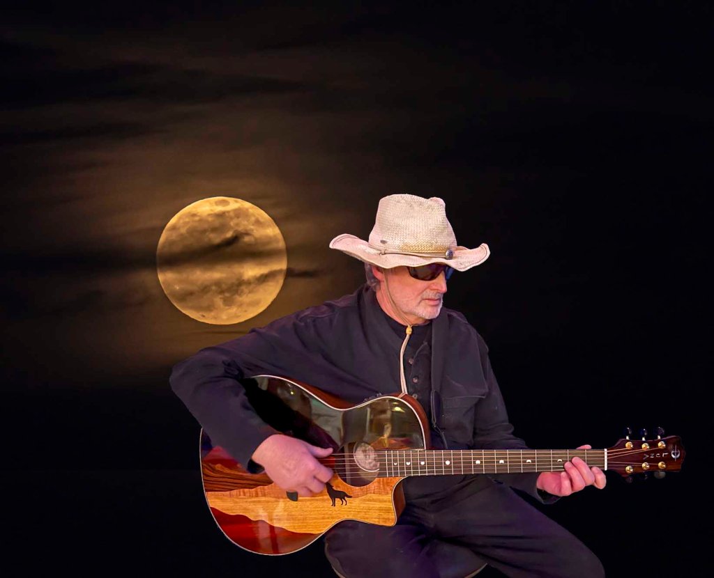 The Lobo Lunatic playing the Luna Wolf Guitar with the Wolf Moon rising behind him.