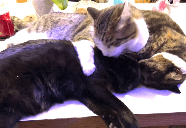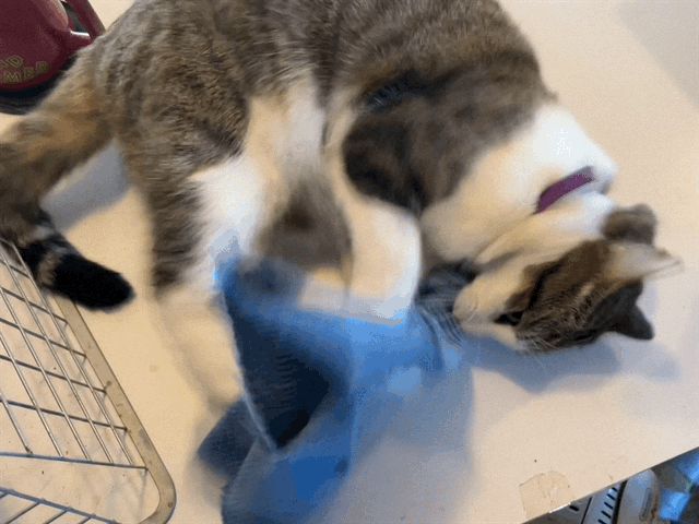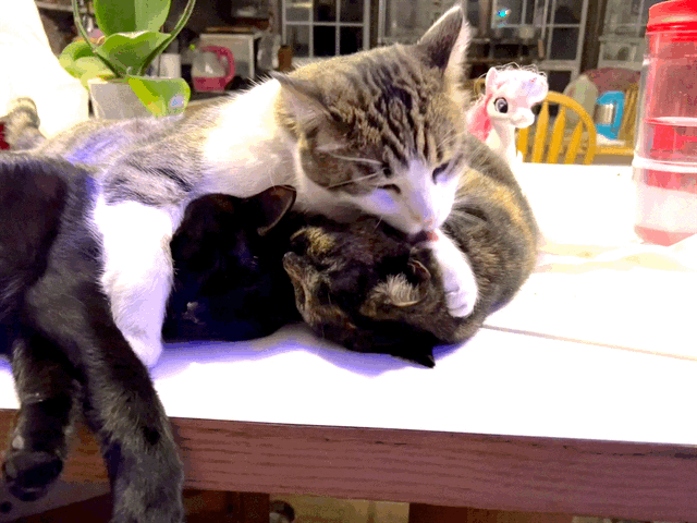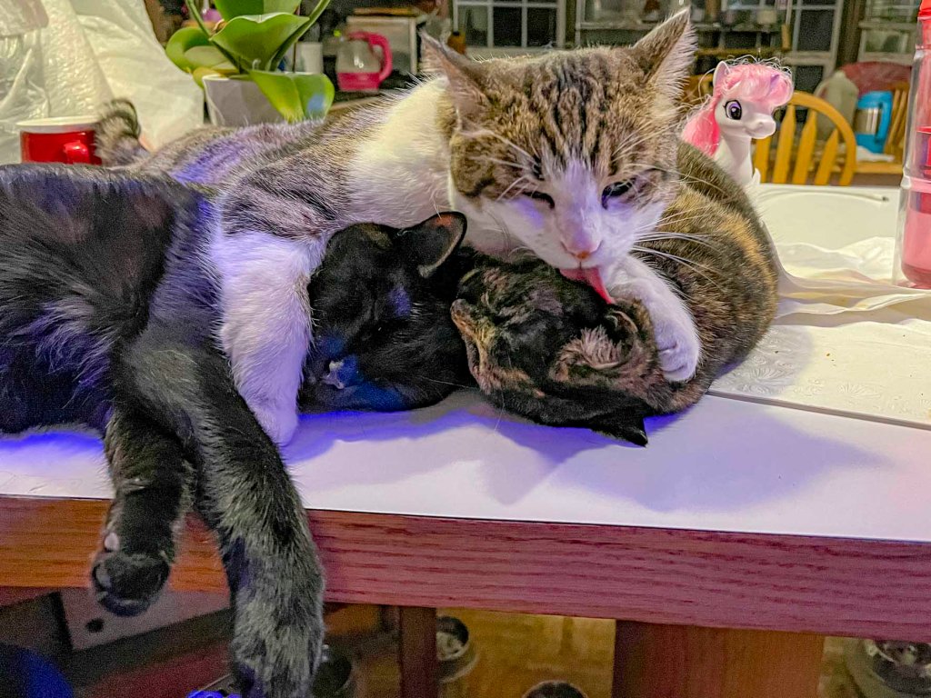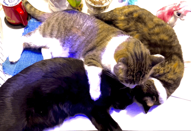 Turbo Spunk January 21, 2022 Timothy Price86 Comments The vet suggested I put a pheromone collar on Spunk to help calm him down. A calmer Spunk! He has a good destructive rhythm Although he is being sweeter to the other cats. Here’s Spunk holding down Glenda and Marble and licking them.