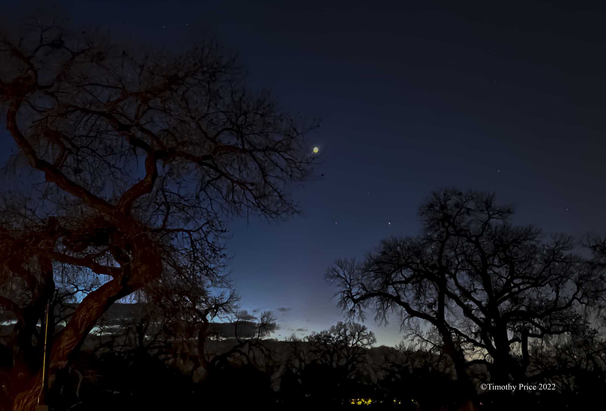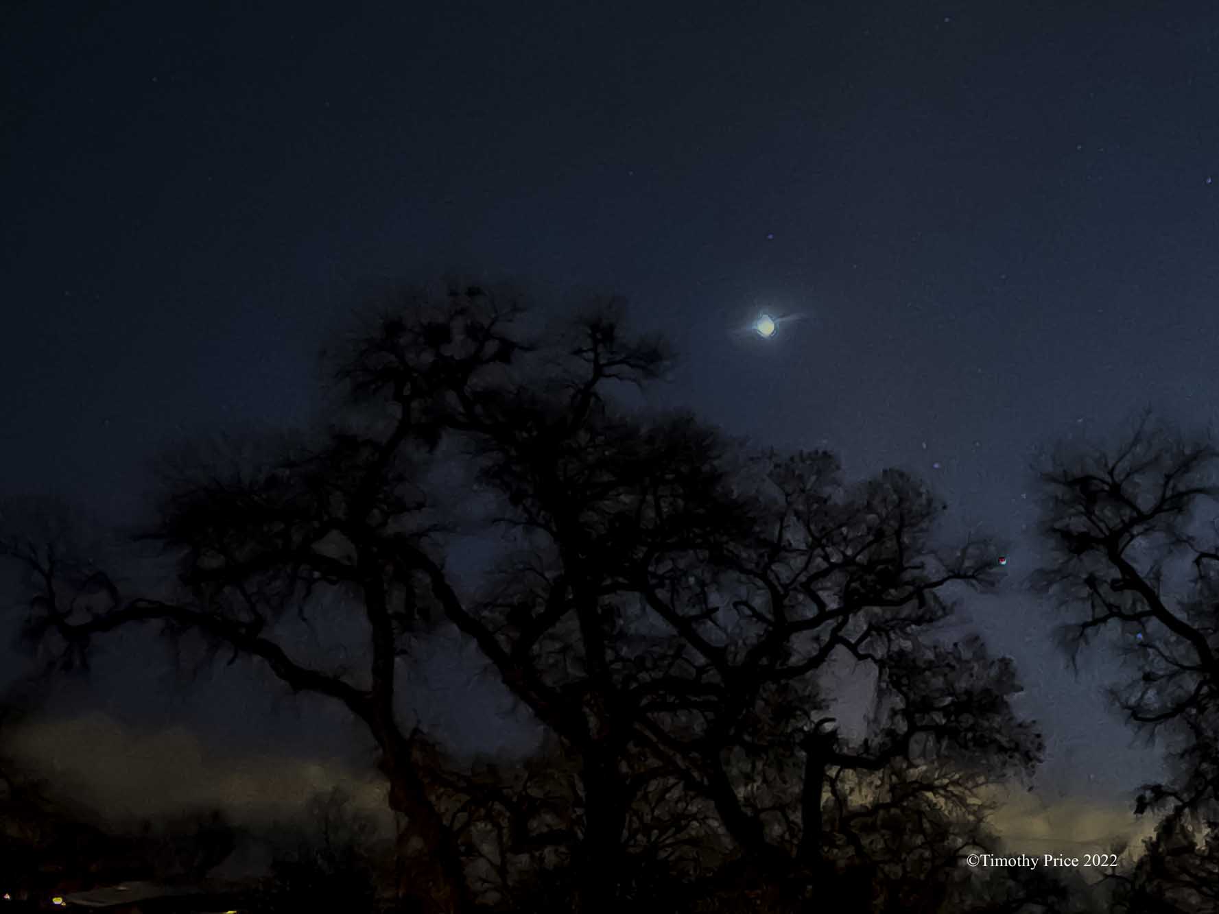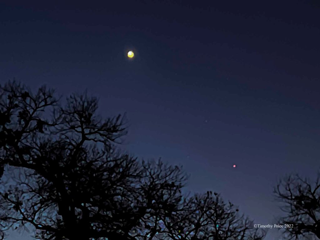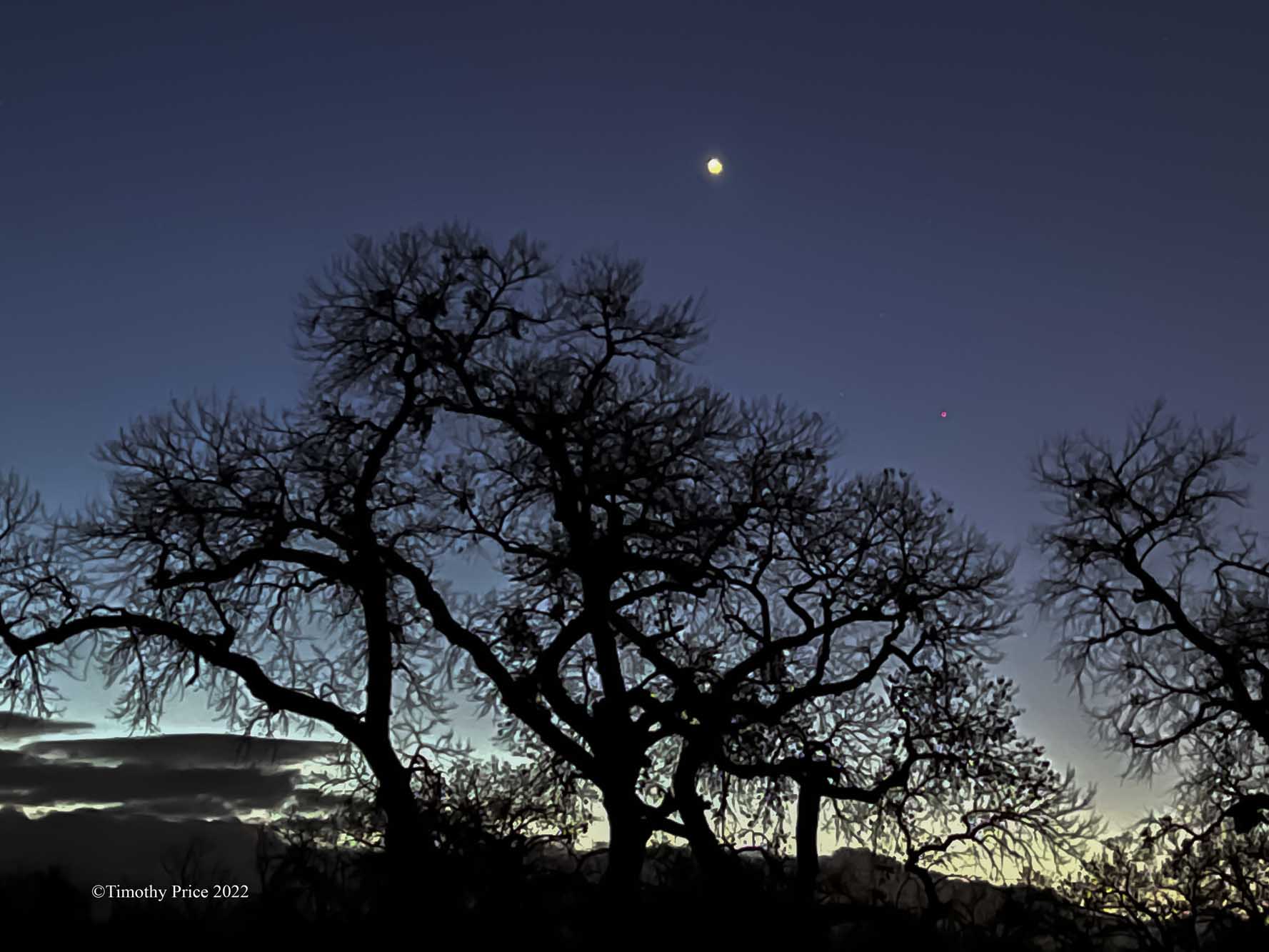 About 15 minutes later, Venus was on the edge of Resa’s Tree and Mars was to the left above Gigi’s tree.