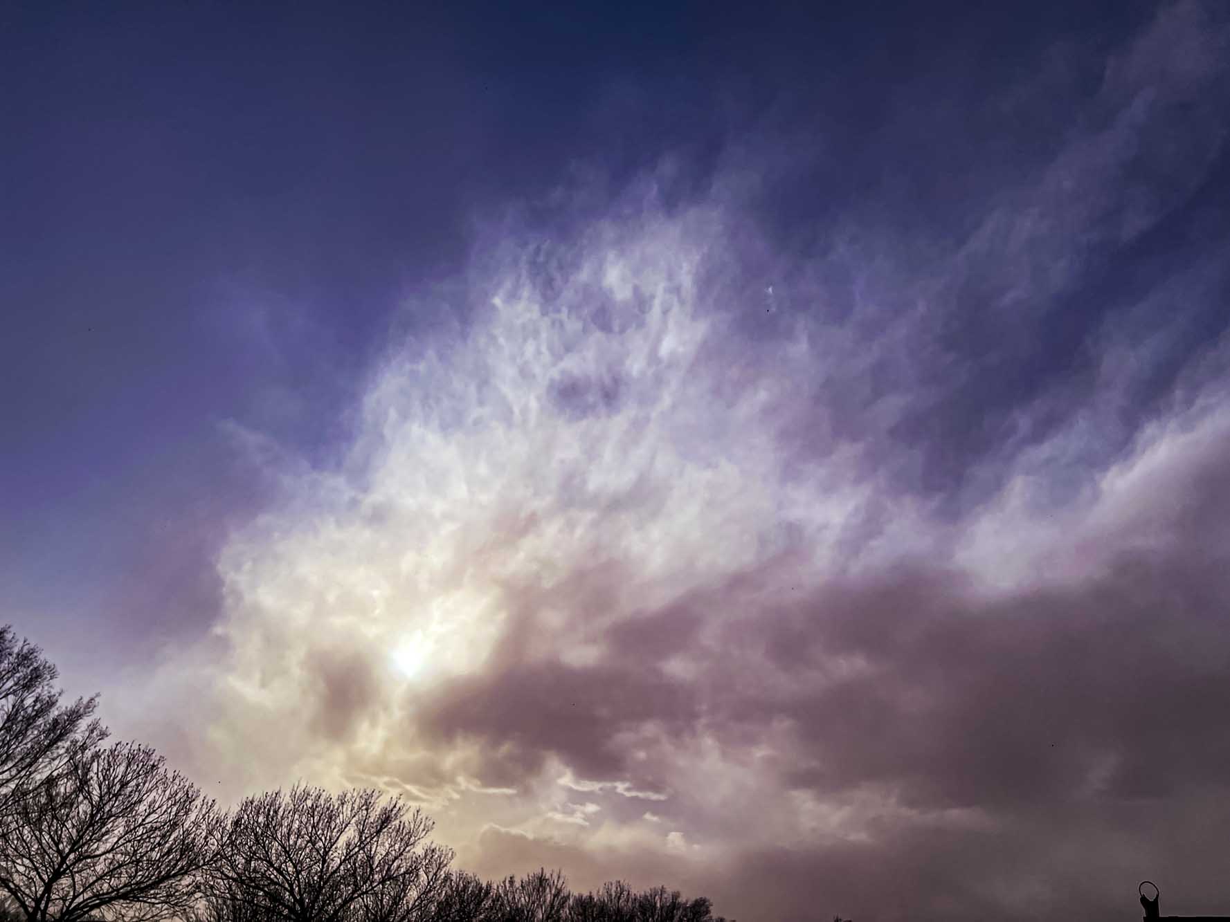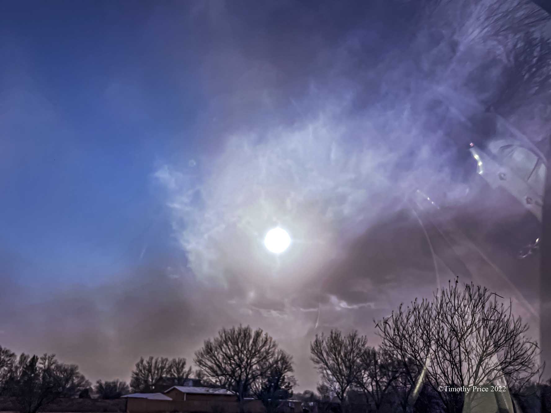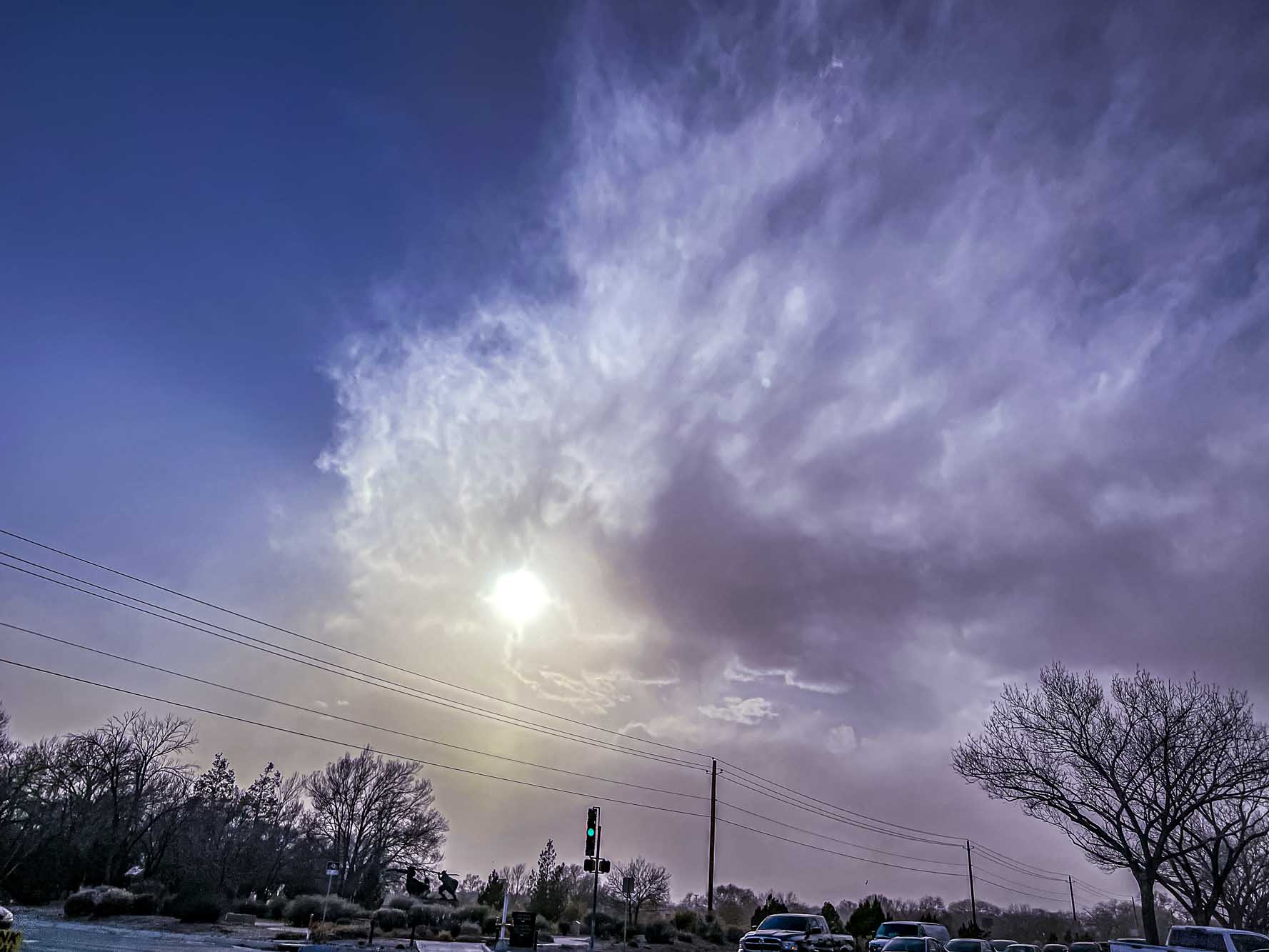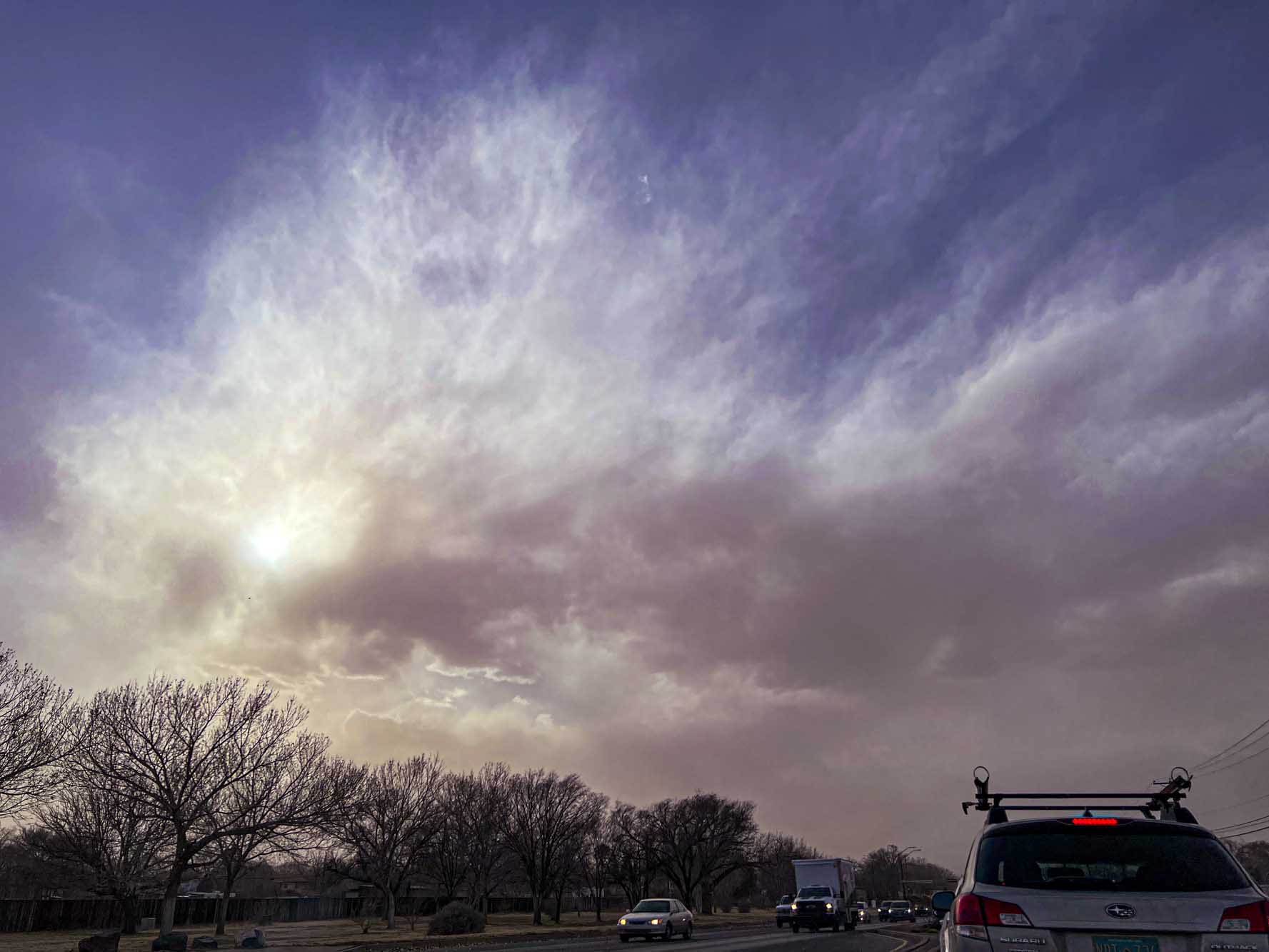 The forecast was for rain between 2:00 am and 5:00 am, clearing after sunrise with winds in the afternoon. They got the clearing after sunrise and winds right. We didn’t get a drop of rain that I could tell. On my way home at 4:15 pm, the dust made clouds that obscured the sun.