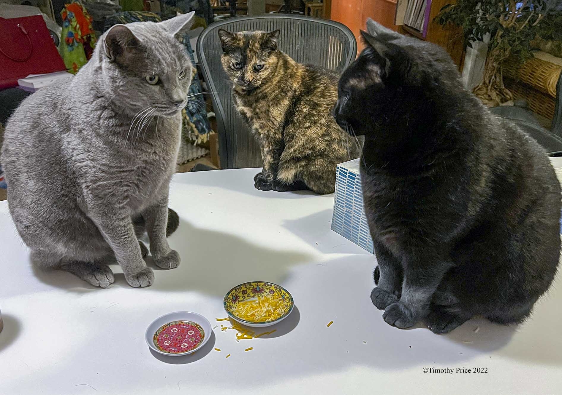 Silver, Loki, and Marble were having a standoff over a dish of cheese this morning.