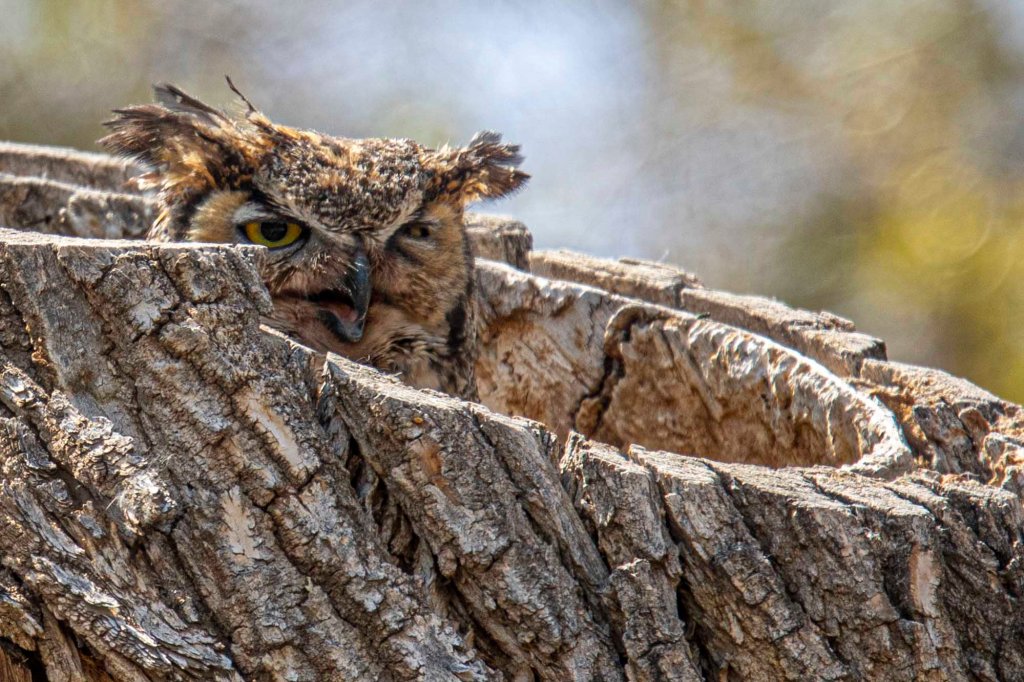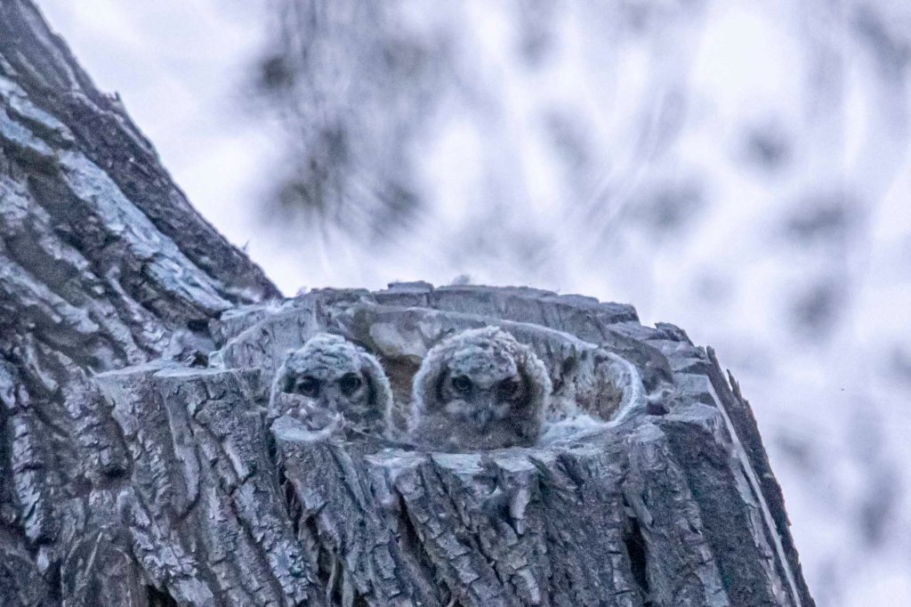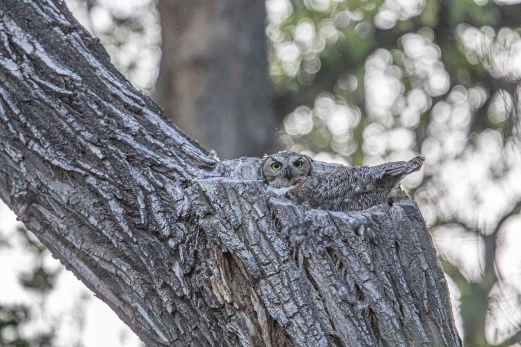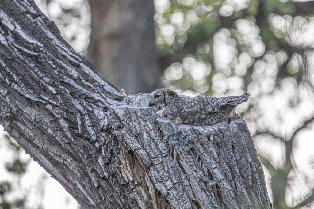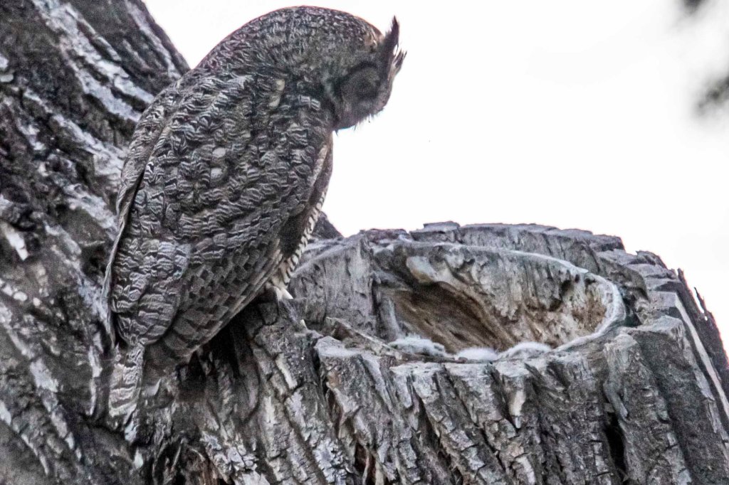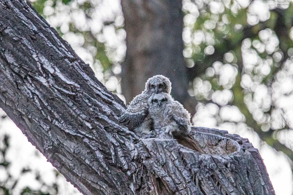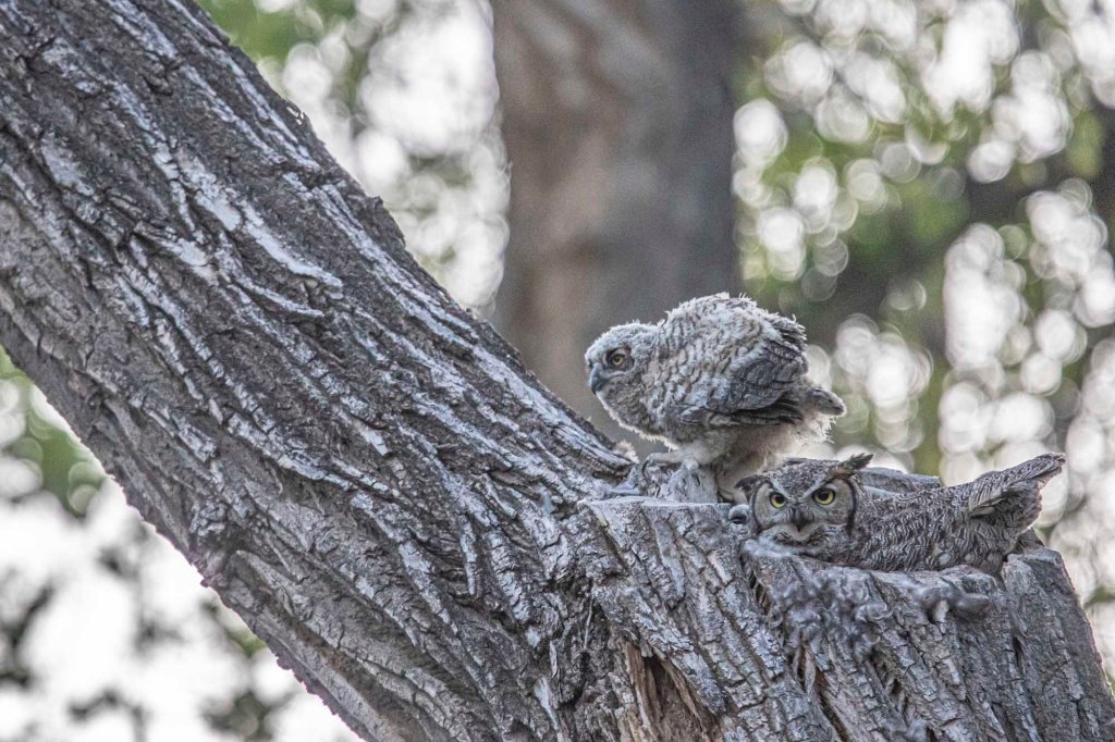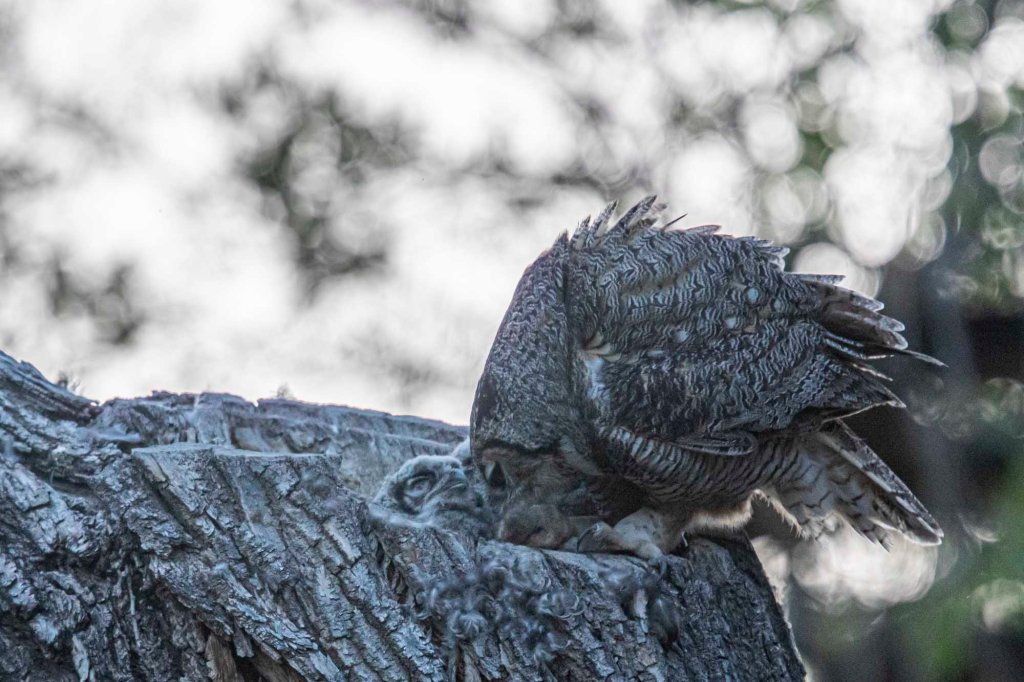 Mama Owl was perched on the edge of the nest at 4:30 this afternoon before she flew off in search of food. An owlet waited patiently.