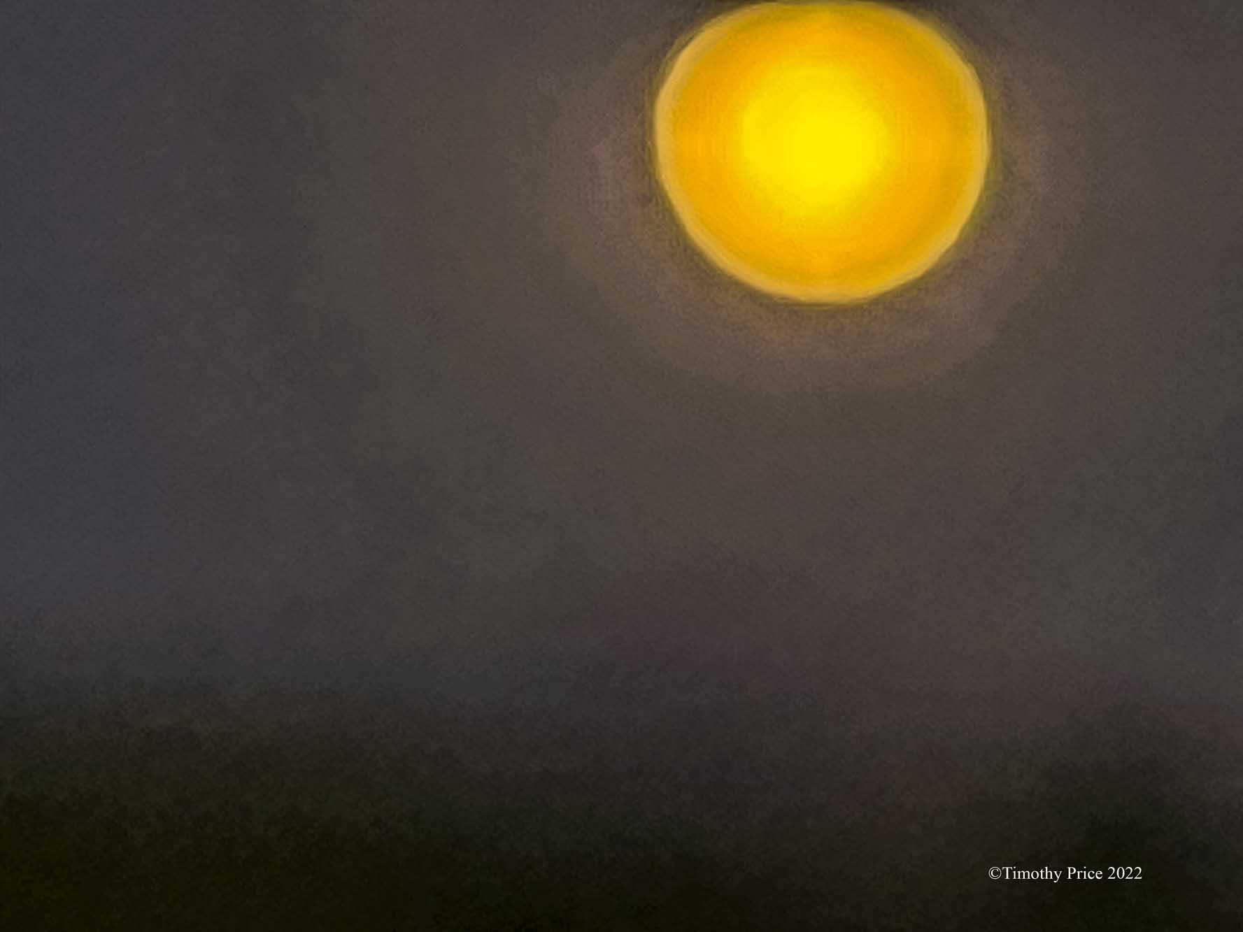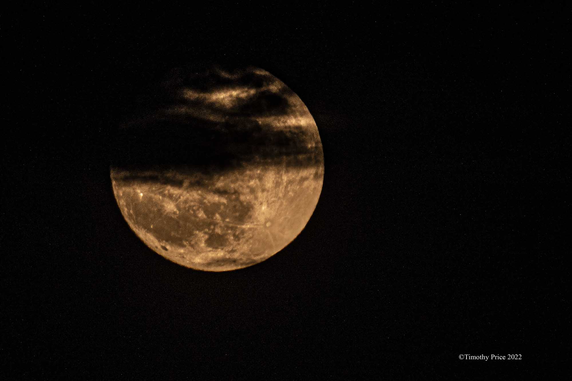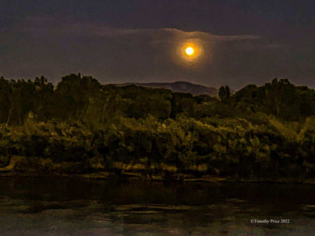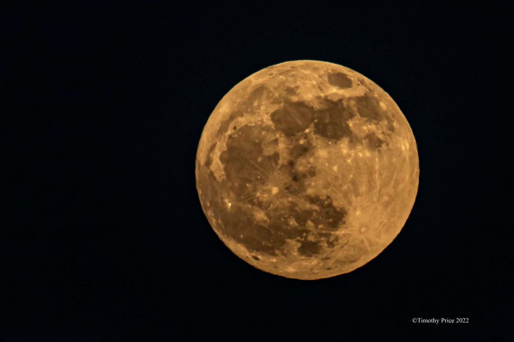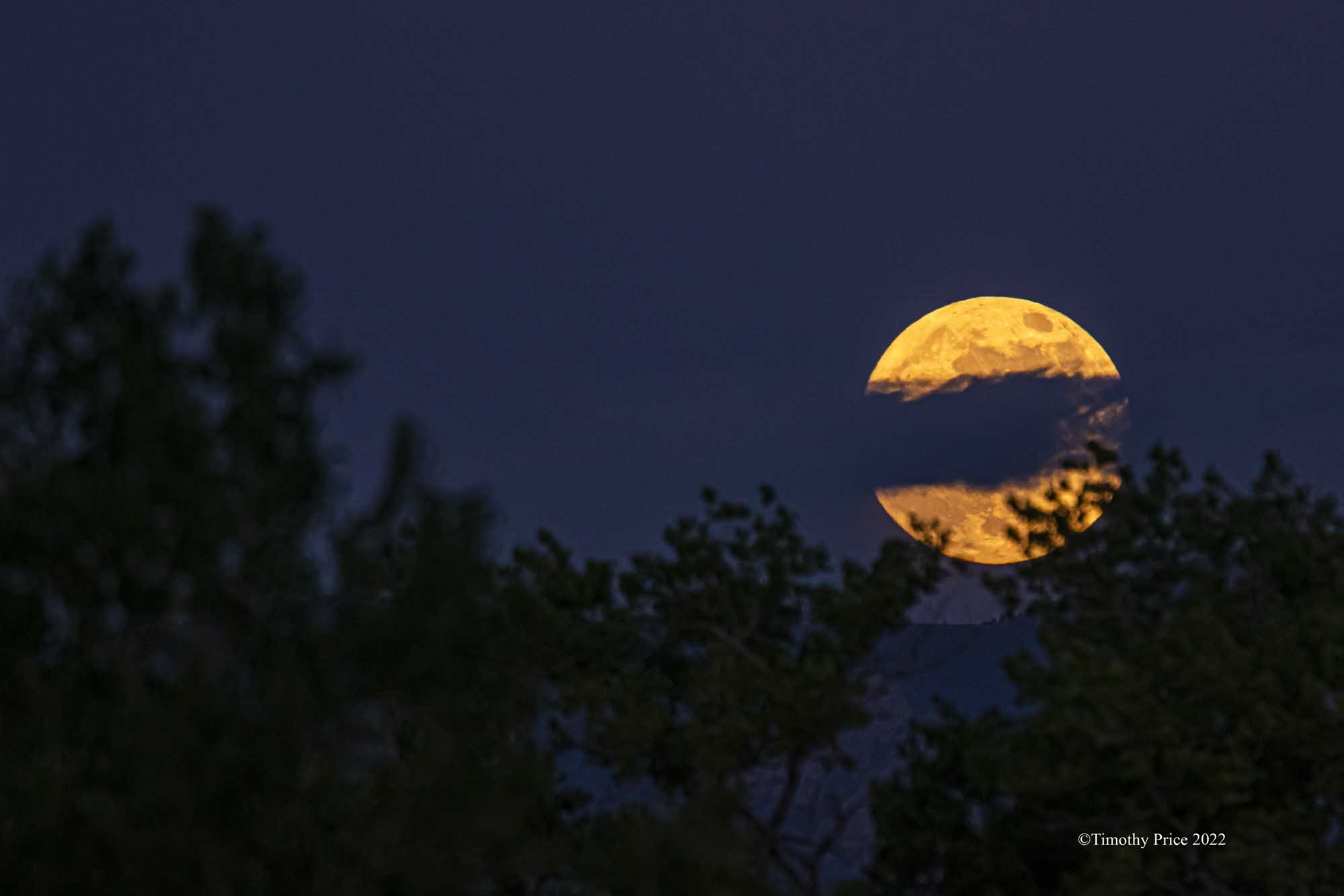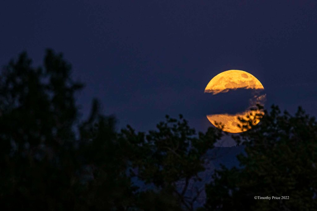Strawberry Moon Forever June 14, 2022 Timothy Price76 Comments The June Moon, a super Strawberry Moon, rose at 8:20 last night at sunset. All the blurry streaks and dots are gnats swarming around. Shey’s tree, colored clouds, and streaky sky with bat blurs.
