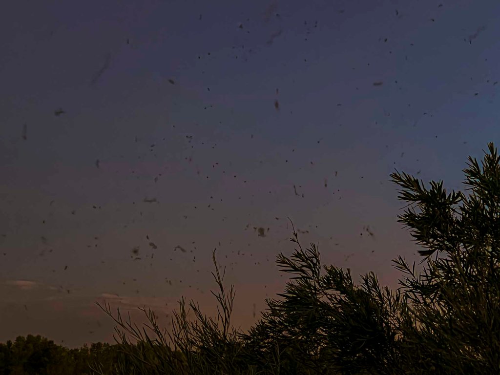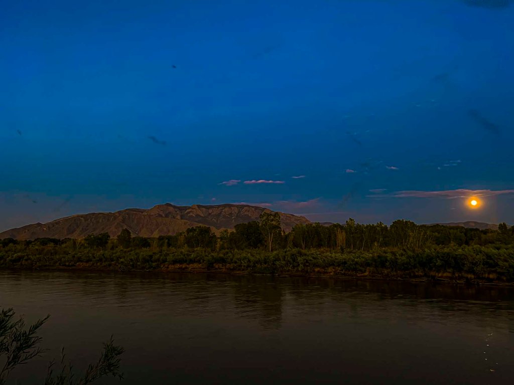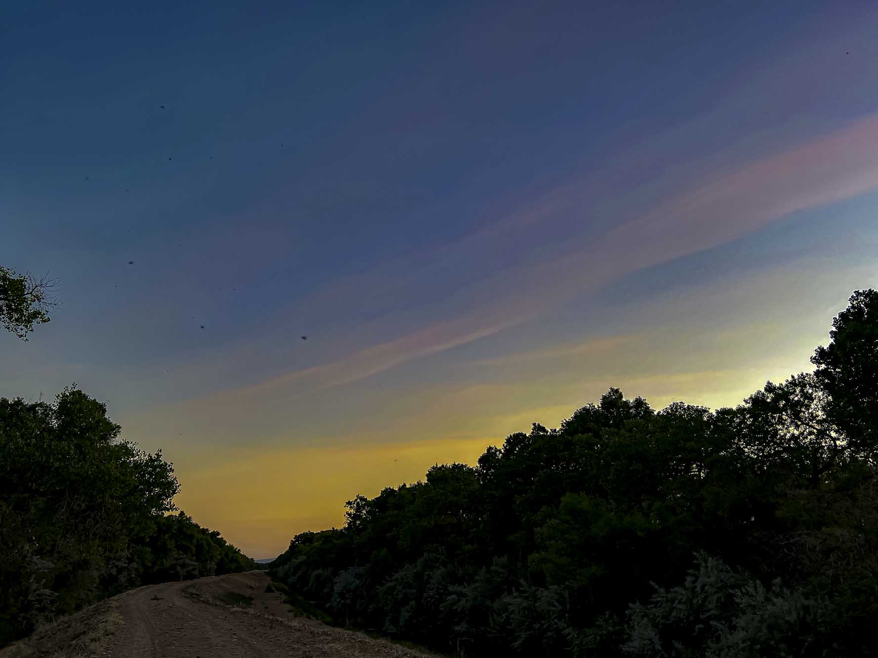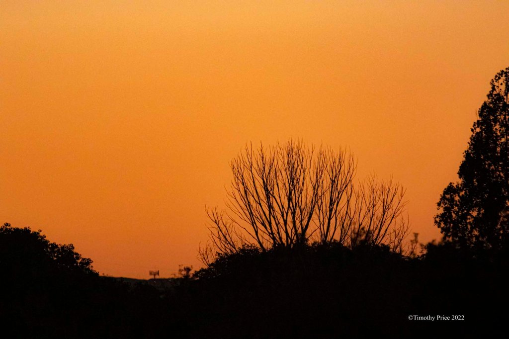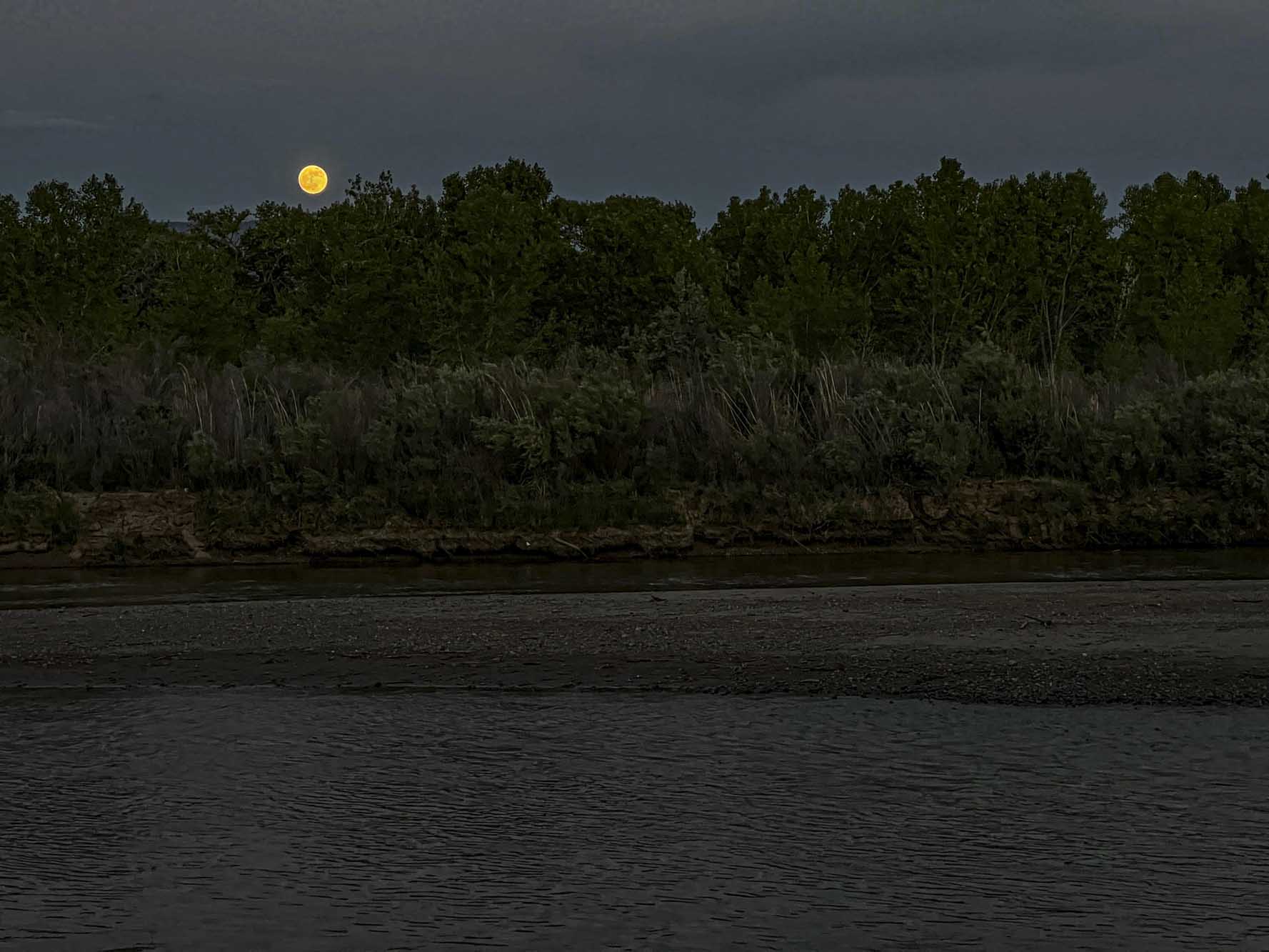 Strawberry Moon Forever June 14, 2022 Timothy Price76 Comments The June Moon, a super Strawberry Moon, rose at 8:20 last night at sunset. All the blurry streaks and dots are gnats swarming around. Shey’s tree, colored clouds, and streaky sky with bat blurs.