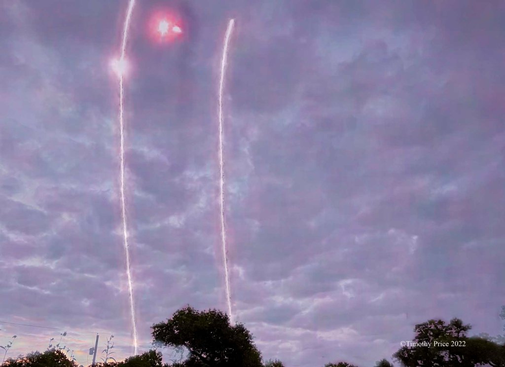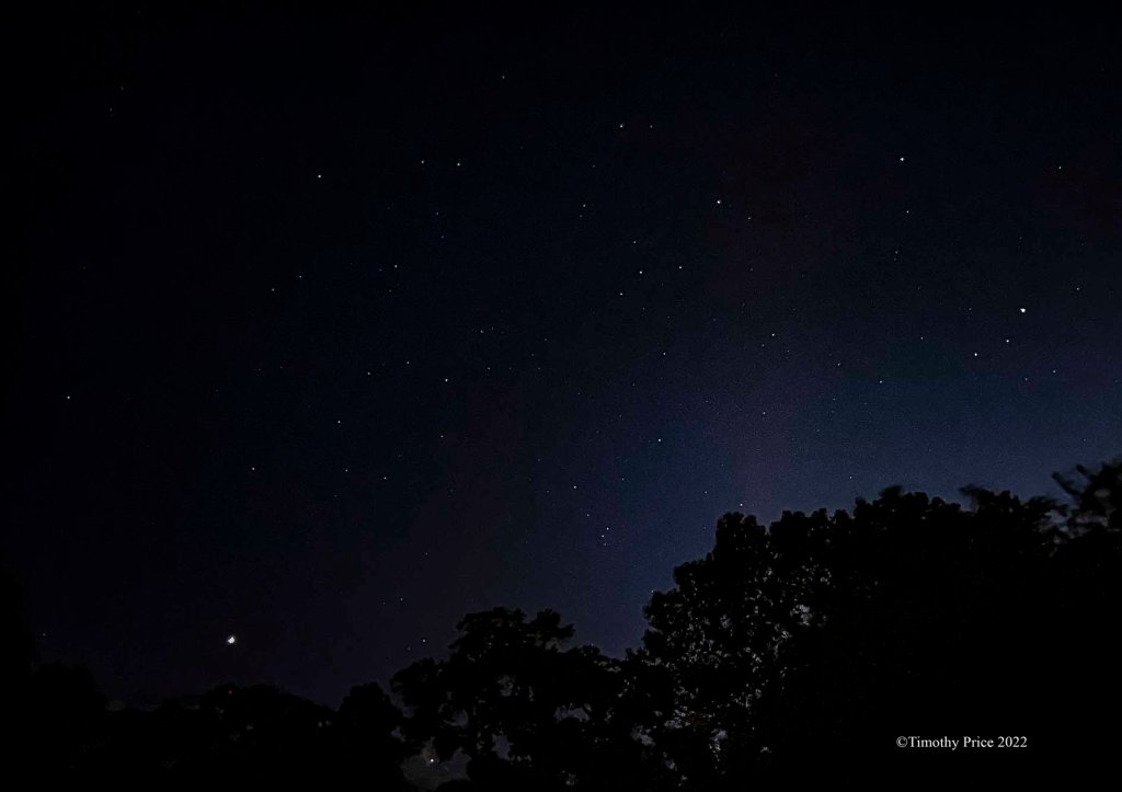 9:30 pm last night. Jupiter is in the lower left of the photo, and Saturn is close to the right edge of the photo.
