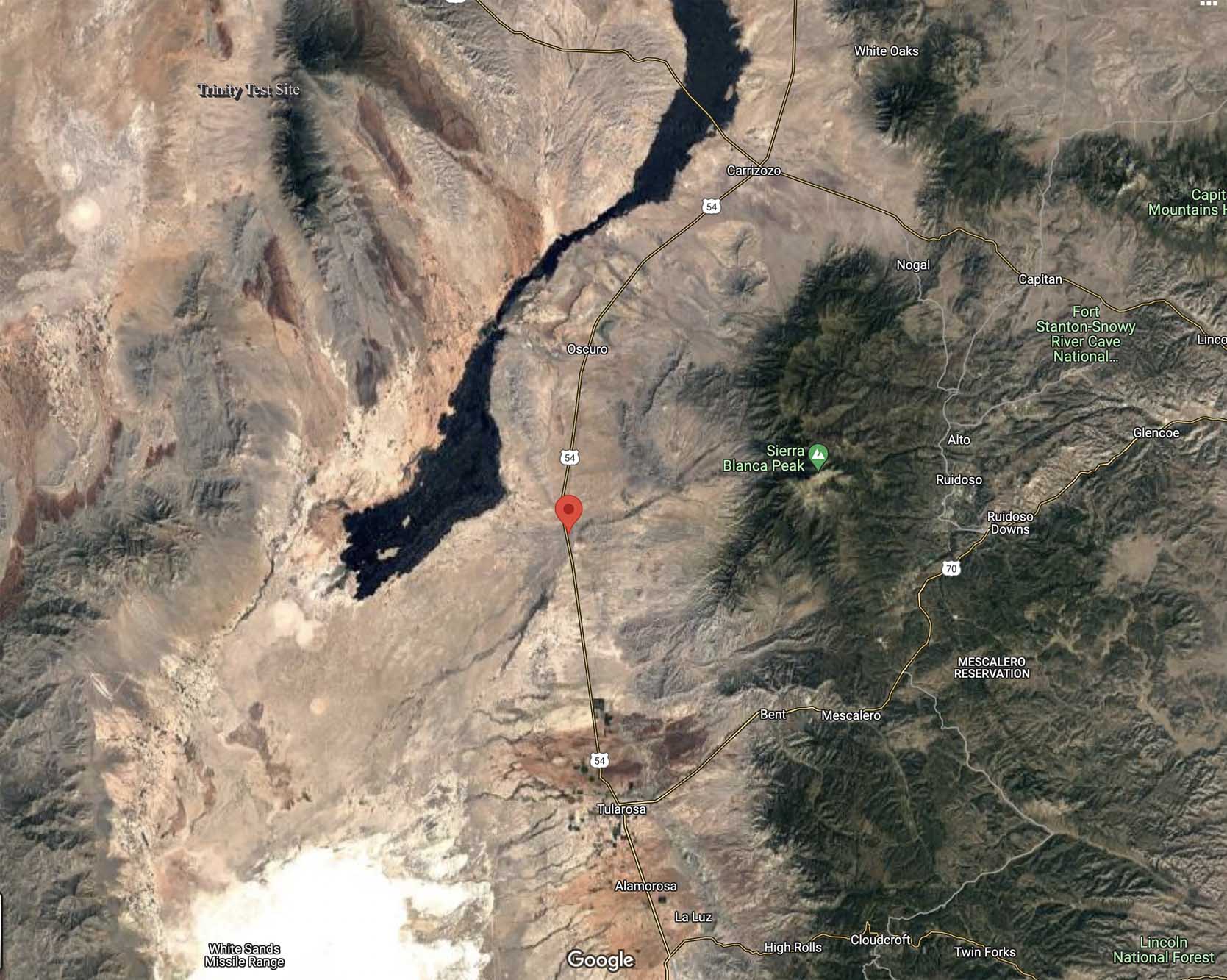 The above satellite map shows the location of Three Rivers School. The school and the trading post are 24 miles south of Carrizozo and 18 miles north of Tularosa. The border of the White Sands Missle Range is about a mile west of NM Highway 54 at Three Rivers. The south end of the Valley of Fires lava flow is the black area west of the Three Rivers. East of Three Rivers is Sierra Blanca Peak which is 11,981 ft (3,652 m) high. The Trinity Test Site where the first nuclear bomb was detonated in 1945 is north and west of Three Rivers.