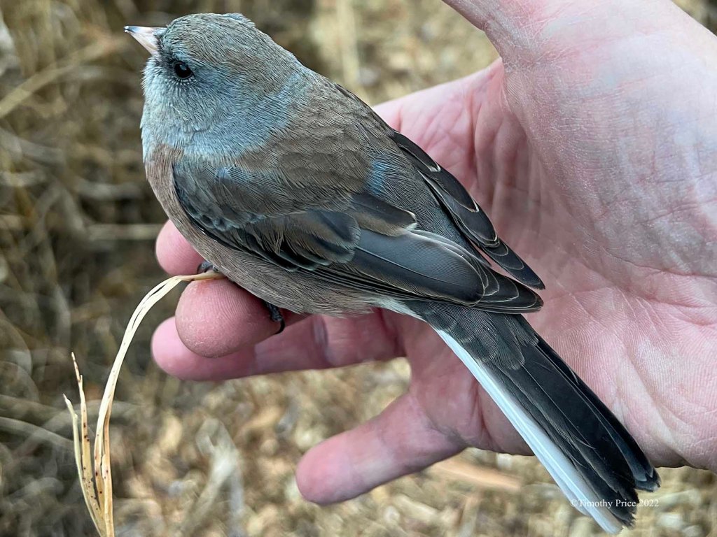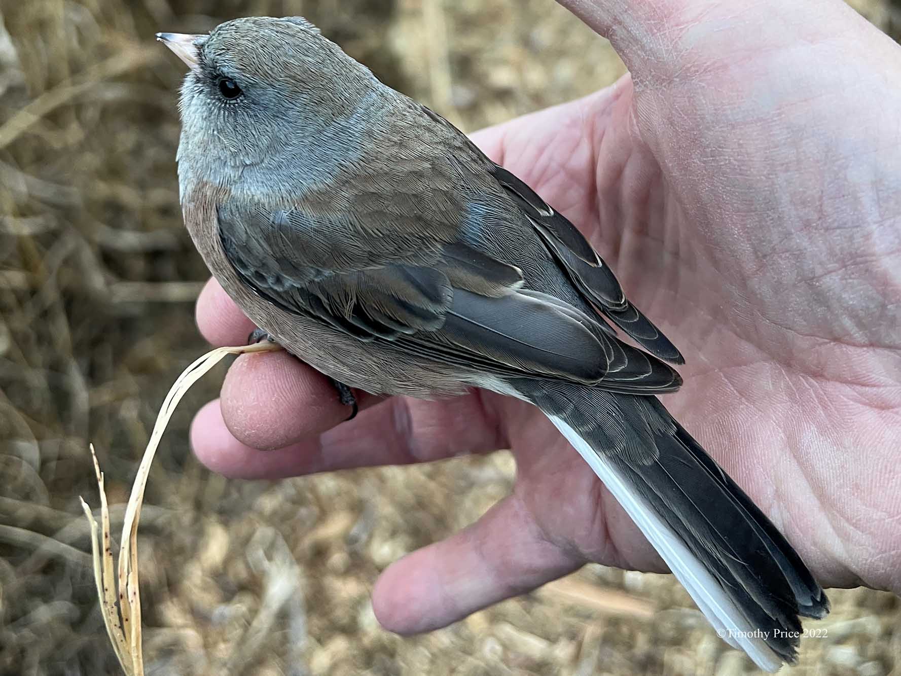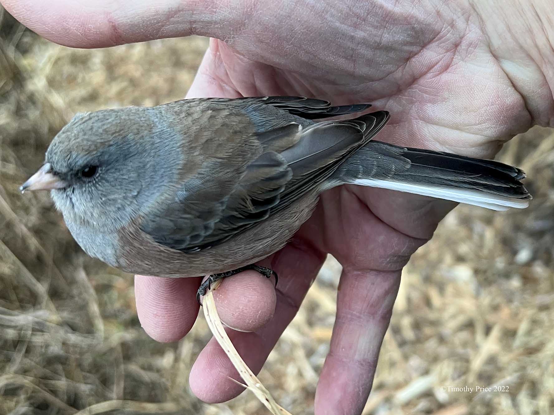 I also found this Dark-eyed Junco sitting on the path. I reached down to see if it would fly and it hopped onto my finger. It was alert, but it refused to fly. I tried to put it on a branch in the black bamboo, but it kept hopping back in my hand. I looked under its wings and inspected its body. I did not see any injuries. I took it inside and showed it to Laurie, then I walked down to the infinite shed of doom with the Junco still perched on my finger to get a bird cage to put it in for the night. I figured if it wasn’t going to fly, a cage would be a safe place for it to recover from whatever was keeping it from flying. It stayed on my finger inside the infinite shed of doom while I scrounged around in the dark looking for a cage. I finally found a cage, walked back outside, showed the cage to the Junco, and asked it if it wanted to spend the night in the cage in the house. At that point, I think it decided it couldn’t deal with the cage and flew away. I was relieved to see it fly.