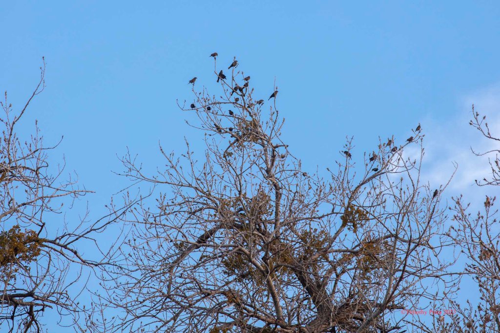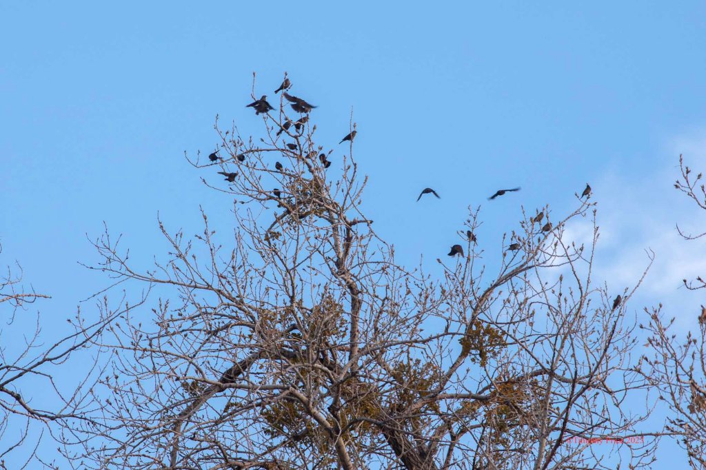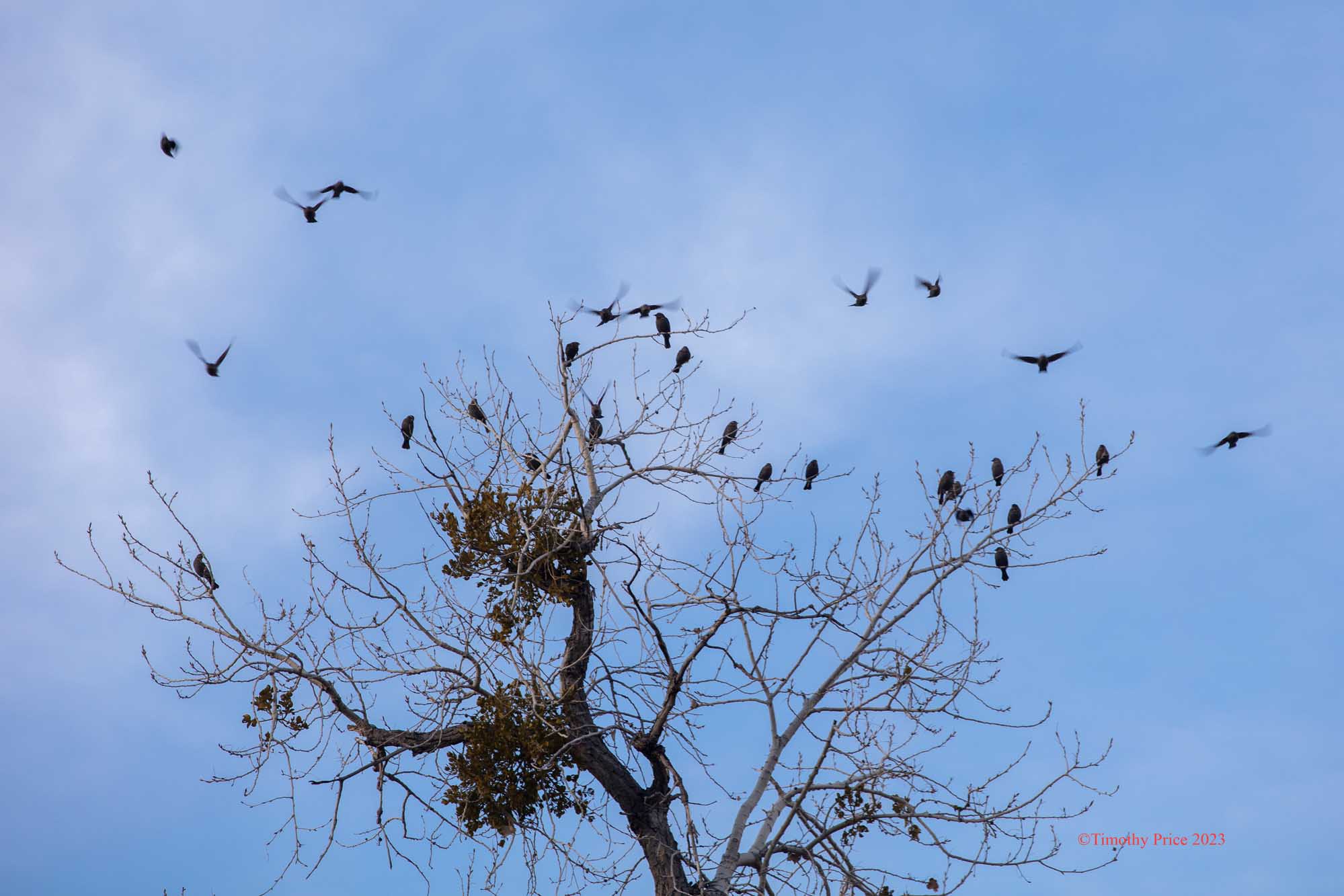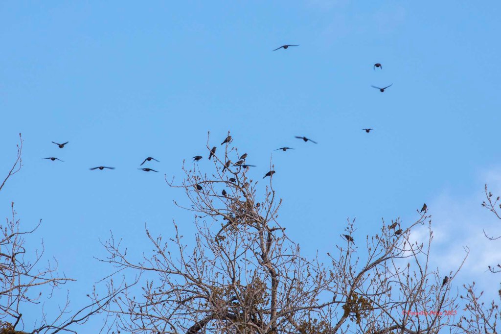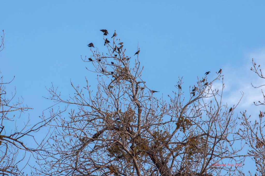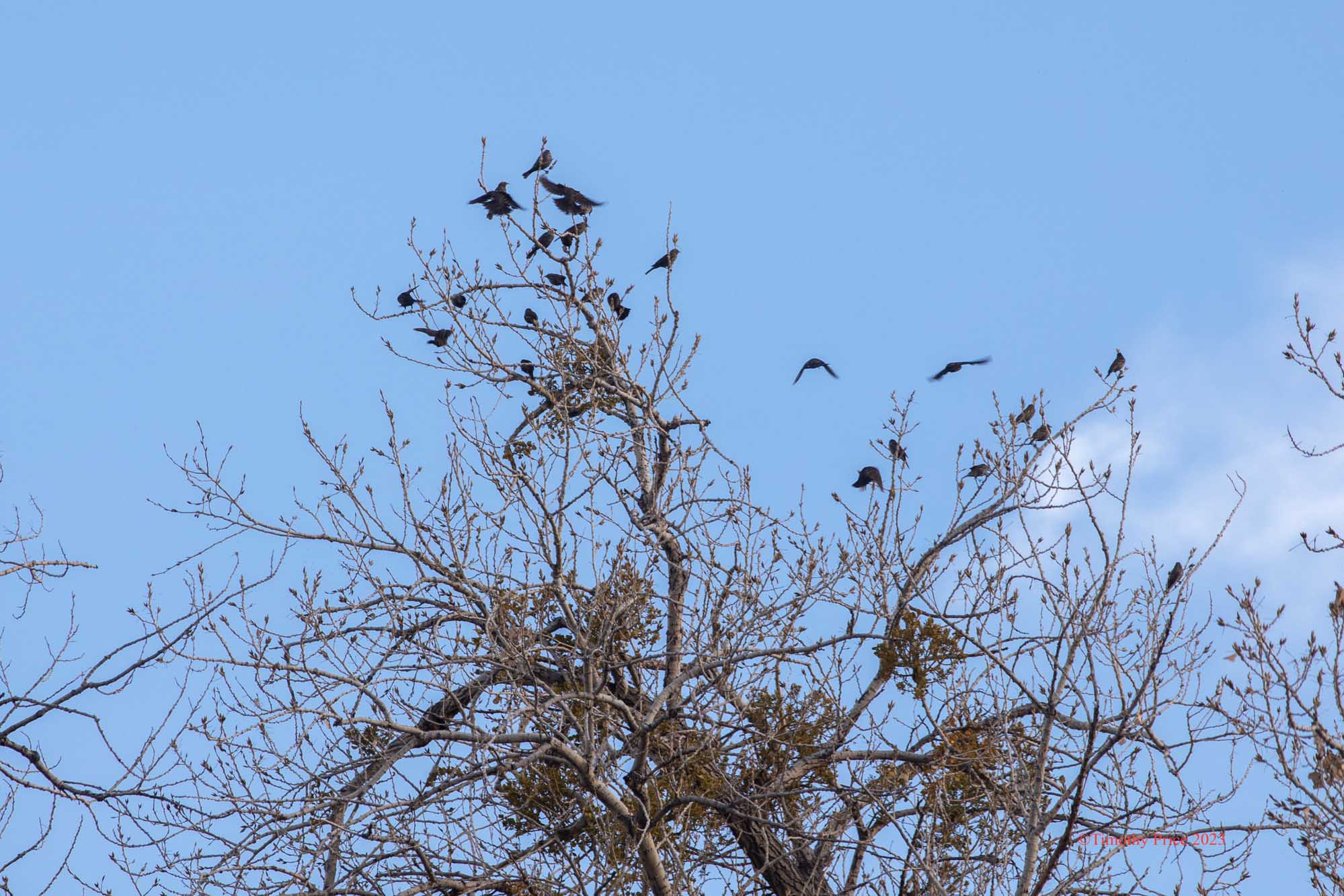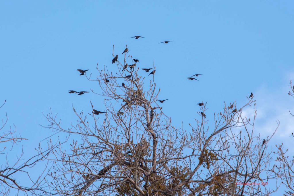 The female Redwing Blackbirds are still hanging out, flying between the tops of the cottonwoods during the day and roosting in Rebecca’s black bamboo at night. The above series shows a flock flying out from and back to the same cottonwood before moving to another cottonwood in the last photo.
