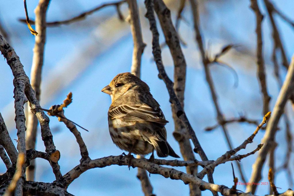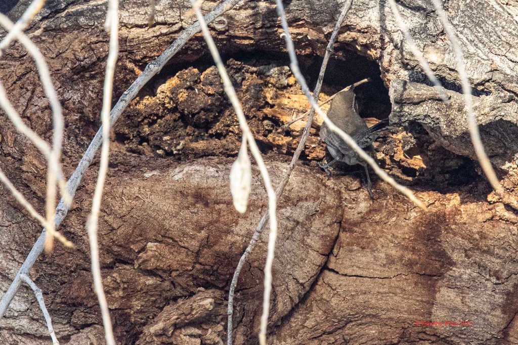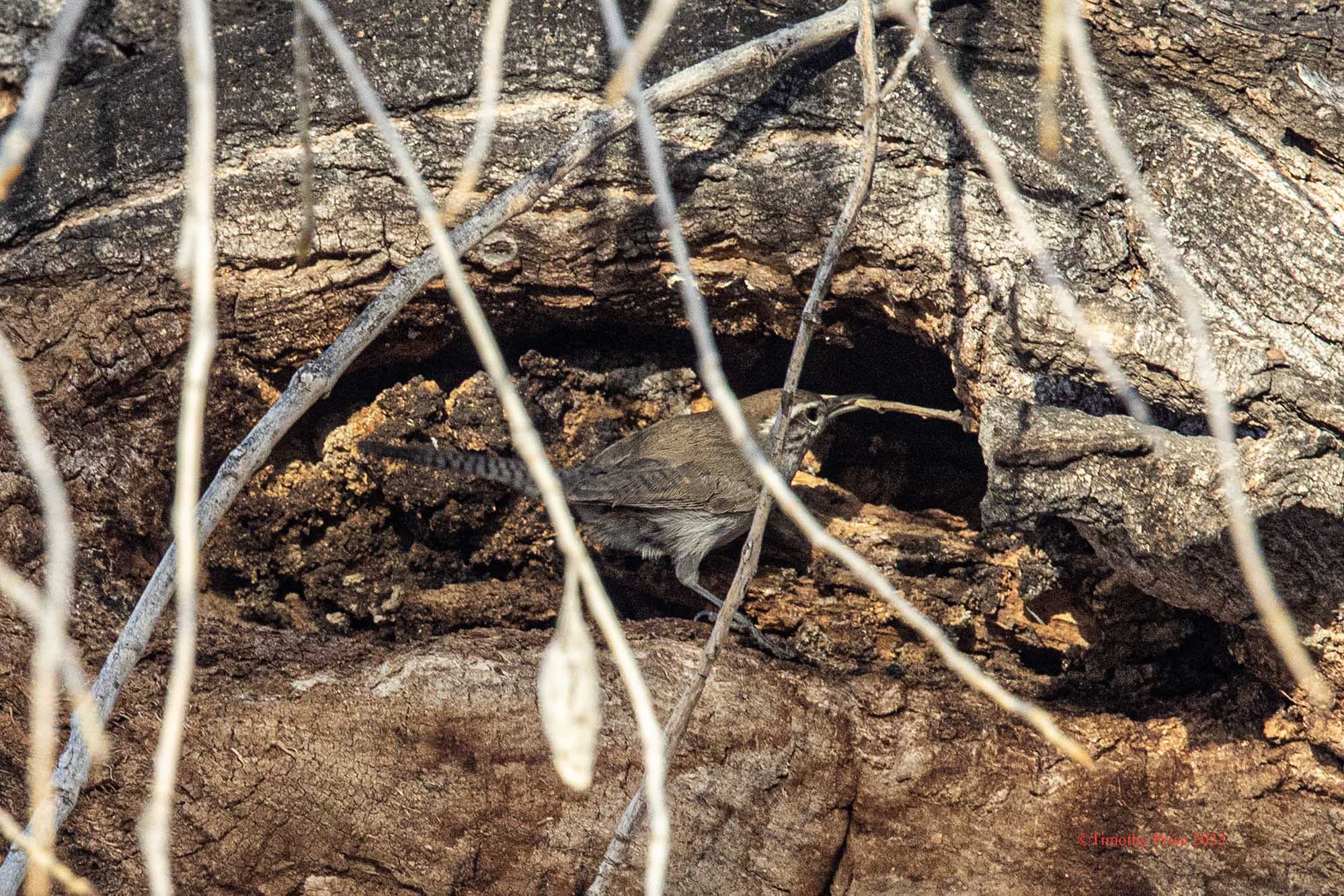 I was photographing the Western Bluebirds and Sparrows in and around Resa’s tree when I noticed one of them going into and coming back out of a hole in one of the branches. I could not see clearly enough through the camera to see the bird in the shadows, but I was expecting to see a Western Bluebird or Sparrow when I processed the photos. Much to my surprise, I did not recognize the little bird when I pulled the images up on my computer. I used one of the photos to identify the bird using the Merlin Bird ID app. The mystery bird turned out to be a Bewick’s Wren.