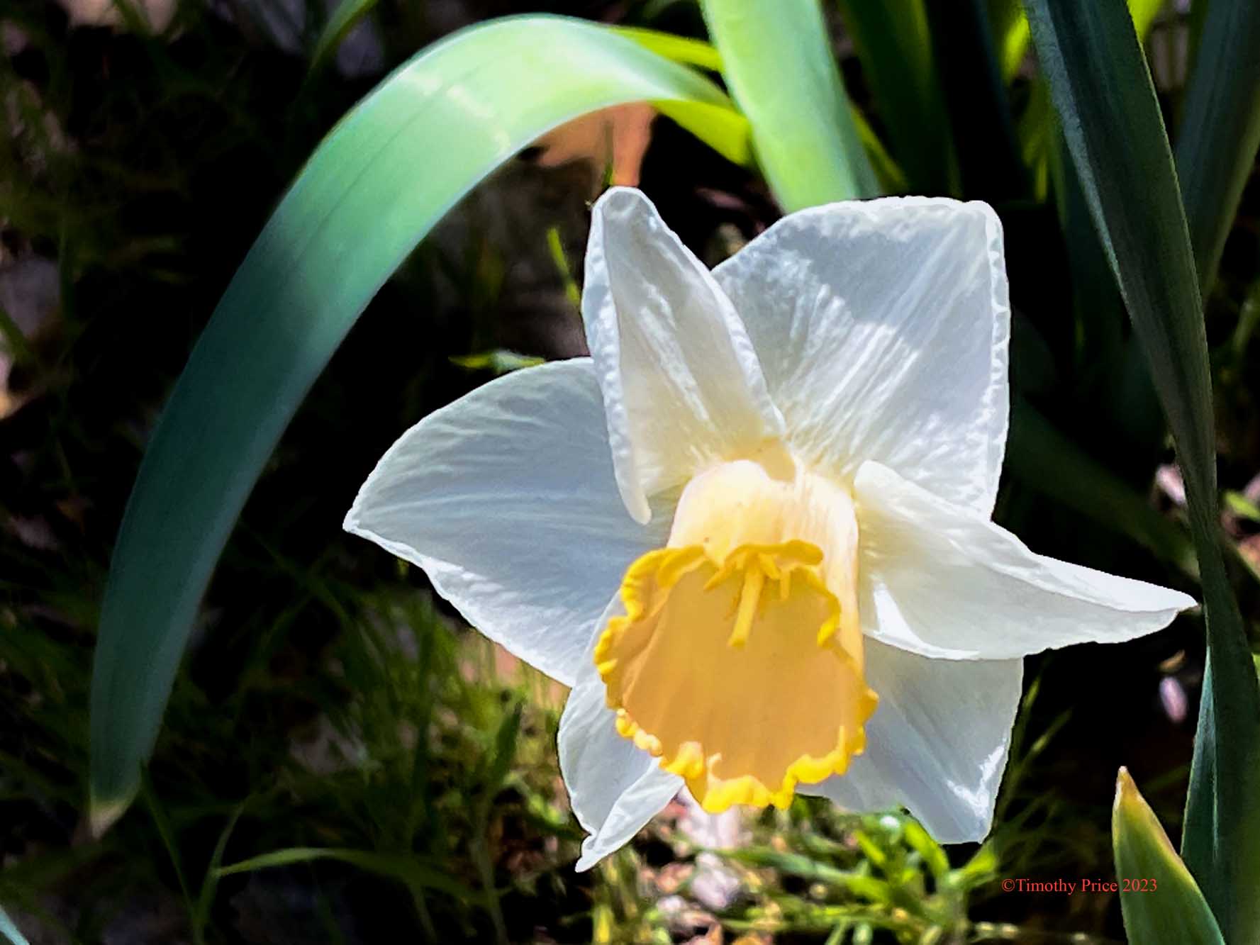 This daffodil is supposed to be peach and white. The sun shining through the center gave it a slightly peachy color. Otherwise, the center looks yellow. With our alkaline soil, it’s hard to get good pinks and peaches in some flowers.