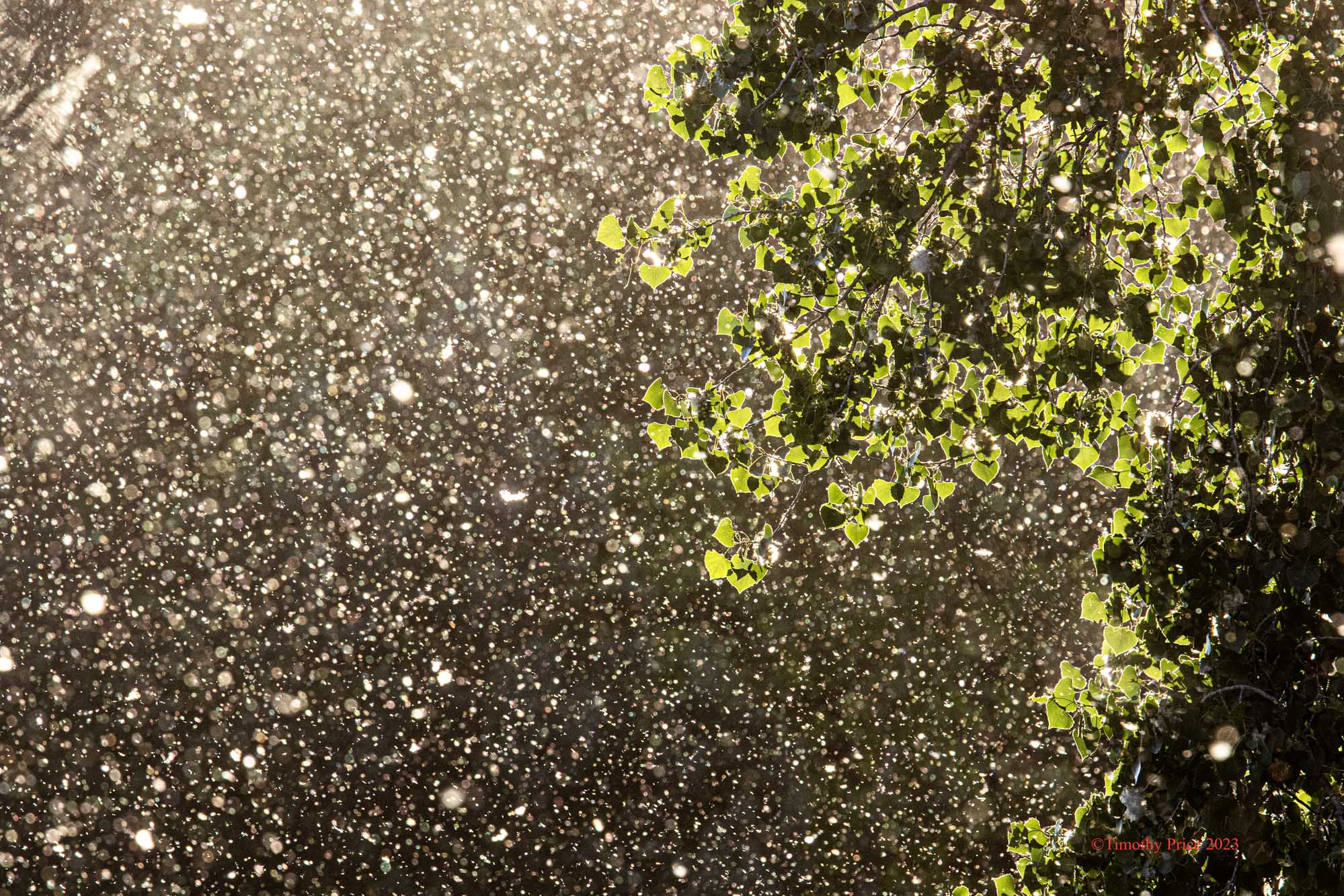 Cotton Falls Like Snow June 13, 2023June 13, 2023 Timothy Price40 Comments Sun hides behind treesBeaver slips underwaterCotton falls like snow I bothered a beaver who was feeding on the opposite bank of the Rio Grande. Cotton blowing off of Resa’s Tree.