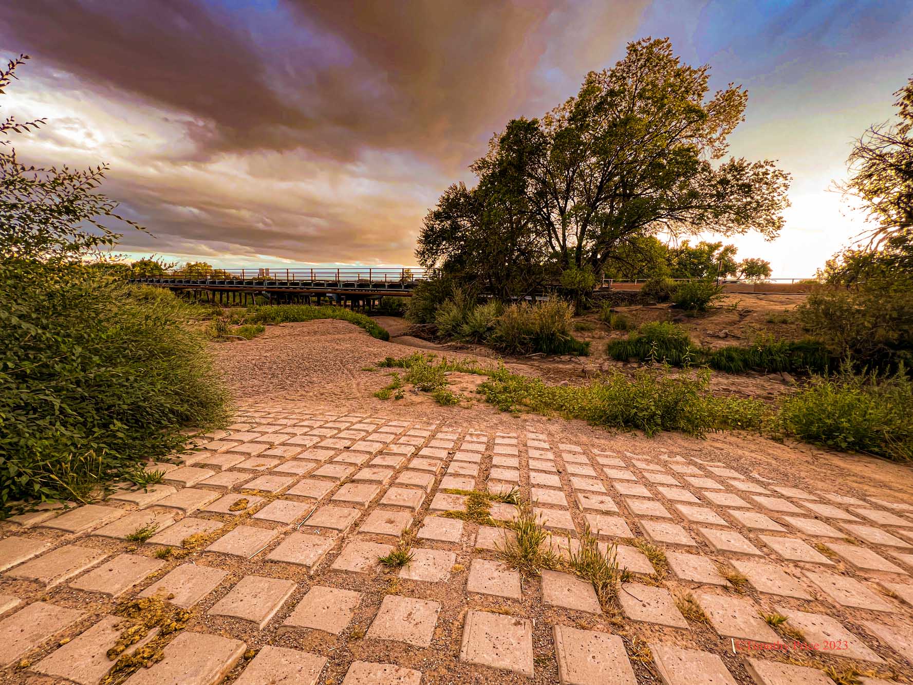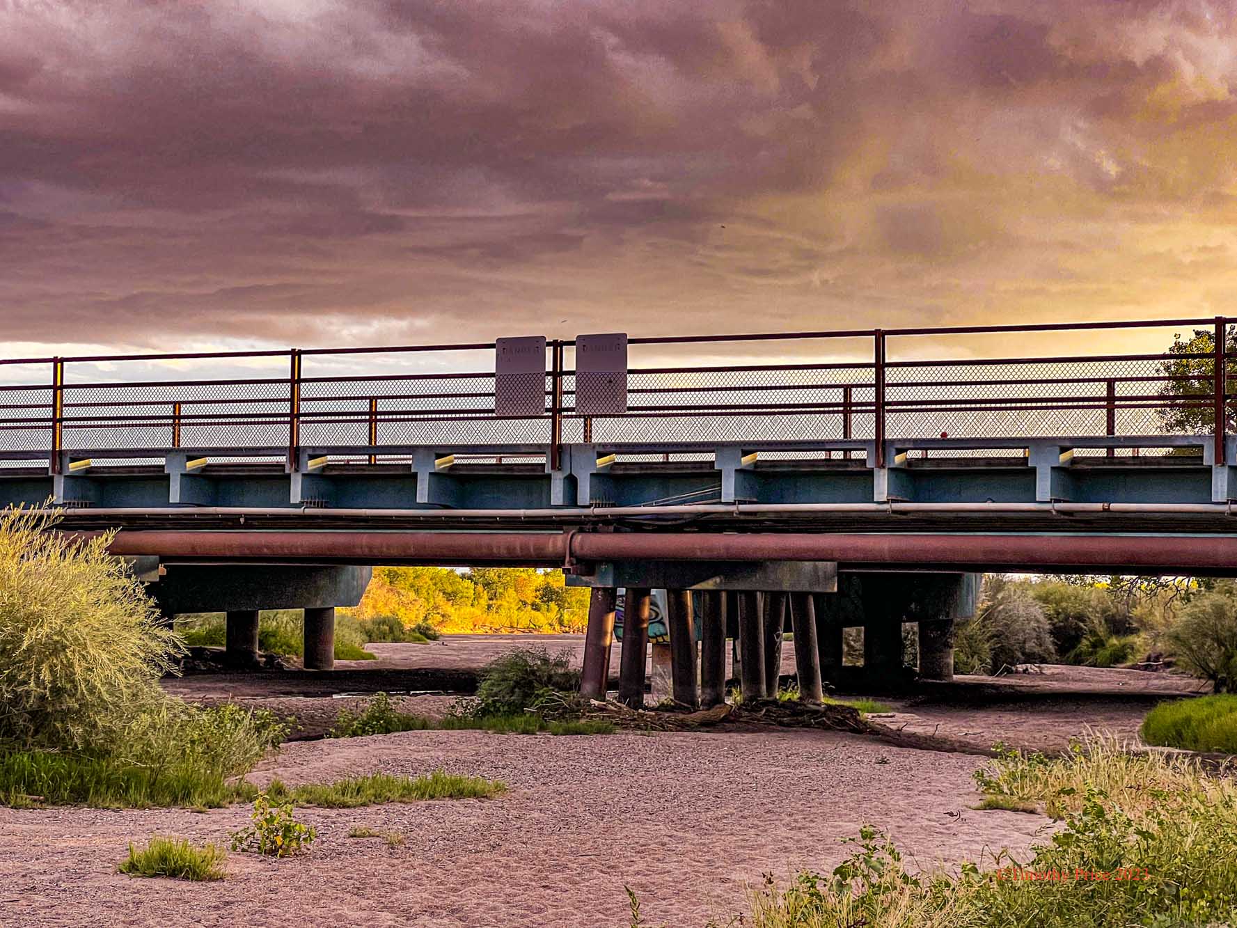Standing on the bed of the Rio Grande looking north at Alameda Bridge.