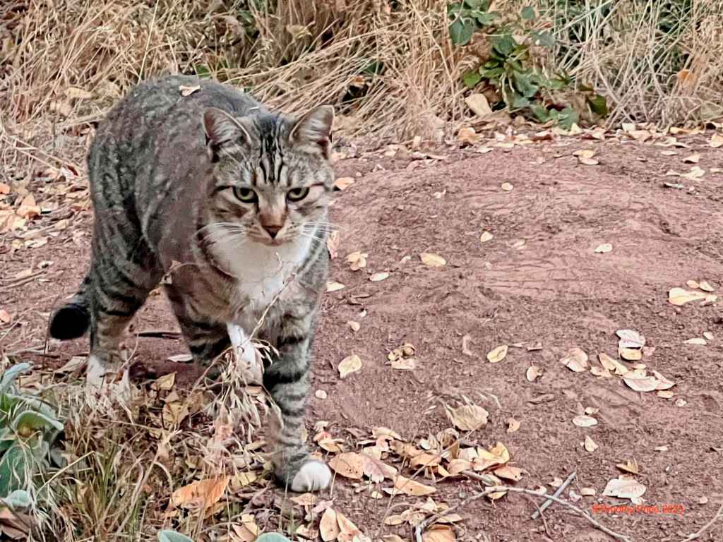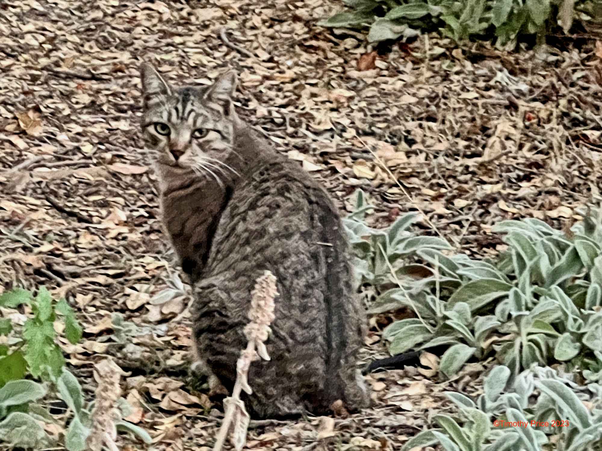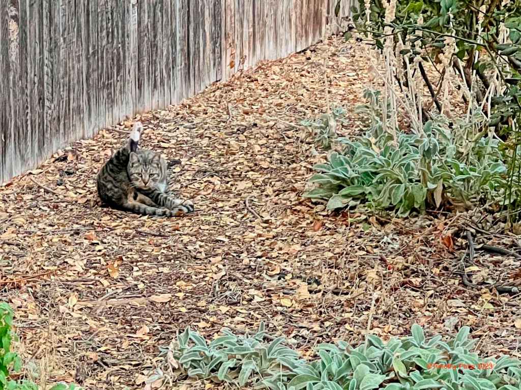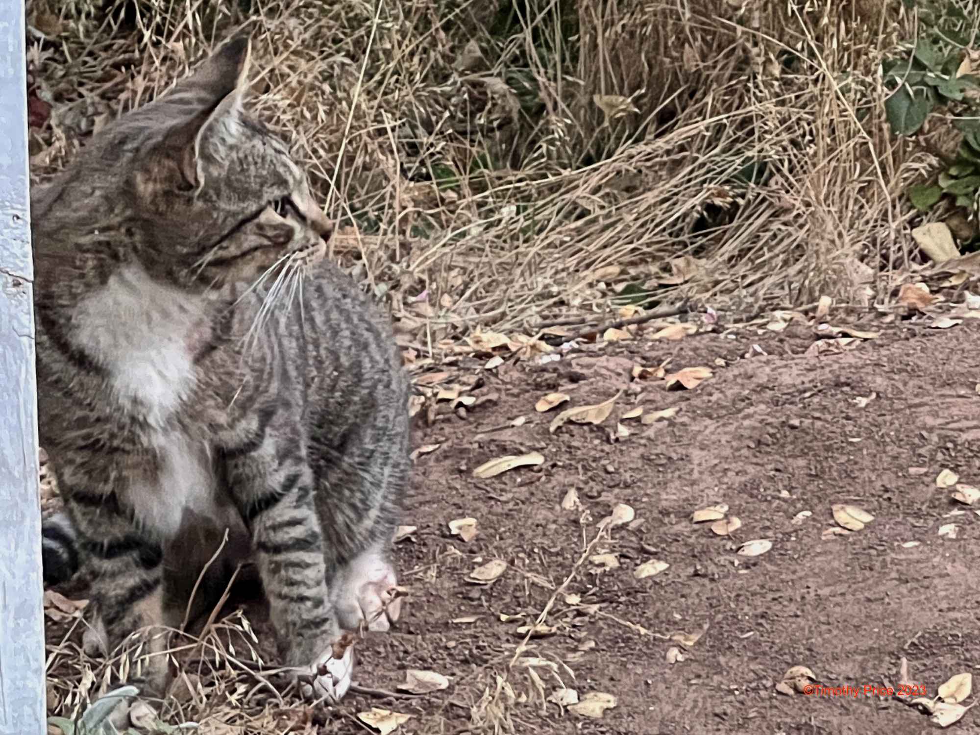when I processed the photos, it looked like the kitty might have a skin condition of some type. It looks like a fancy cat with its swirling patterns. I’ll see if it comes back, and I can win over its trust so I can see what its fur is like and take it to the vet for treatment if needed.