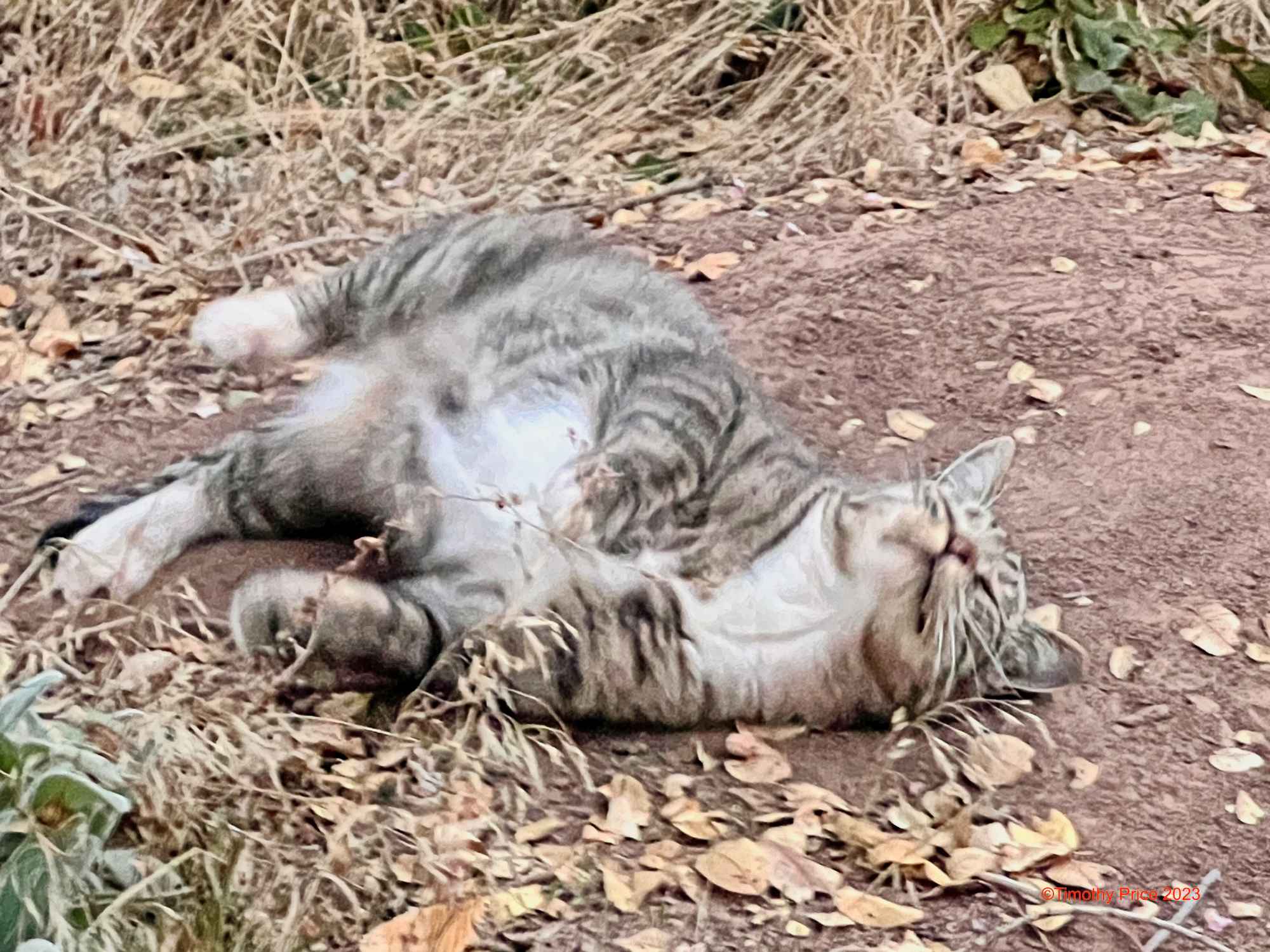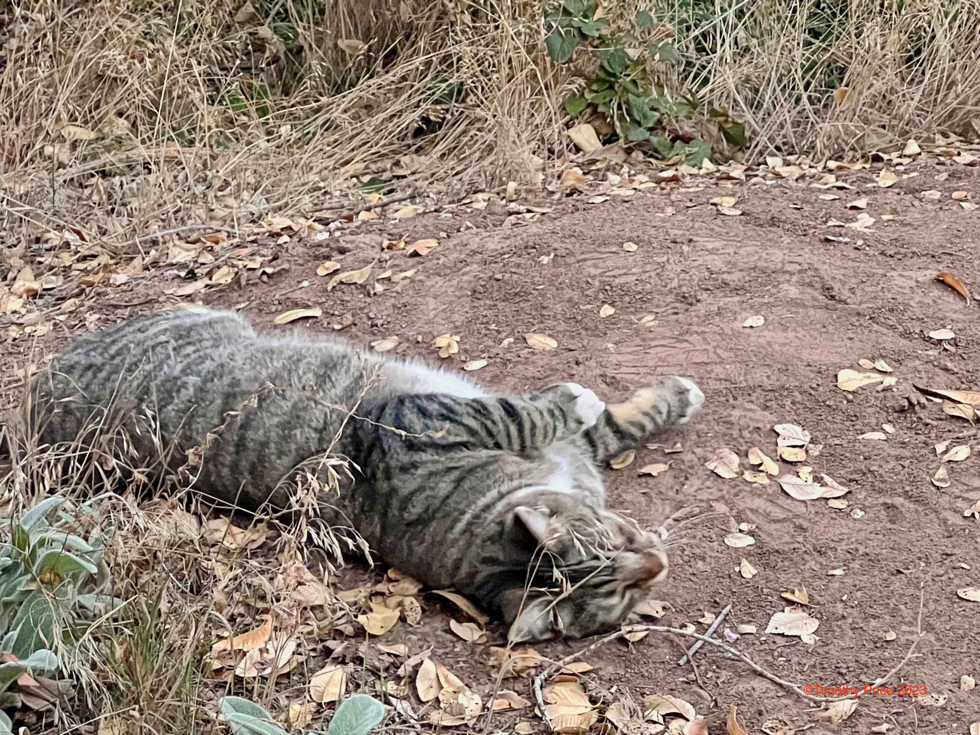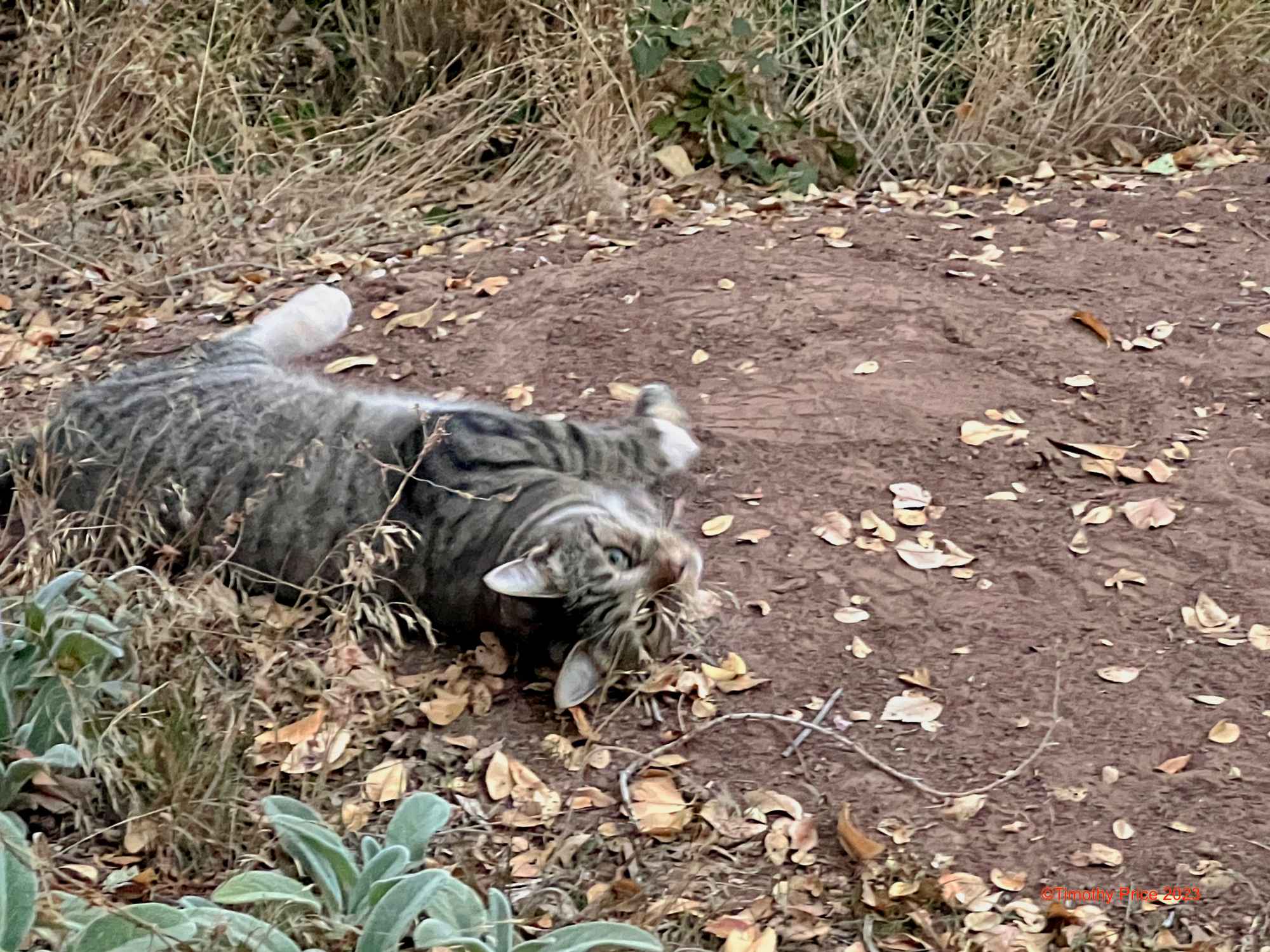 Late this afternoon, Glenda was at the bay window in the kitchen, meowing and growling. I looked out to see what the problem was. There was a tabby cat between a rose bush and the fence. I went out and talked to the kitty, but it acted like it was going to run away. I went back inside for thirty minutes, went back out, and the kitty was still there in the low evening light. I sat down on a large pot and started talking to it again. It started coming toward me, but stopped to do a bit of grooming. Then it started walking over to me but stopped about ten feet away, turned to the left, walked to a patch of bare dirt, and started rolling around, acting playful. It never got any closer to me. I brought out some food and water, and it ate the food.