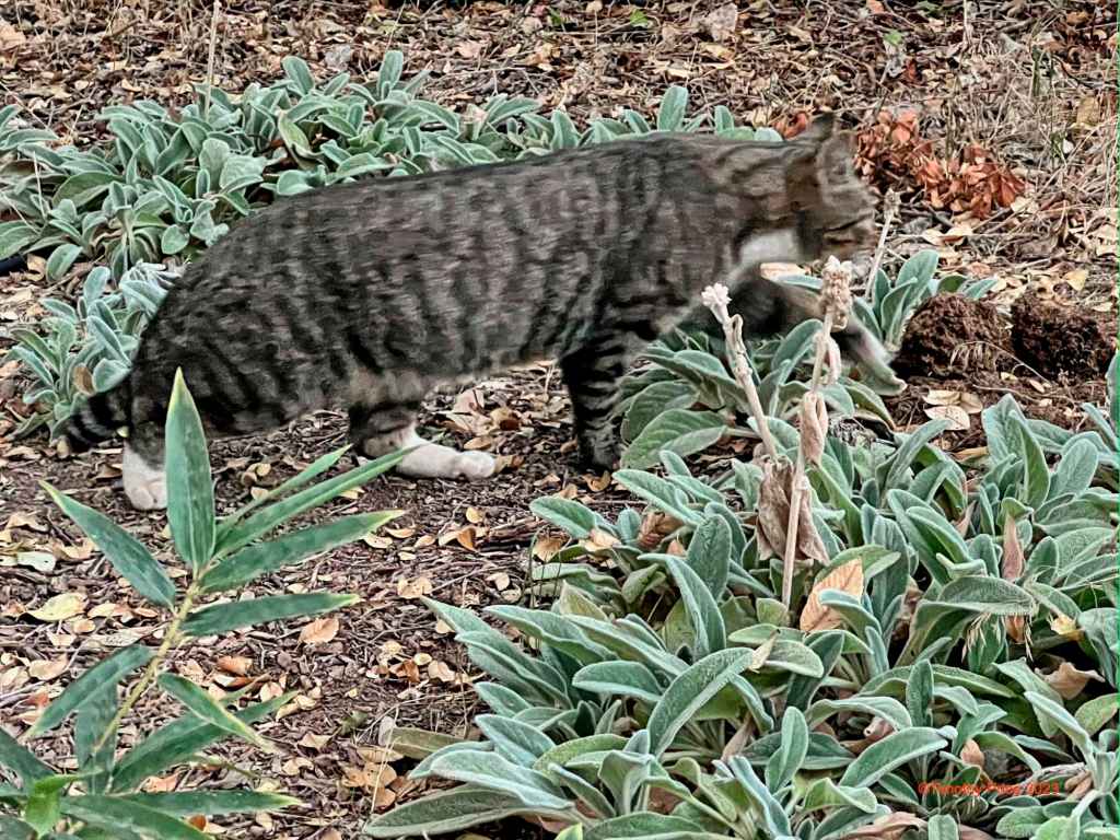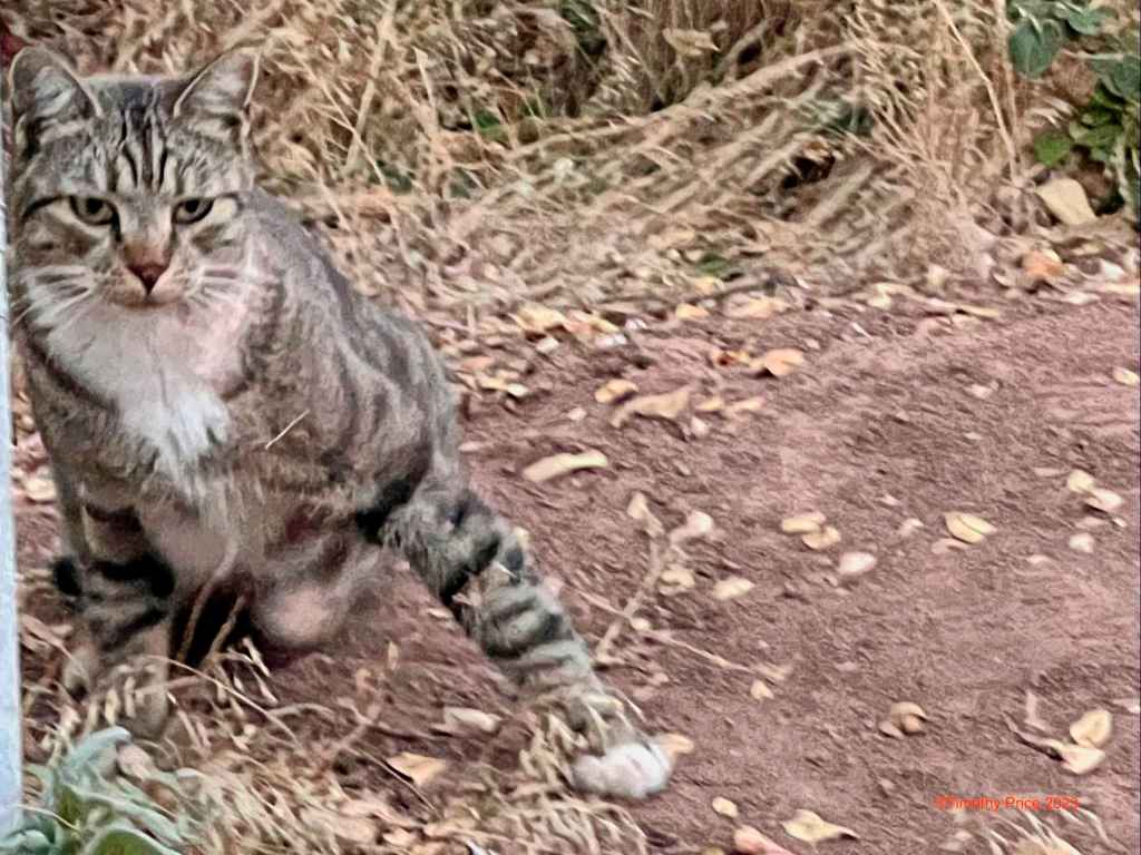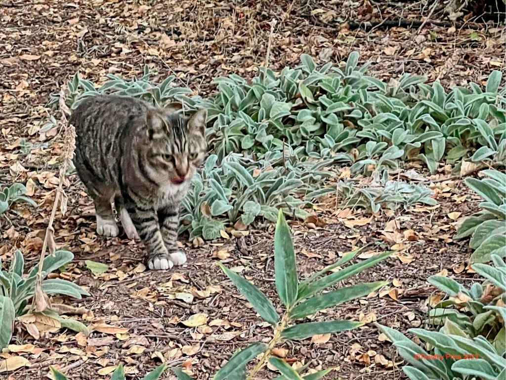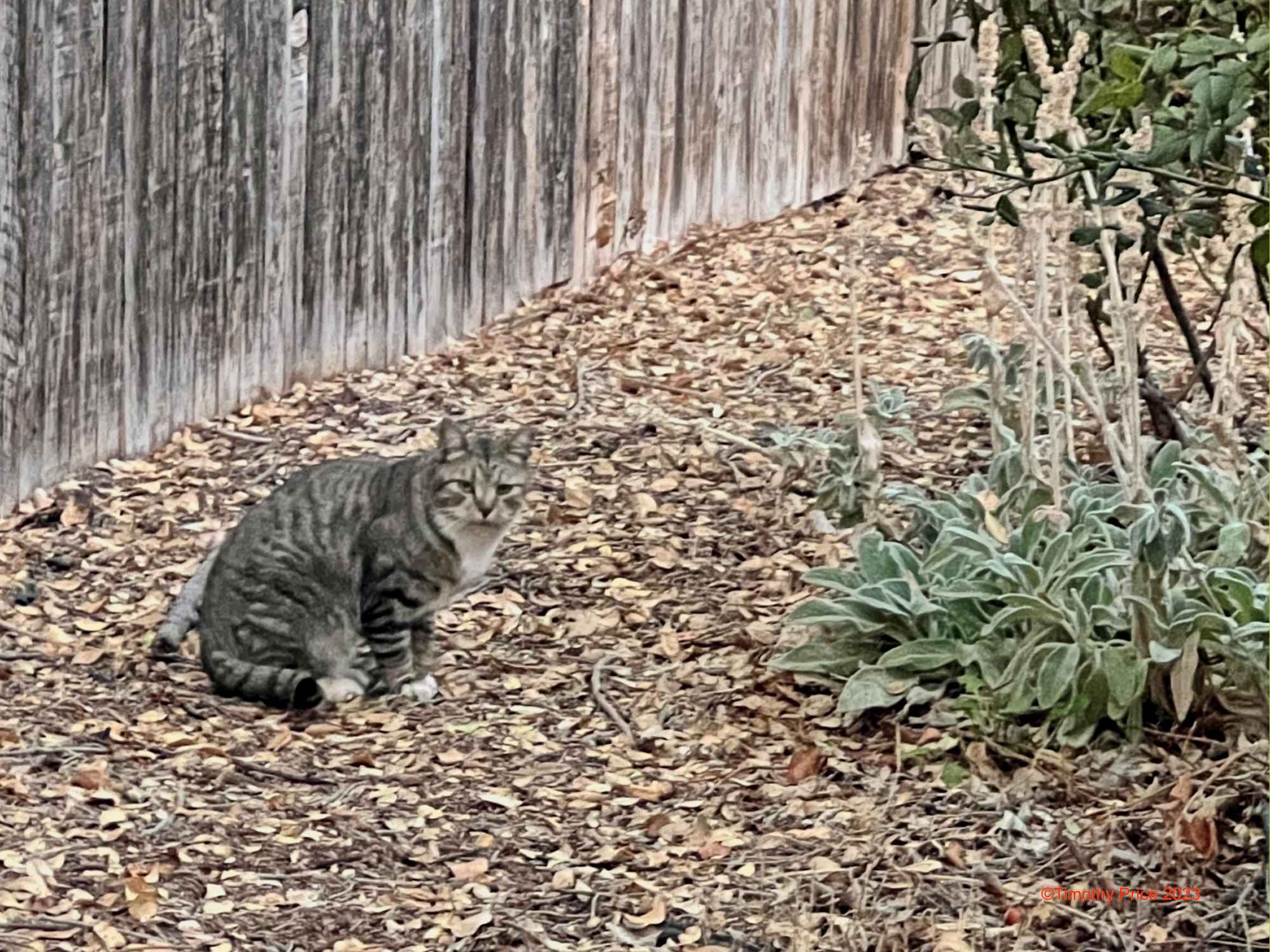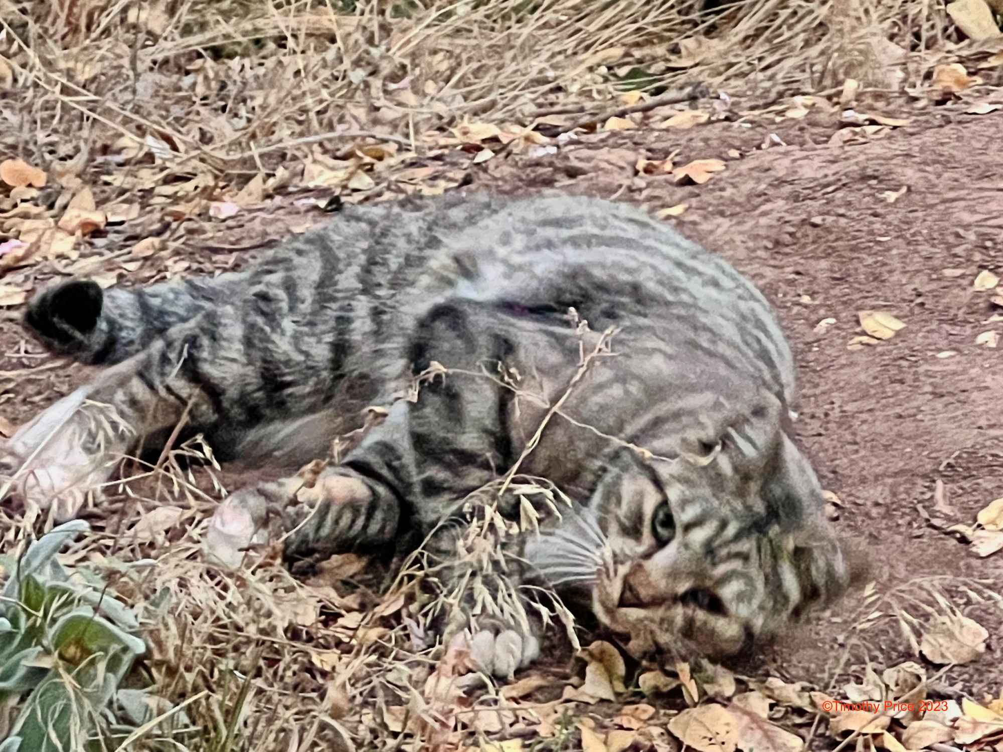 Late this afternoon, Glenda was at the bay window in the kitchen, meowing and growling. I looked out to see what the problem was. There was a tabby cat between a rose bush and the fence. I went out and talked to the kitty, but it acted like it was going to run away. I went back inside for thirty minutes, went back out, and the kitty was still there in the low evening light. I sat down on a large pot and started talking to it again. It started coming toward me, but stopped to do a bit of grooming. Then it started walking over to me but stopped about ten feet away, turned to the left, walked to a patch of bare dirt, and started rolling around, acting playful. It never got any closer to me. I brought out some food and water, and it ate the food.