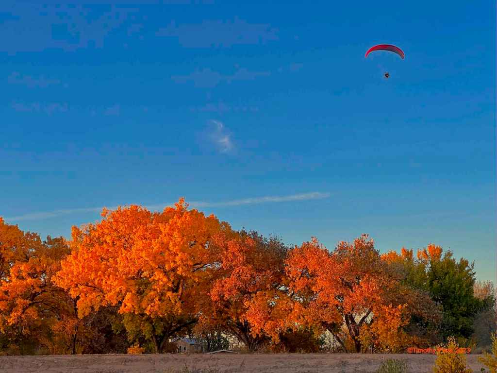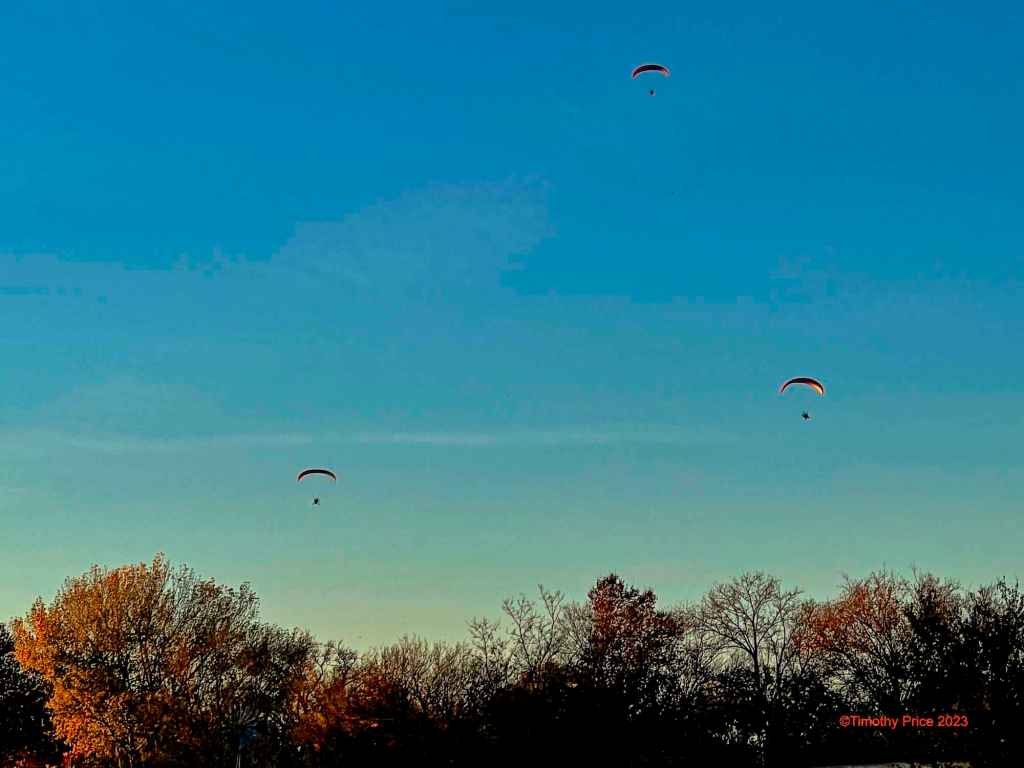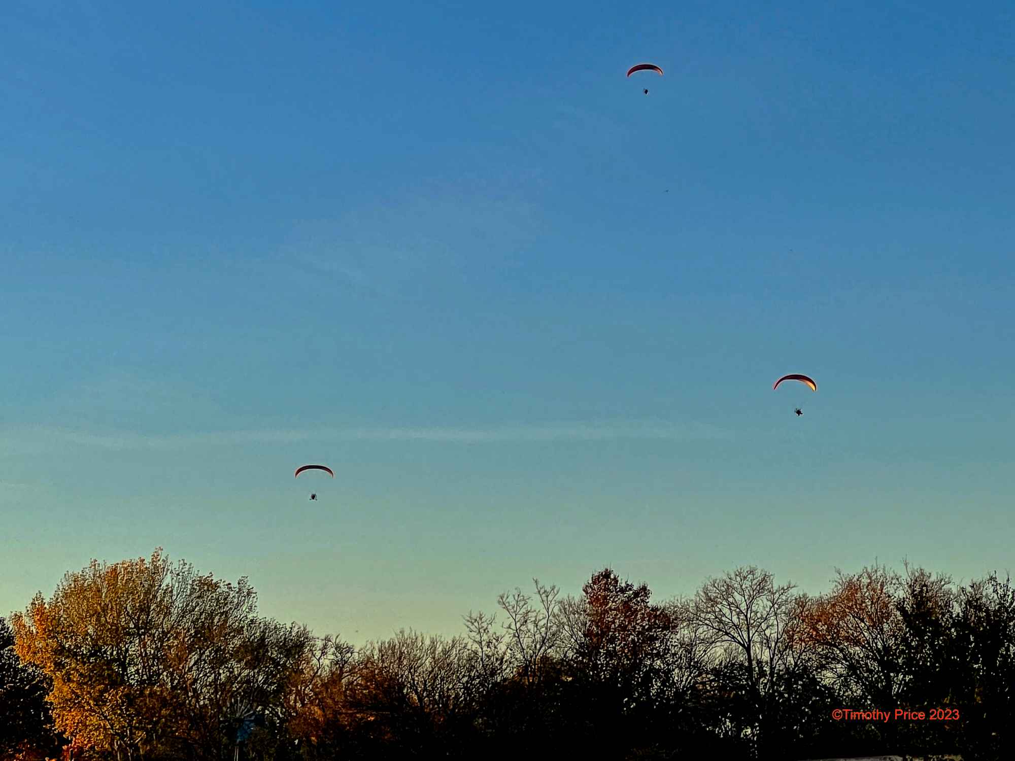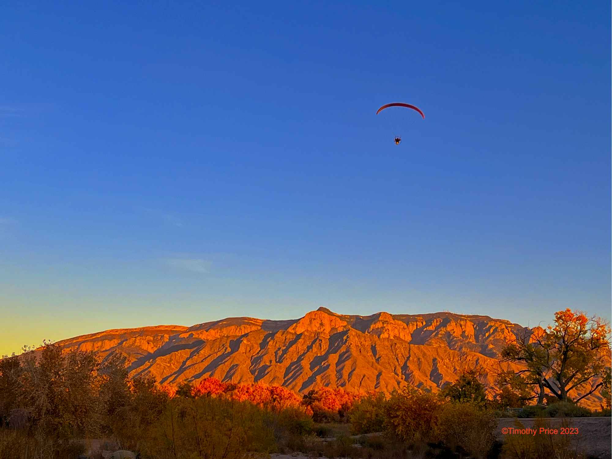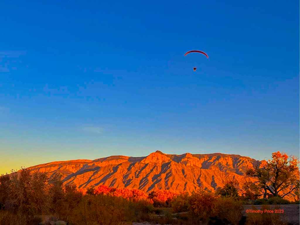 While taking the above photo of the Sandias in red, I heard a buzzing noise. I turned to see what it was and three paragliders were flying my way.