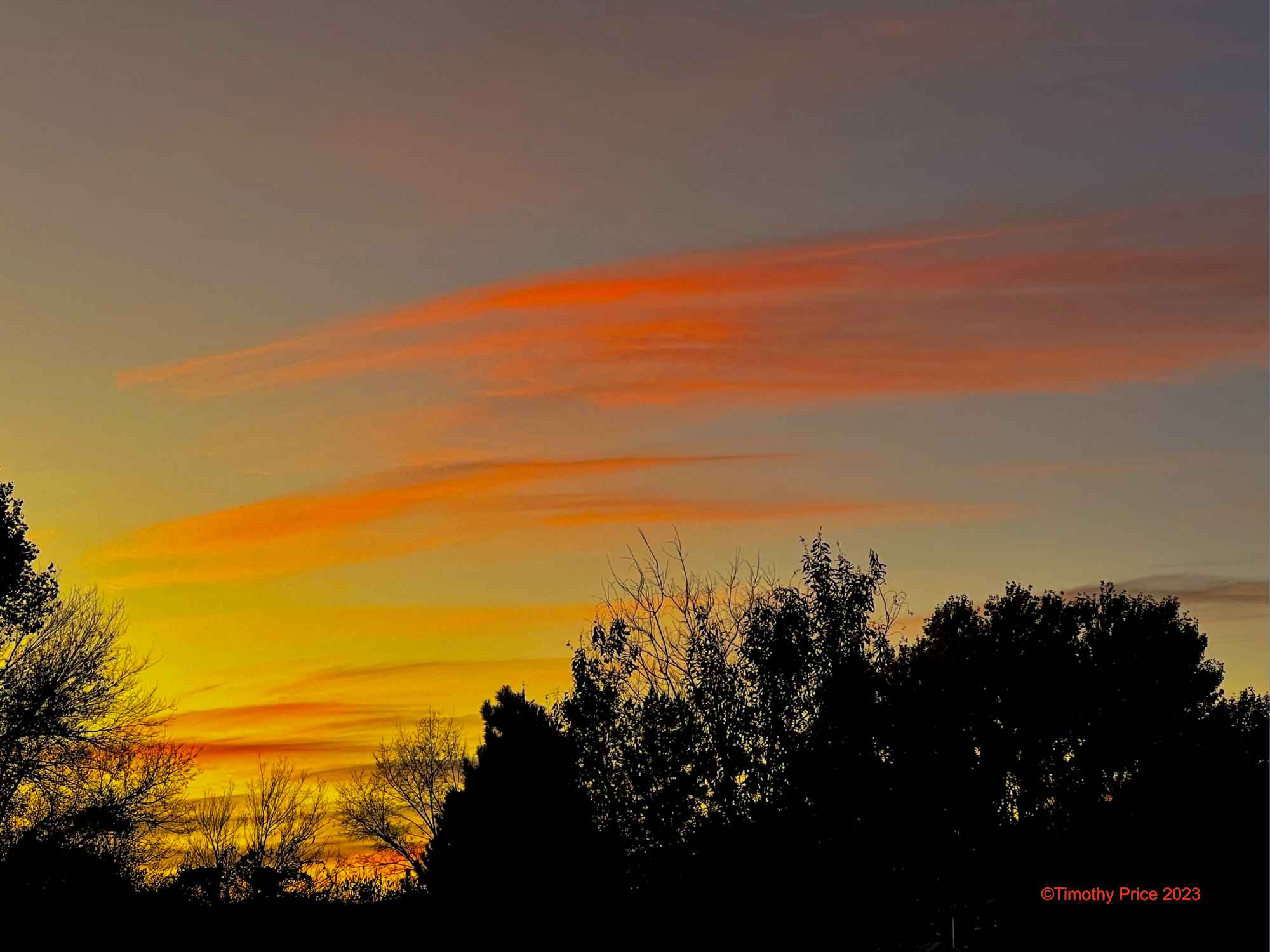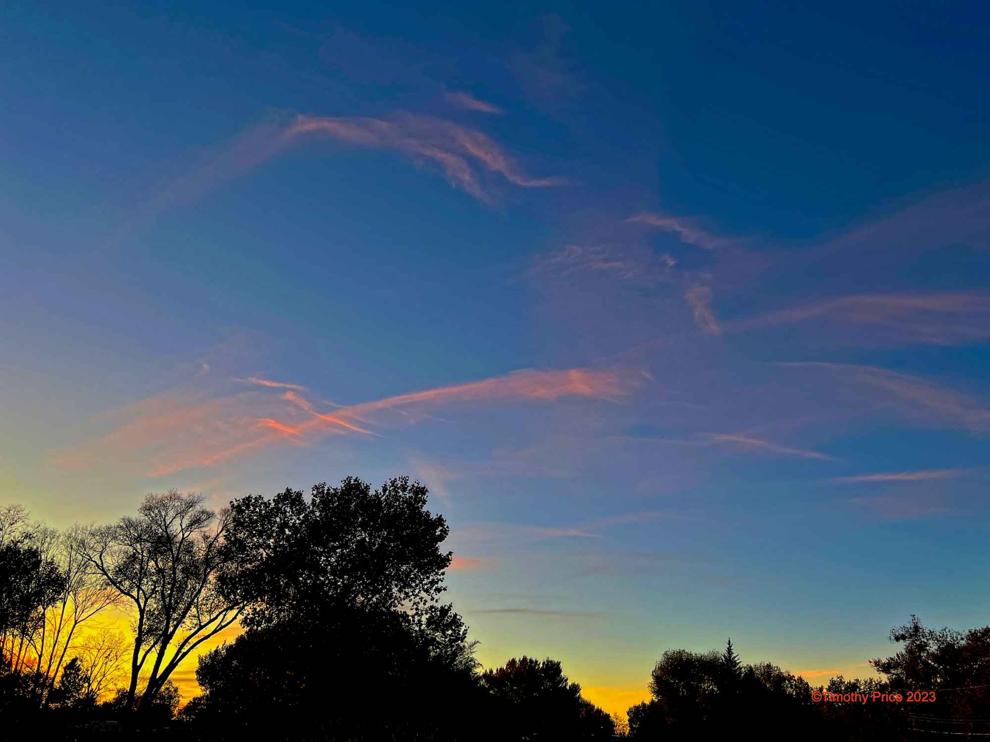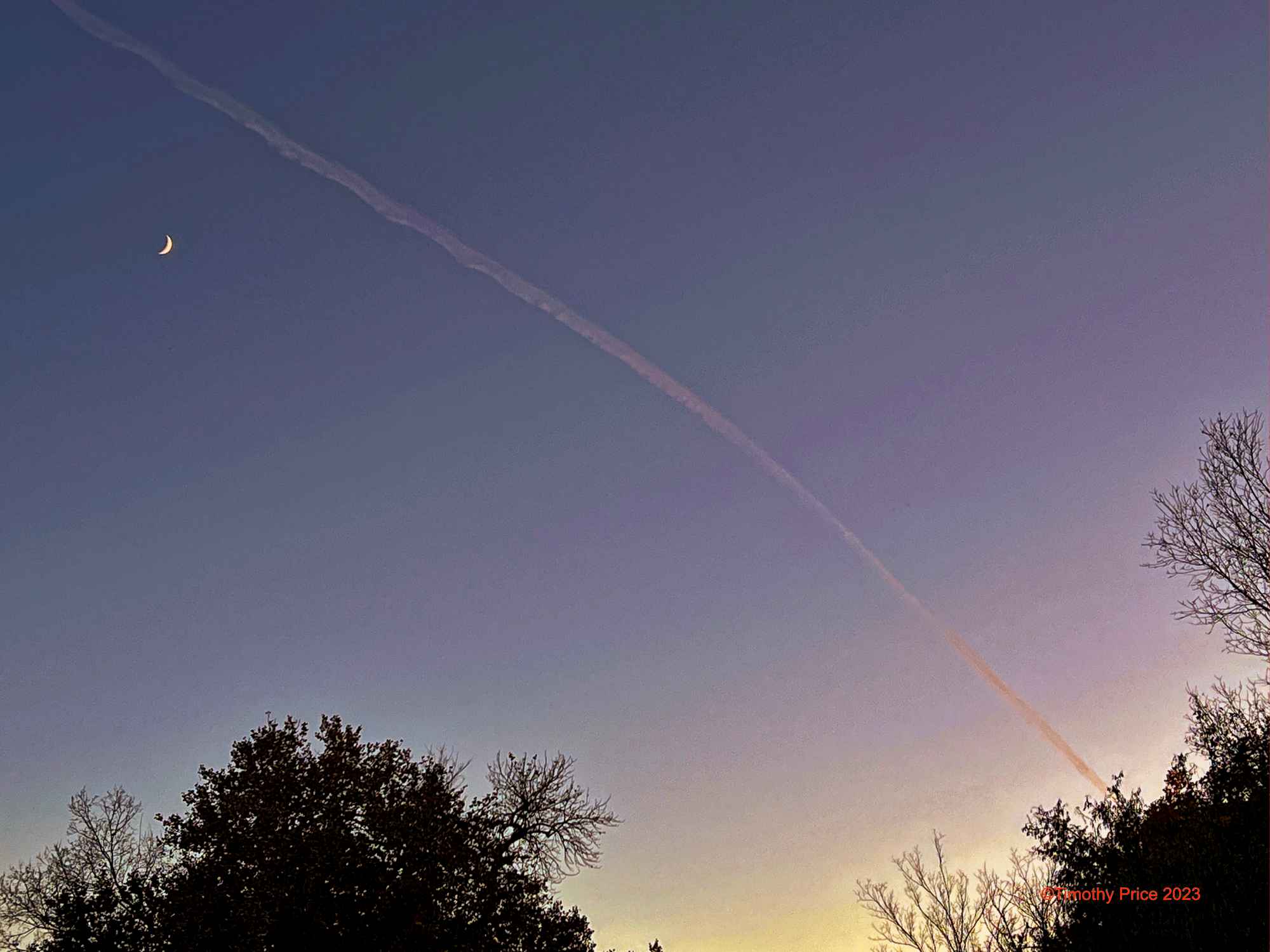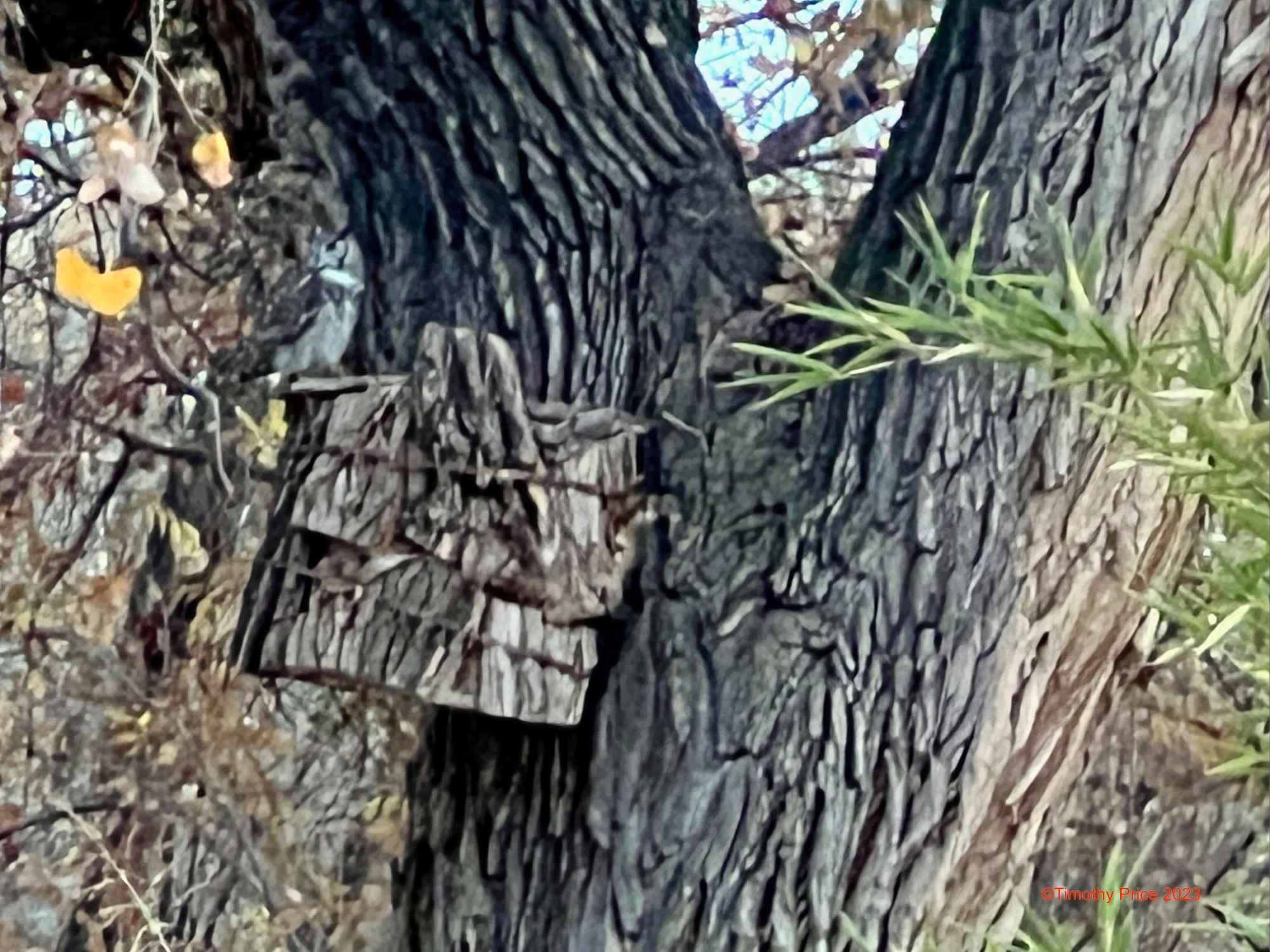 While I was photographing the moon and contrail, I heard an owl hooting close by. I investigated further and there was an owl perched on the edge of the nest I hung in Susan’s tree in August 2022. Hooteluja! Hooteluja! Hooooteluuuja!