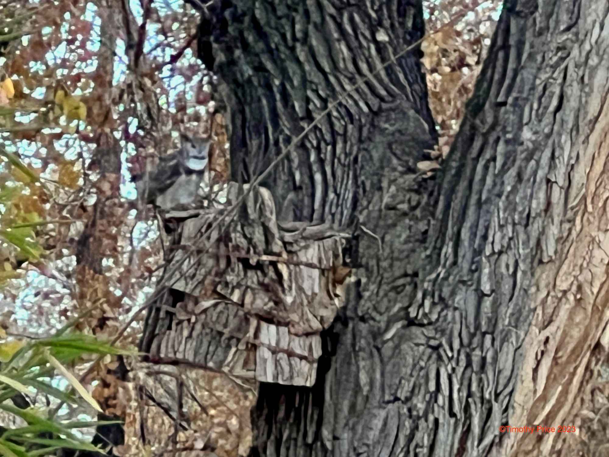 It was dark, and I had to use 15x digital zoom on my phone’s camera, so I couldn’t tell if it was daddy owl. It could be one for the owlets from a few years ago out house shopping. Whichever owl it is, it’s a good sign to see an owl perched on the edge of the nest.
