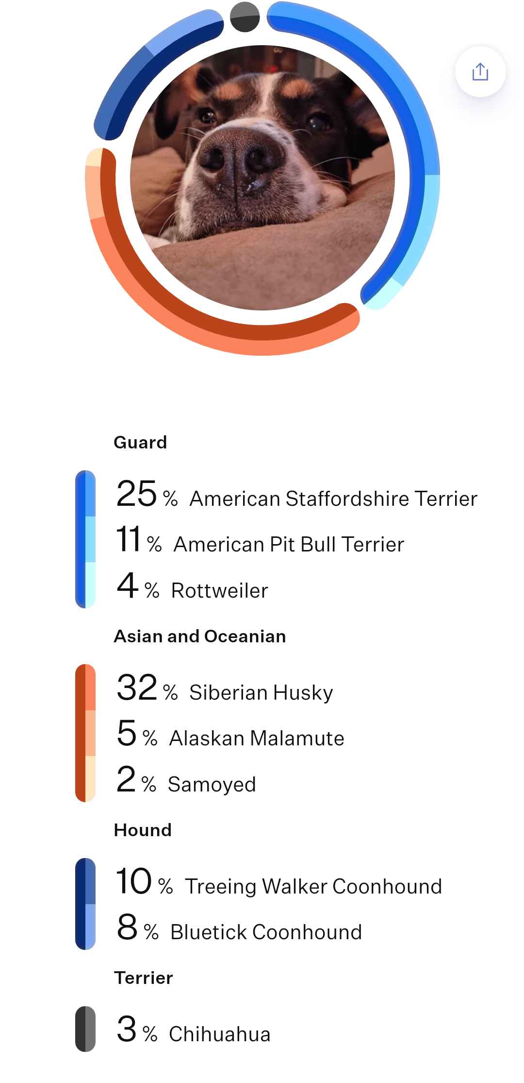 I wonder if the pet DNA tests have as many “missing markers” as the human ones. Knowing my grandfather was half Cherokee, I was confused that my results didn’t show any Native American. Then I found the small print — they don’t even try to detect it. I’m told Asian heritage has problems too, usually showing as simply “China”.