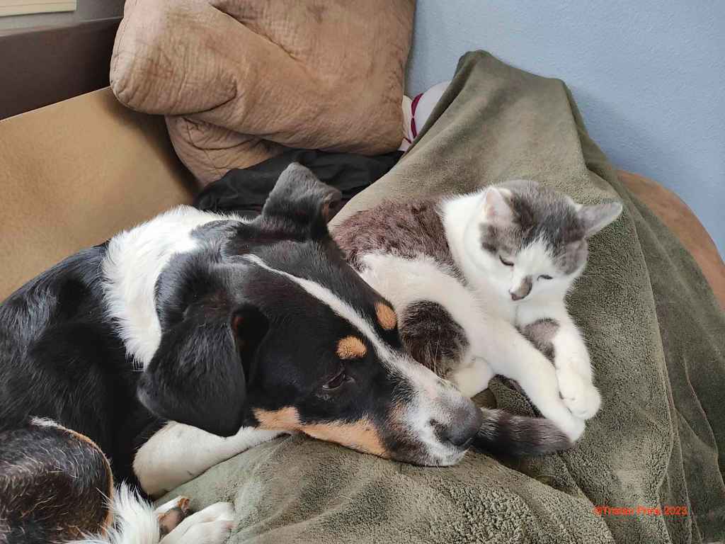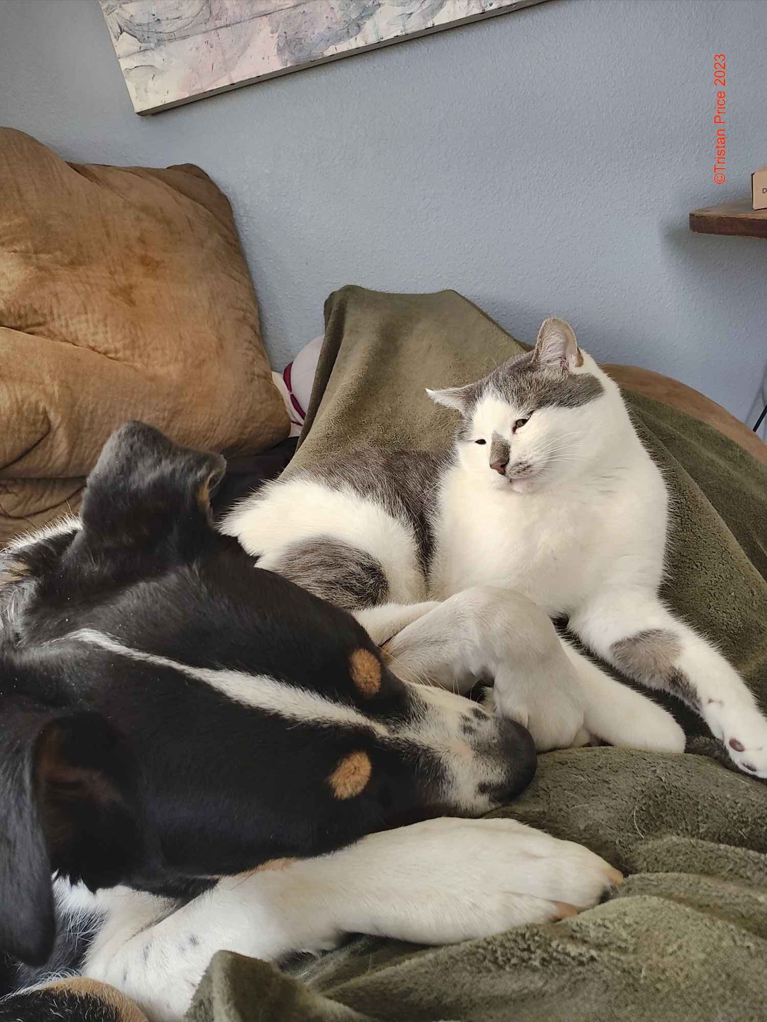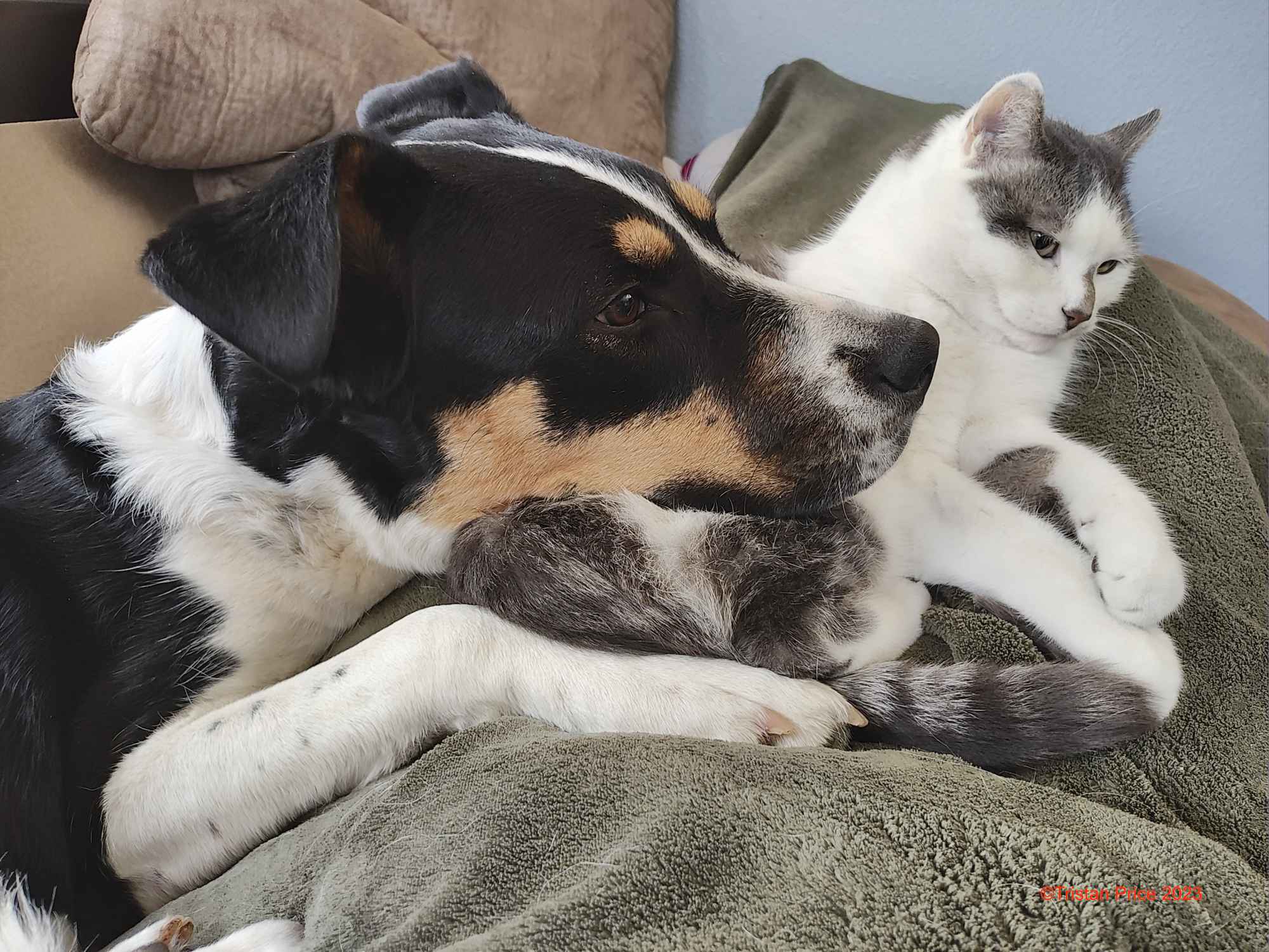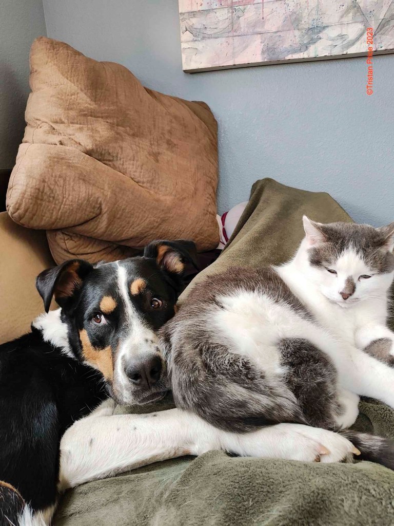 Freyja was dogging Atlas. When Tristan and Craig got Freyja, the shelter identified her as a Bernese Mountain dog. As she grew, she looked less and less like a Bernese Mountain Dog. Tristan had a doggie DNA test done on Freya, and she “Ain’t nothing but a hound dog!” †