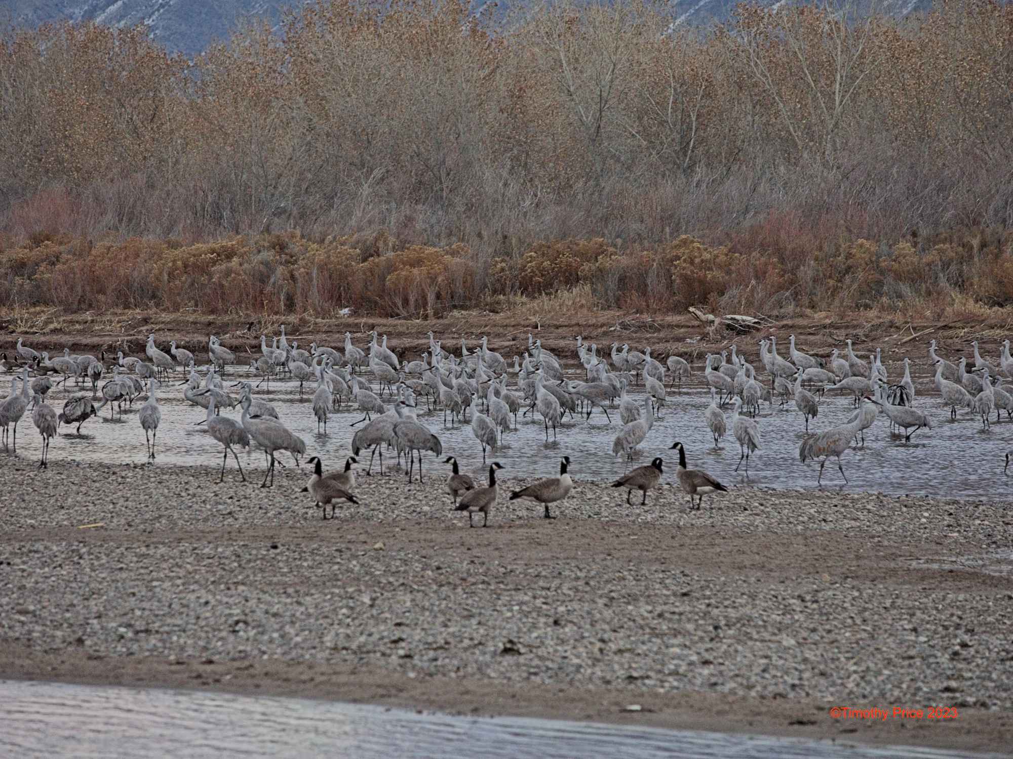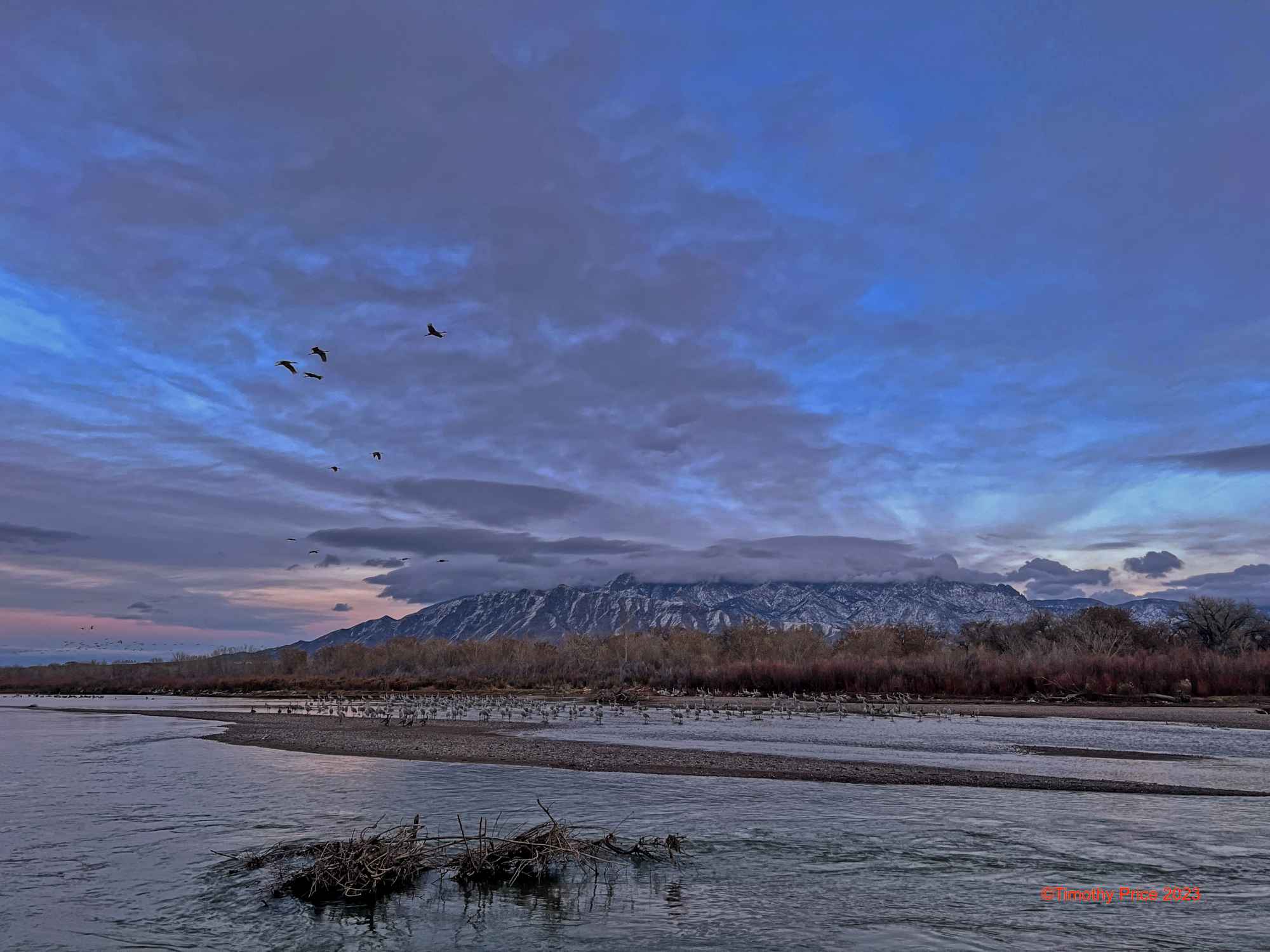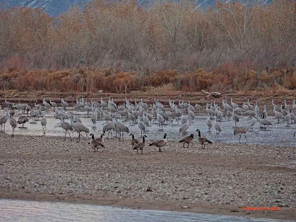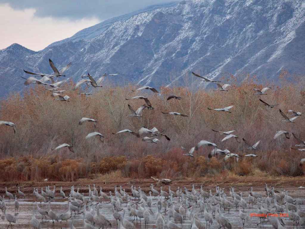 • Thousands of cranes winter in Bosque del Apache 100 miles south of us. A few hundred of the smarter cranes stay up with us where they don’t have lots to eat in the fields and orchards and not so much competition. Thanks, Brian.