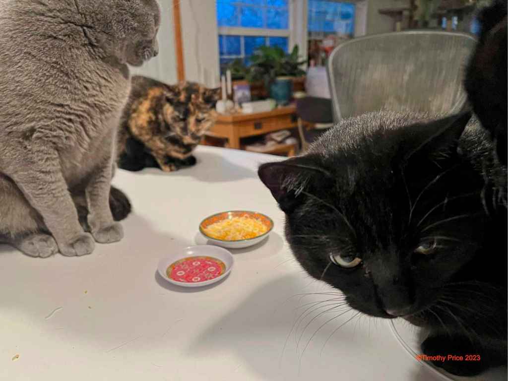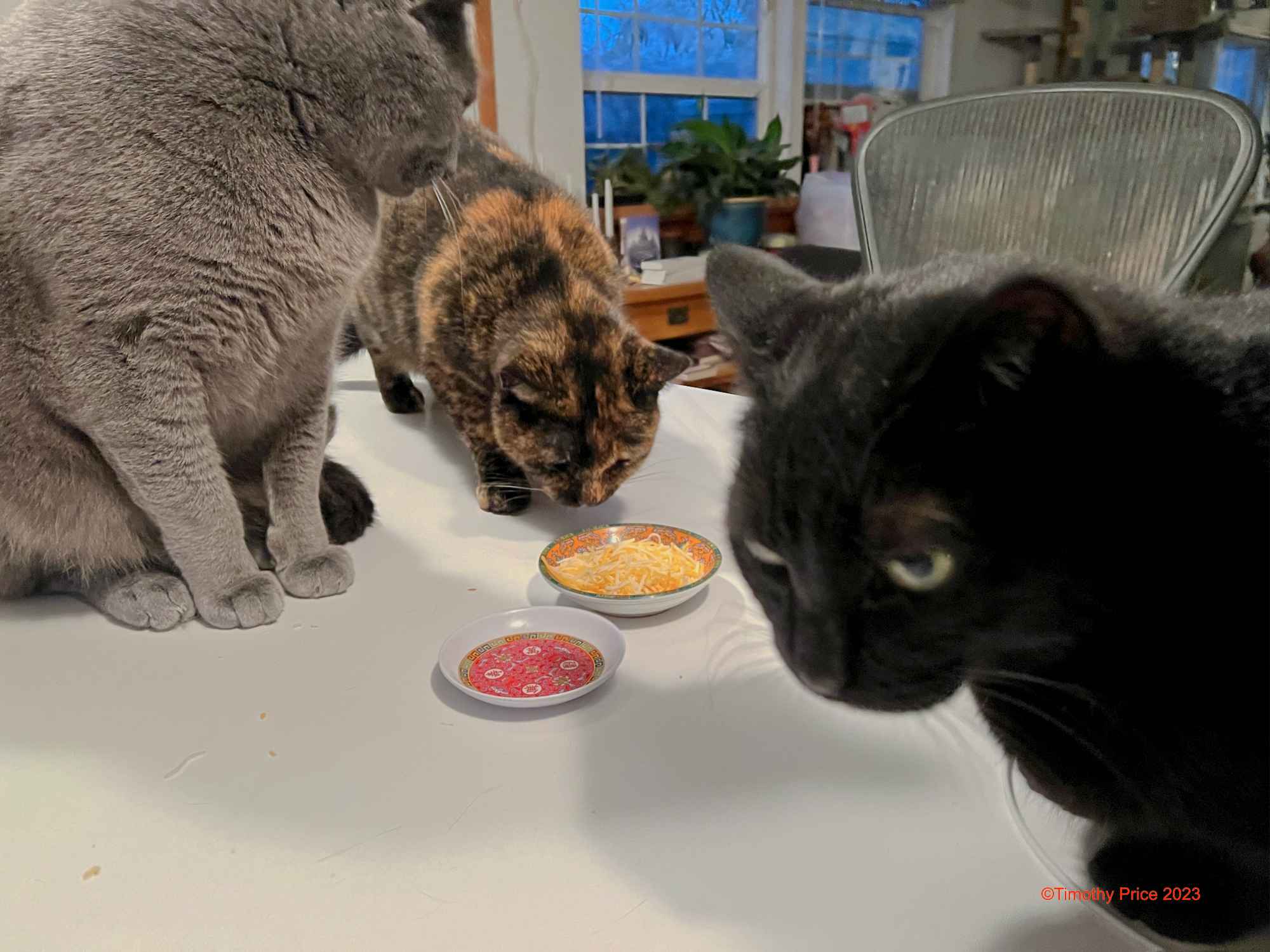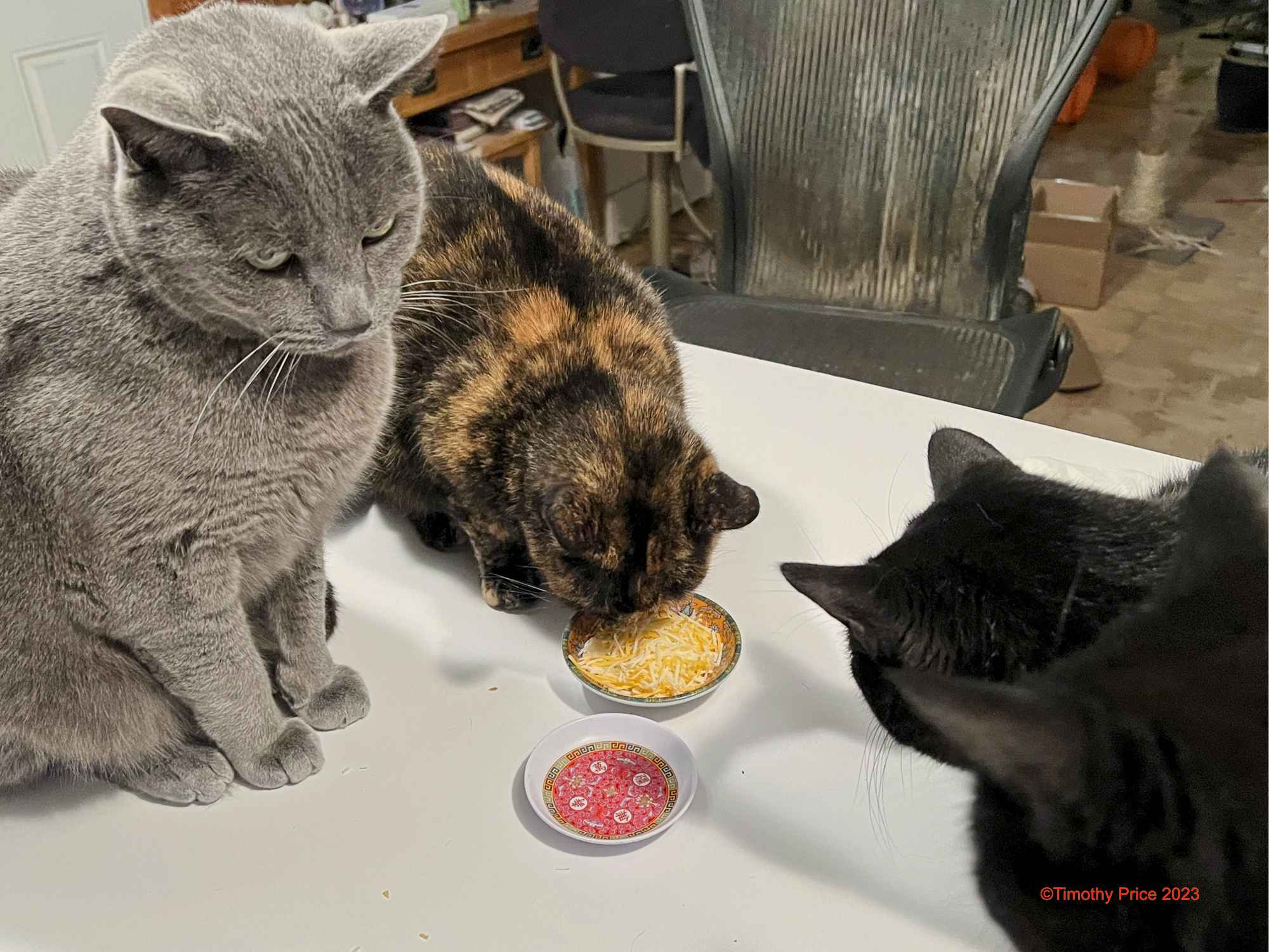 • Silver with simply butt in to get the cheese once he decides he’s ready to eat it. The cheese has to be just the right temperature before Silver will eat it. Thanks, Brian.