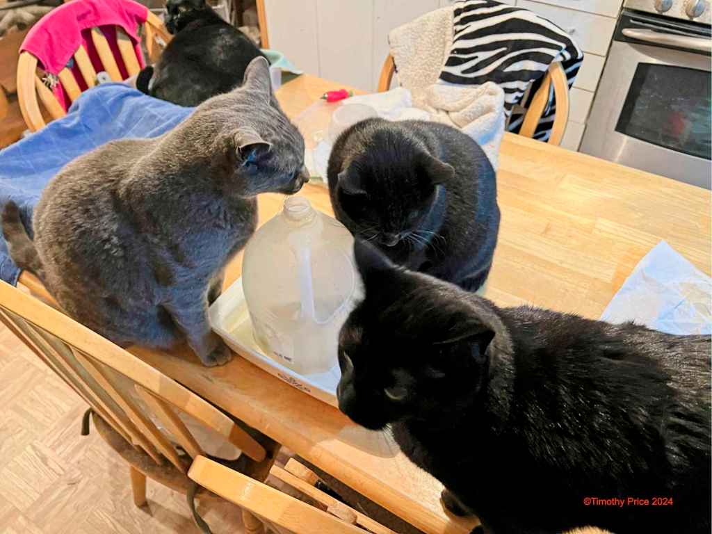 Friday mornings are the same as any morning with coffee brewing, my morning concoction dissolving in a glass of water on the counter, waiting for the vinegar. And, of course, the cats were wanting me to top off their jug.