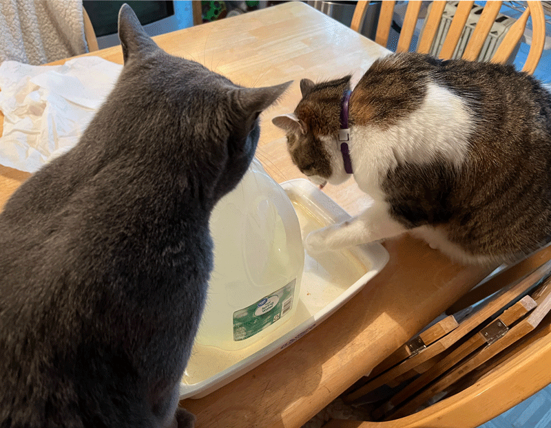 Spunk likes to paw the water while the other cats jug.