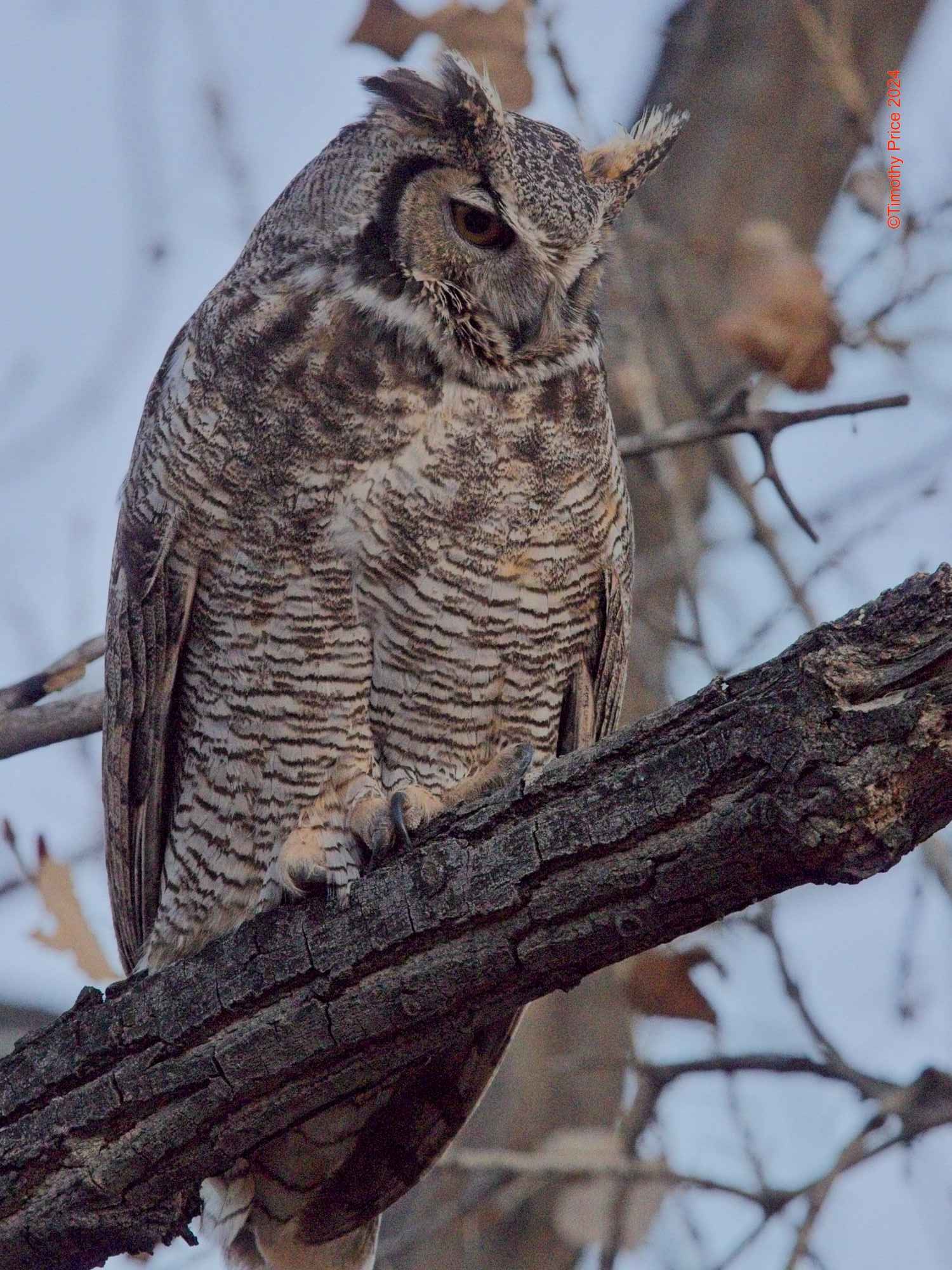 Osric Owl watching a couple wth three dogs walking under his perch. He was only 10 feet above them.